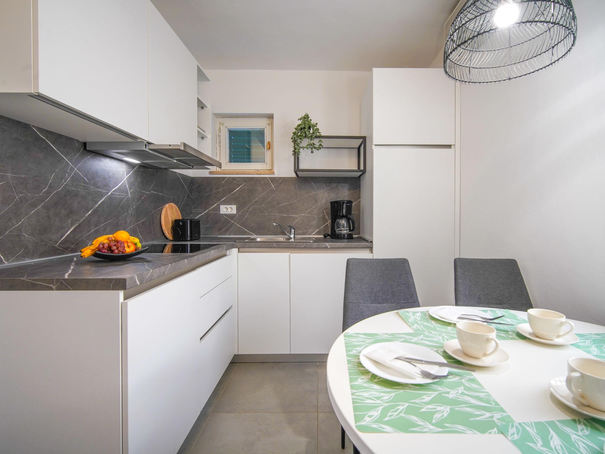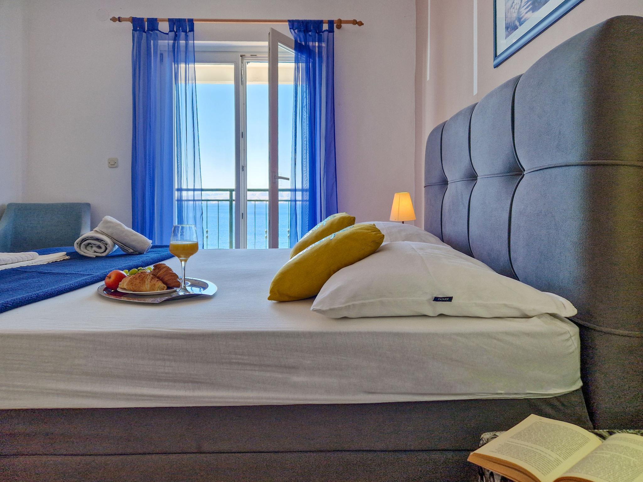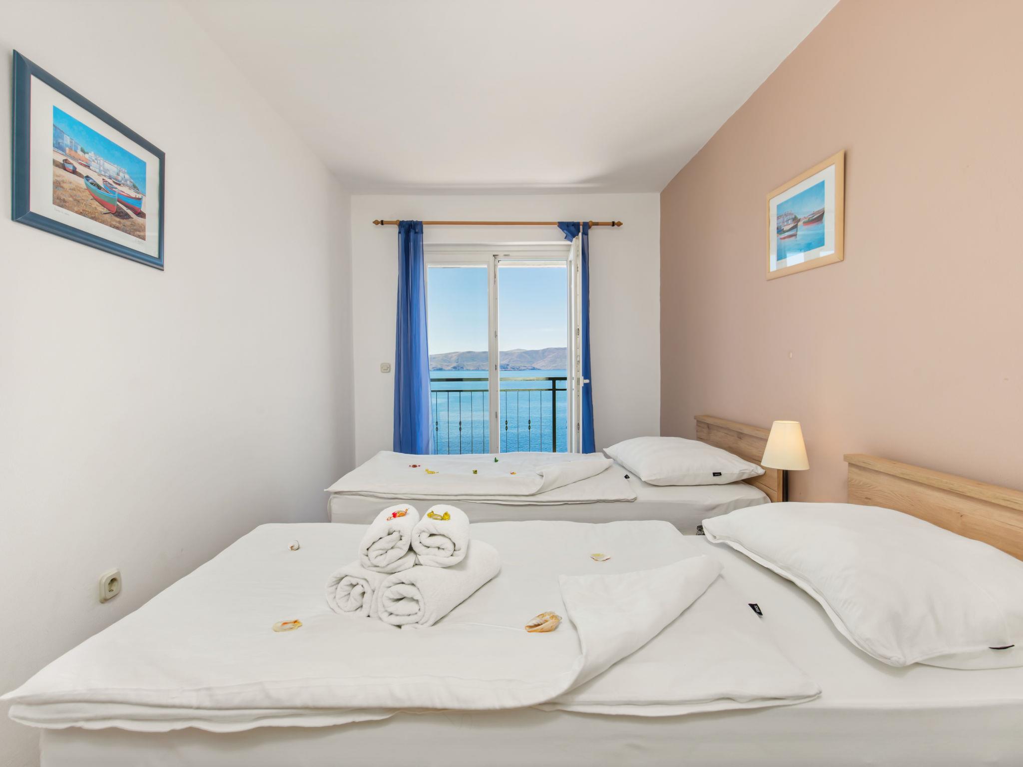 "Marina", 2-Zimmer-Wohnung 42 m2 im 1. Stock. 1 Zimmer mit 2 Betten (90 cm, Länge 200 cm). Ausgang zum Balkon. 1 Zimmer mit 1 franz. Bett (160 cm, Länge 200 cm). Ausgang zum Balkon. Wohnküche (2 Kochplatten, Toaster, Mikrowelle, Tiefkühler, elektrische Kaffeemaschine) mit Esstisch, Sat-TV und Klimaanlage. Dusche/WC. Keine Heizmöglichkeit. Balkon. Balkonmöbel. Sicht auf das Meer. Zur Verfügung: Internet (Wireless LAN, gratis). Bitte beachten: Nichtraucher-Haus. Maximal 1 Haustier/Hund erlaubt.