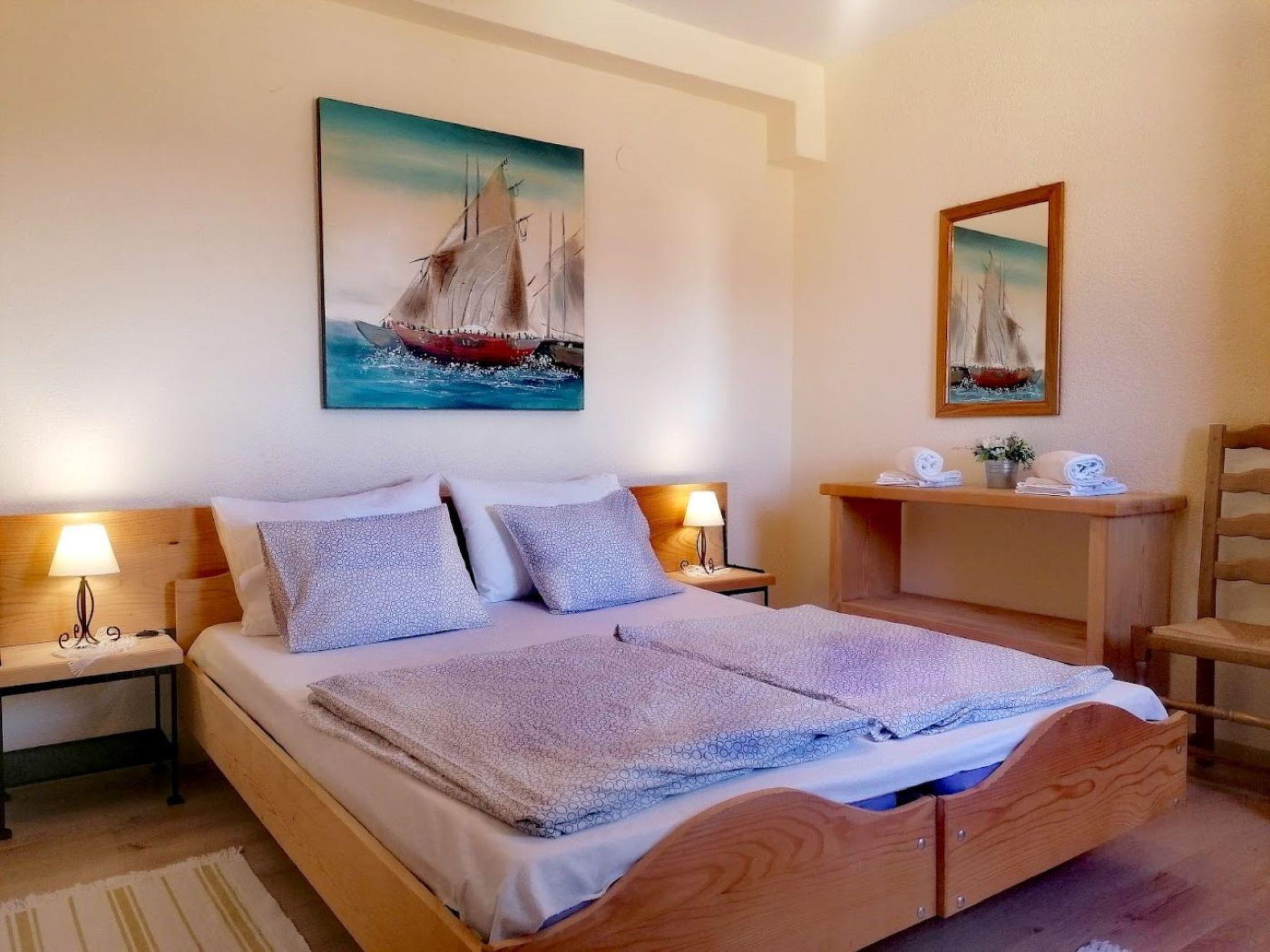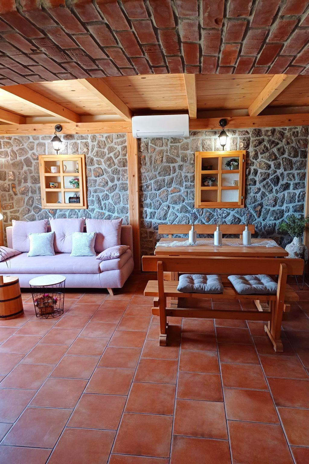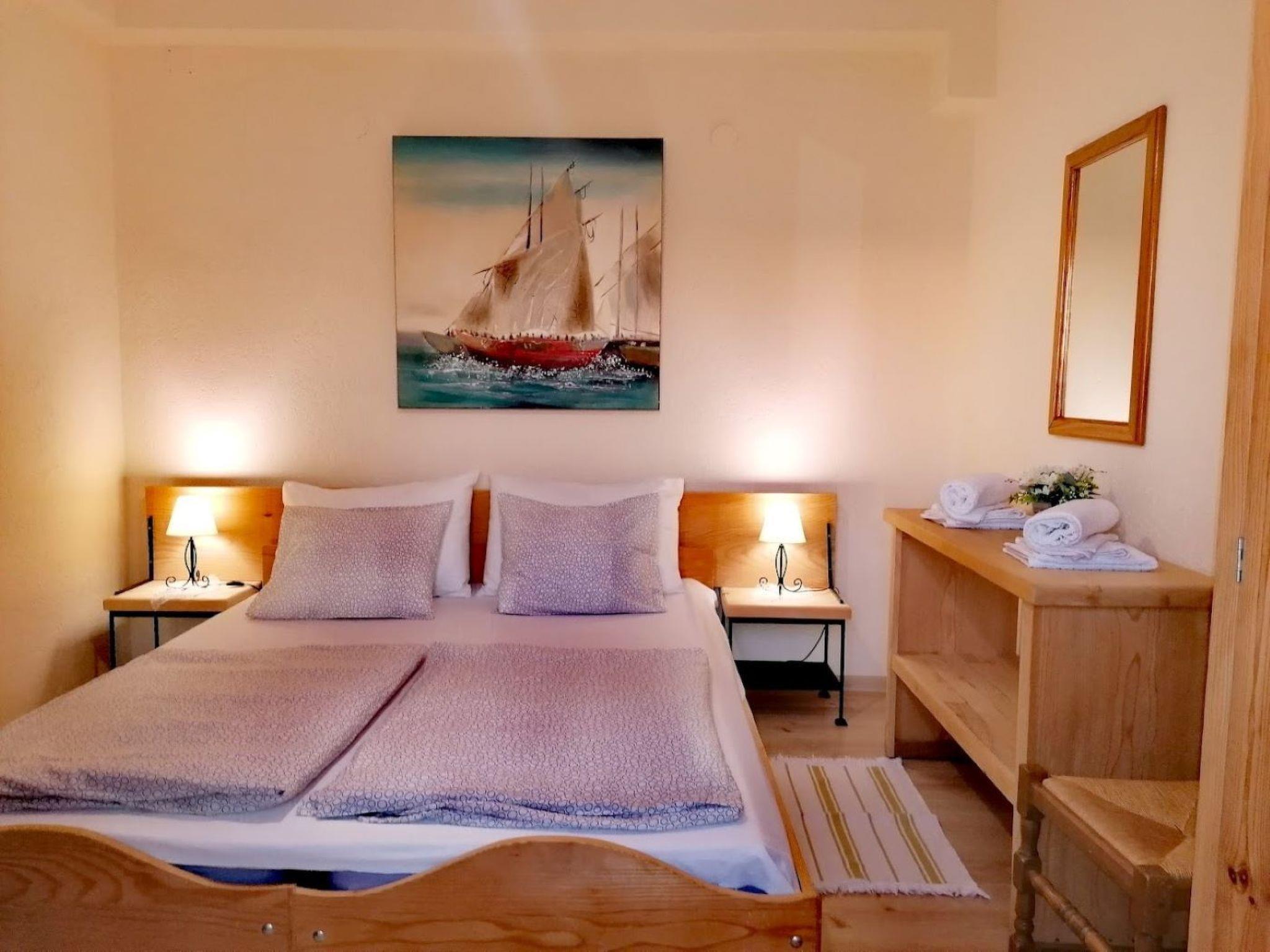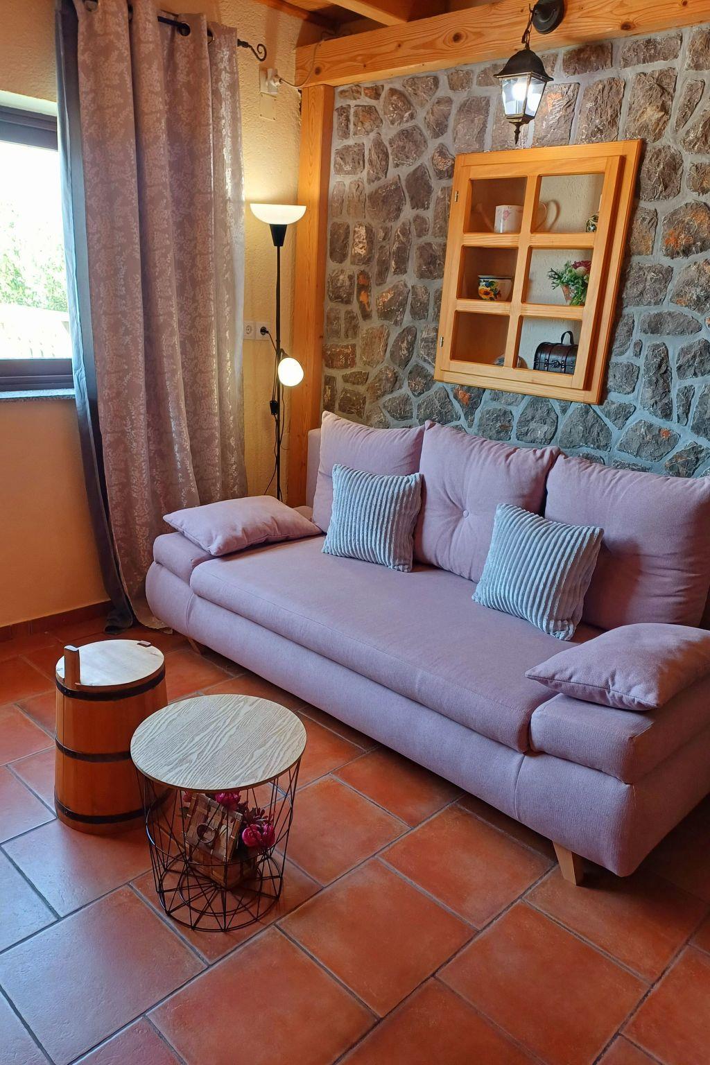 Die Wohnung befindet sich im Erdgeschoss des Hauses. Sie ist ca. 55 m² groß und bietet Platz für vier Personen. Das Wohn-/Esszimmer ist mit einem Schlafsofa für zwei Personen und einem Flachbild-Fernseher eingerichtet. Der Essbereich ist mit einem Holztisch und zwei passenden Sitzbänken rustikal gestaltet, was perfekt mit dem Sichtmauerwerk und der Holzbalkendecke harmoniert. Der angrenzende Kochbereich besitzt einen gemauerten Küchentresen, ebenfalls Sichtmauerwerk, und ist mit Induktionsherd, Kühlschrank, Mikrowelle und Wasserkocher ausgestattet. Das gemütliche Schlafzimmer verfügt über ein 160 cm breites Doppelbett und einen Kleiderschrank. Die Wohnung hat ein Badezimmer, welches mit Dusche, WC und Waschbecken ausgestattet ist. Auch ein WLAN-Anschluss ist vorhanden. Die Klimaanalge befindet sich im Wohnraum und ist so positioniert, dass sie die gesamte Wohnung kühl halten kann.