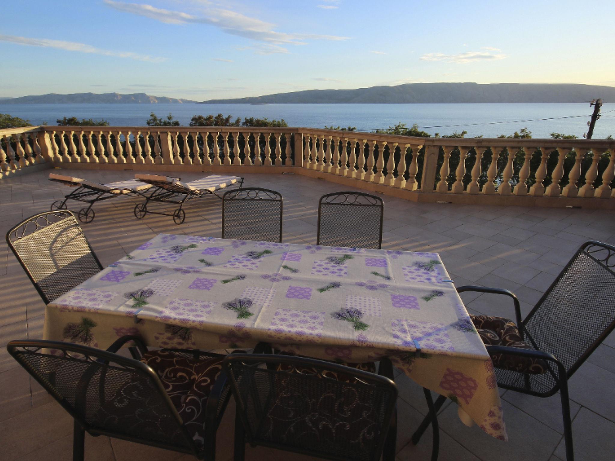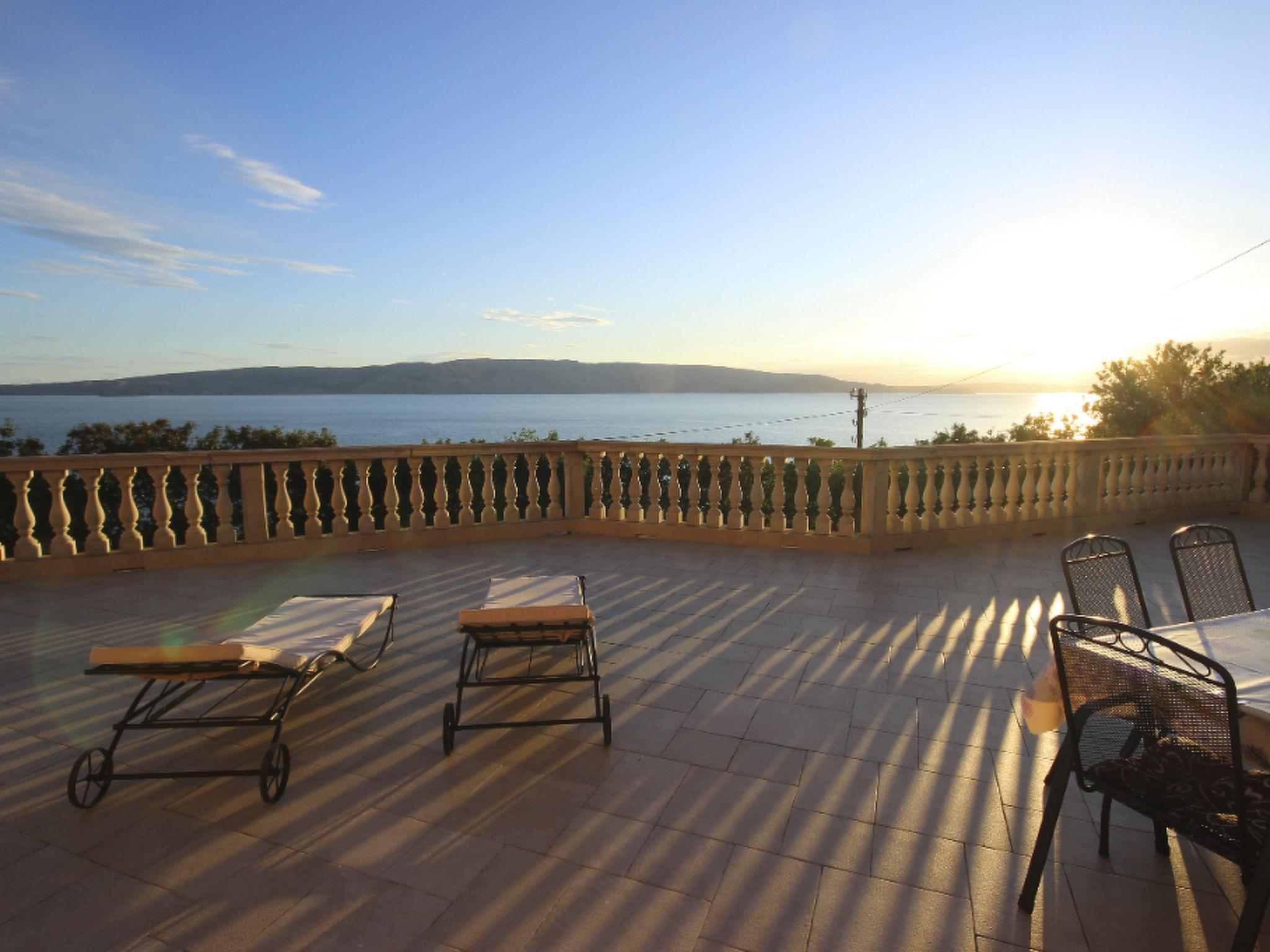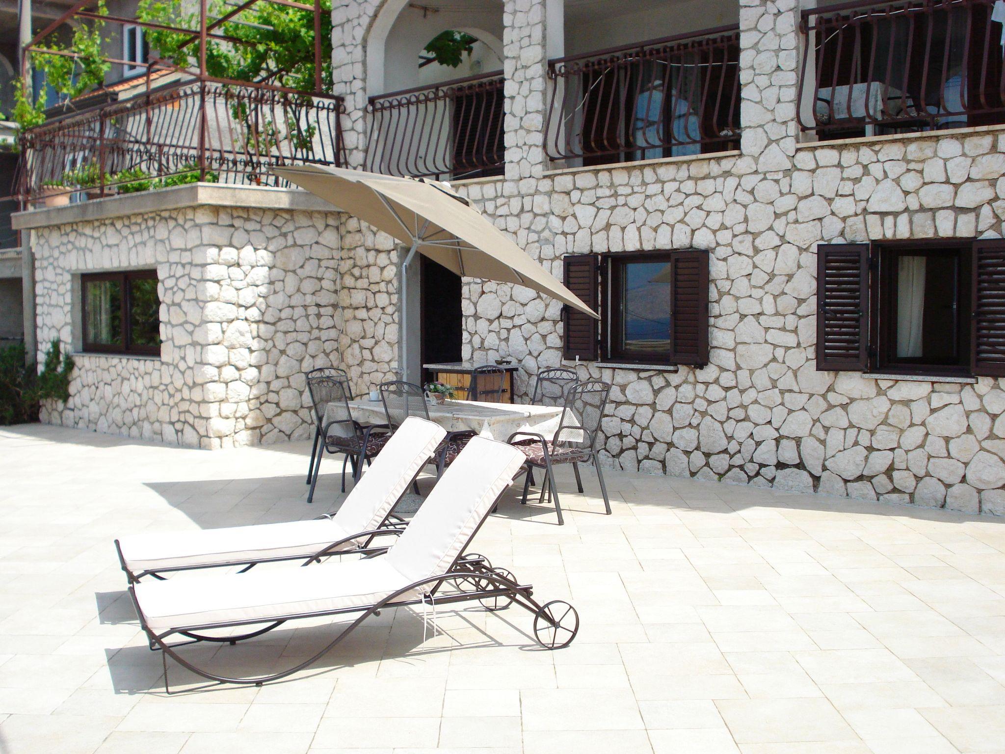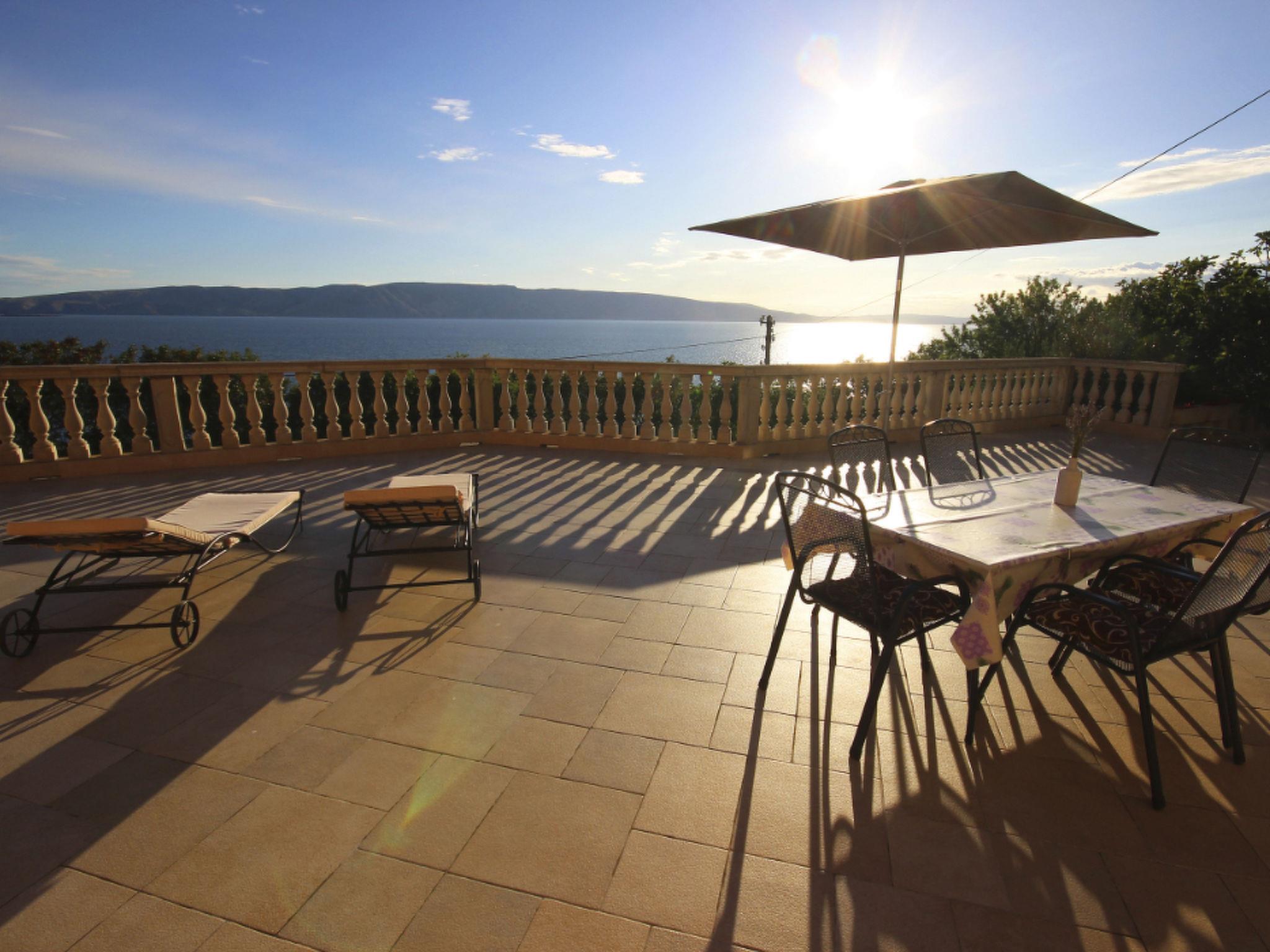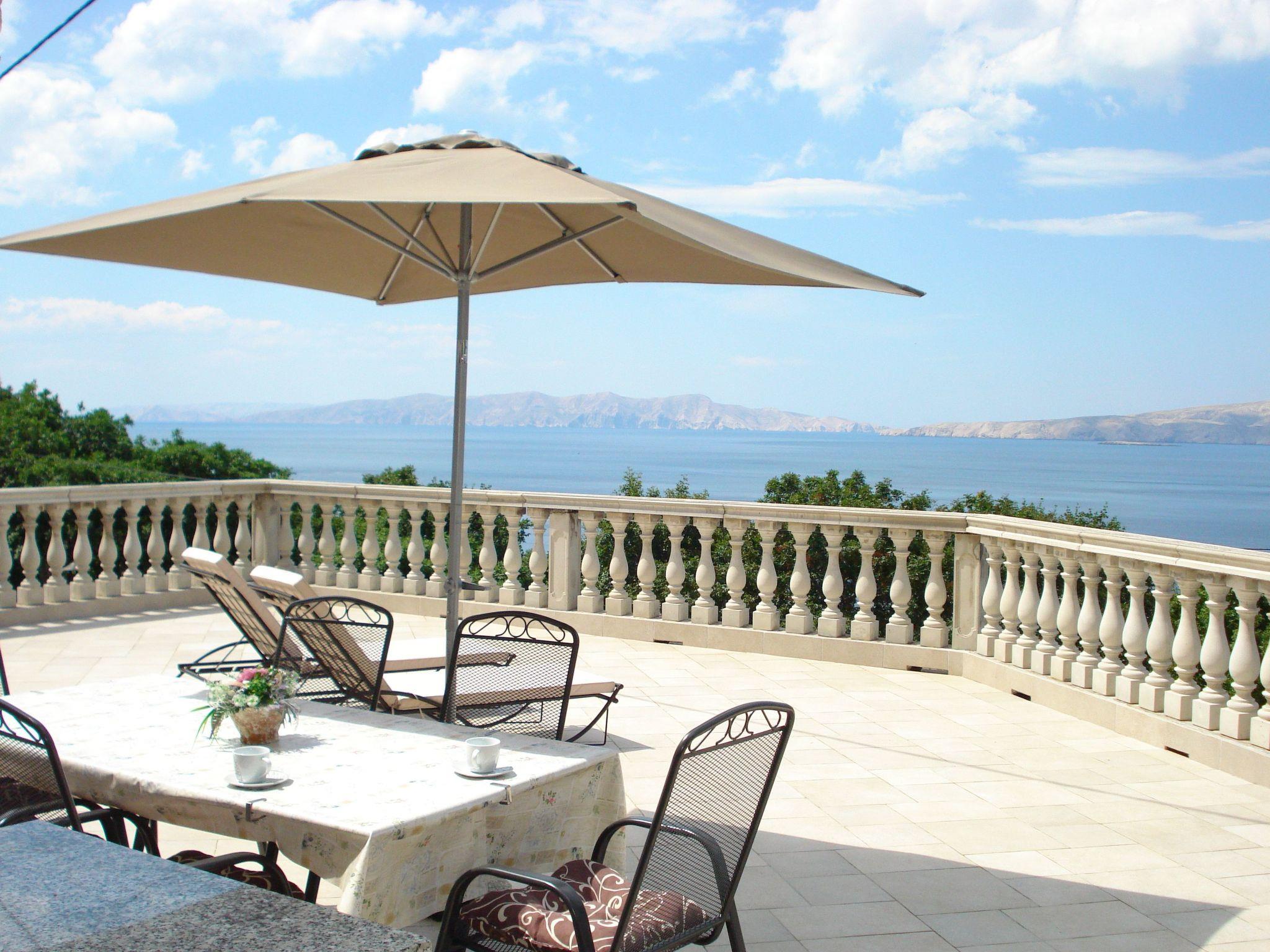 Die Terrasse dieser Wohnung ist mit 100 m² sehr groß und bietet einen atemberaubenden Ausblick. Möbliert ist sie mit einer Sitzgruppe aus Holz bestehend aus einem Tisch und zwei Sitzbänken. Ein großer Sonnenschirm spendet Schatten. Außerdem gibt es dort einen Gasgrill und zwei Liegestühle.