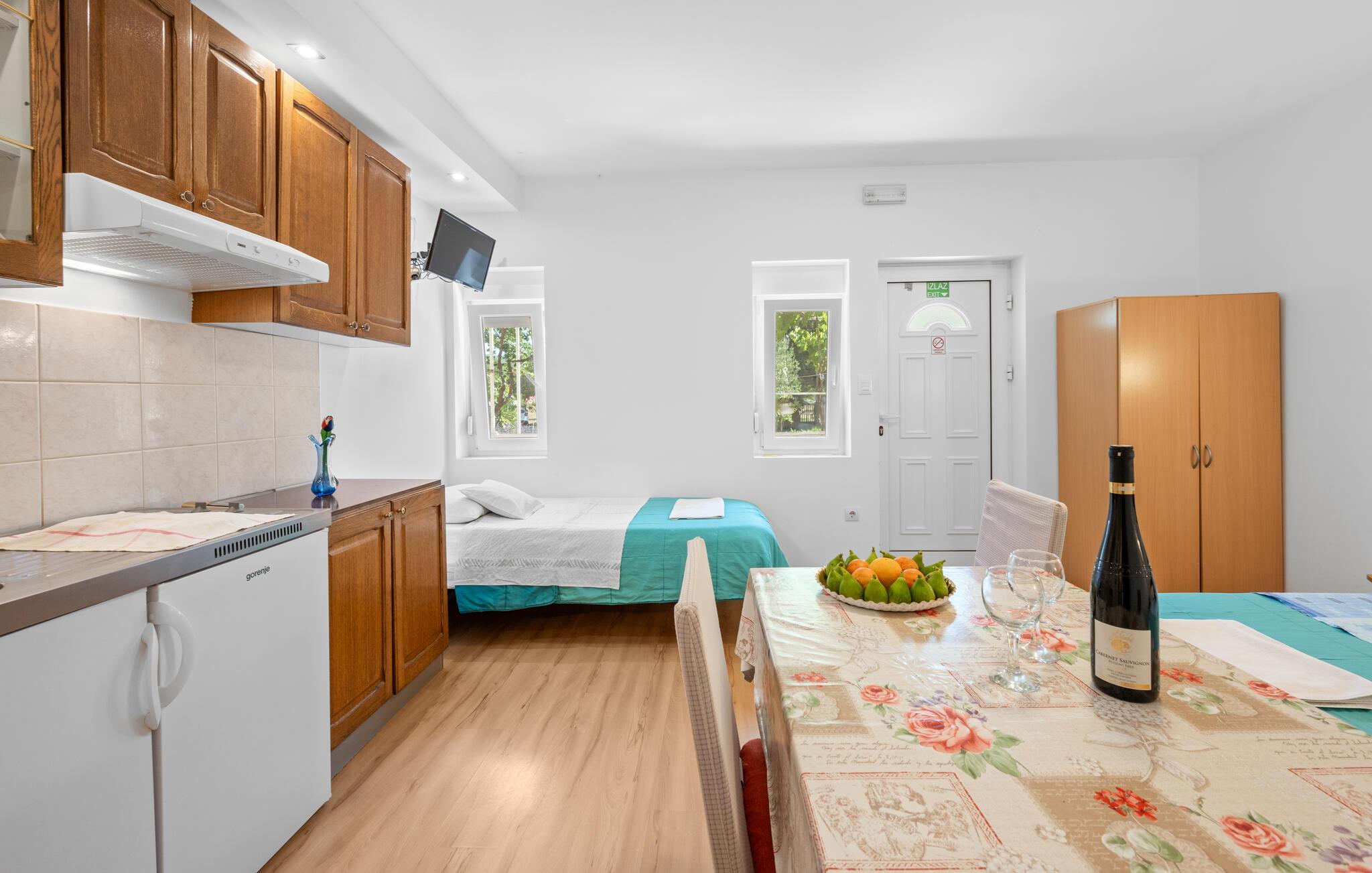Die ruhige Lage der kleinen Ferienwohnung lädt zum Entspannen ein. Das Apartment ist funktional eingerichtet und kombiniert Wohnen, Kochen, Essen und Schlafen in einem Raum, was für eine heimelige Atmosphäre sorgt. Die gut ausgestattete Küche bietet alle Annehmlichkeiten, um gemeinsam Mahlzeiten zuzubereiten.
