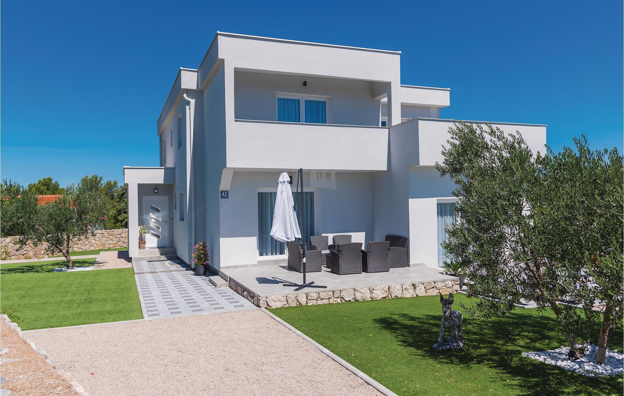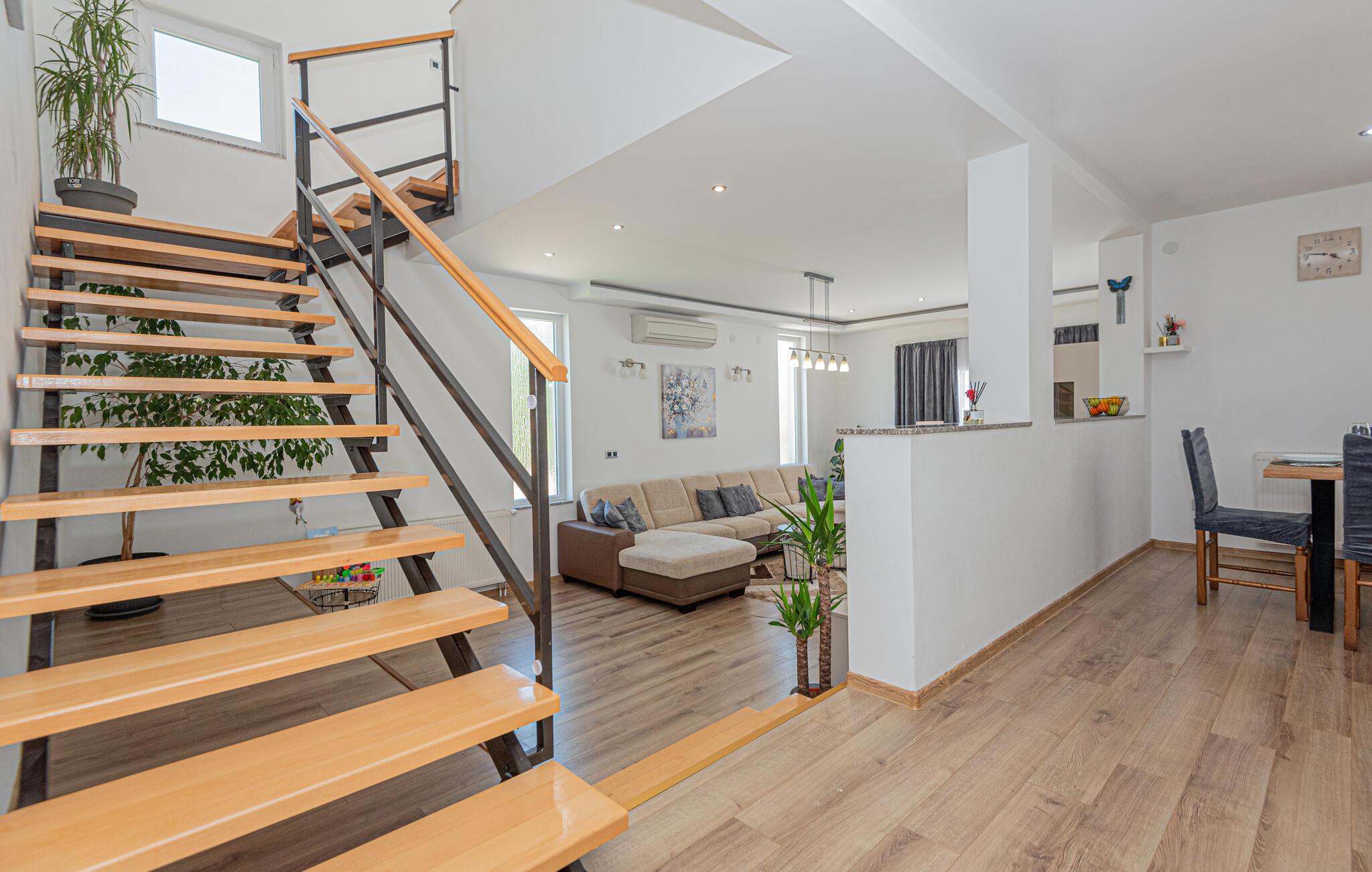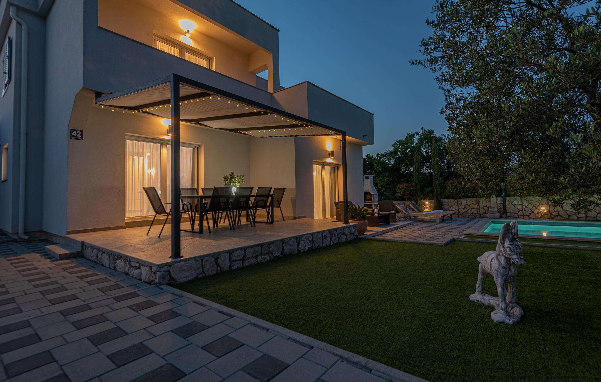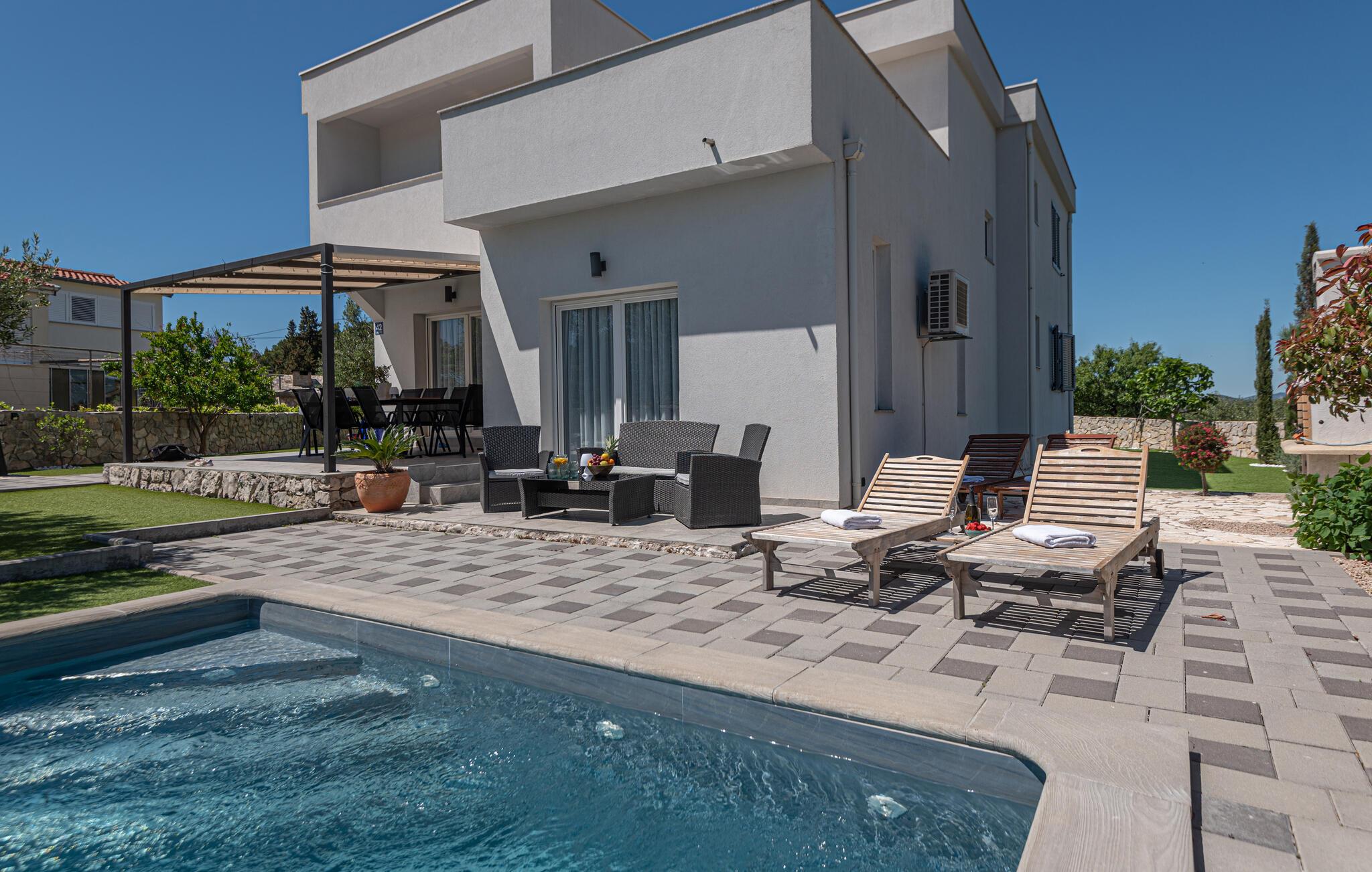 Dieses schöne und mit Geschmack eingerichtete Ferienhaus mit eigenem Pool liegt in dem ruhigen Touristenort Zaton, in der Nähe von Šibenik. Es erstreckt sich auf zwei durch eine interne Treppe verbundenen Etagen. Ein paar Stufen führen zum Wohnbereich hinab. Der lange Sandstrand des Ortes ist barrierefrei und somit auch für Menschen mit körperlichen Einschränkungen bestens geeignet. Direkt an den Strand grenzt ein kleiner Pinienwald an, der an heißen Sommertagen Abkühlung und Schatten in der Mittagshitze spendet. Interessante Ausflugsziele sind die Stadt Zadar, der benachbarte Ort Nin und die Nationalparks Krka, Kornati und Paklenica.