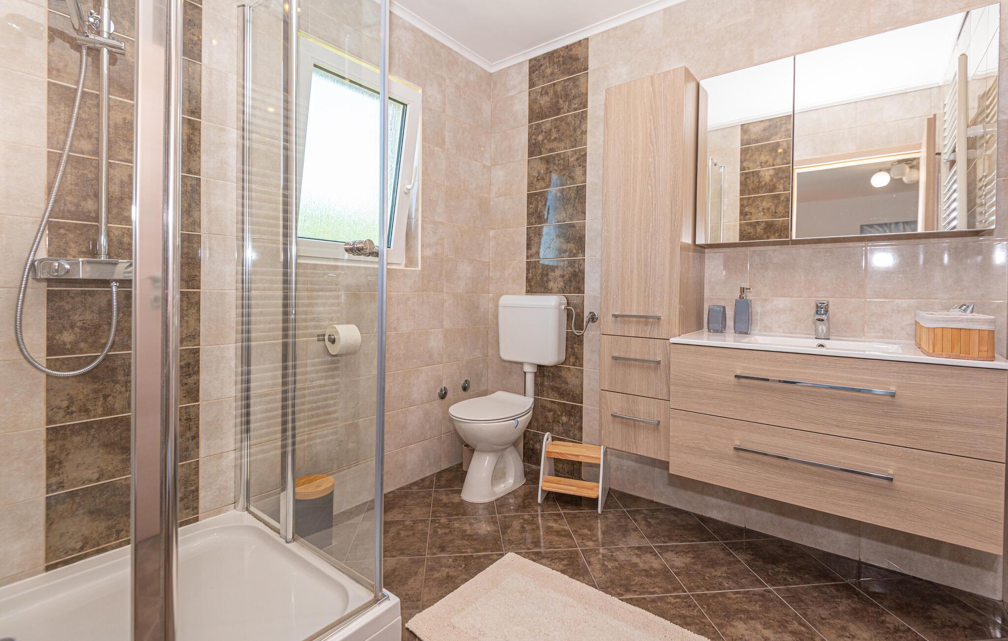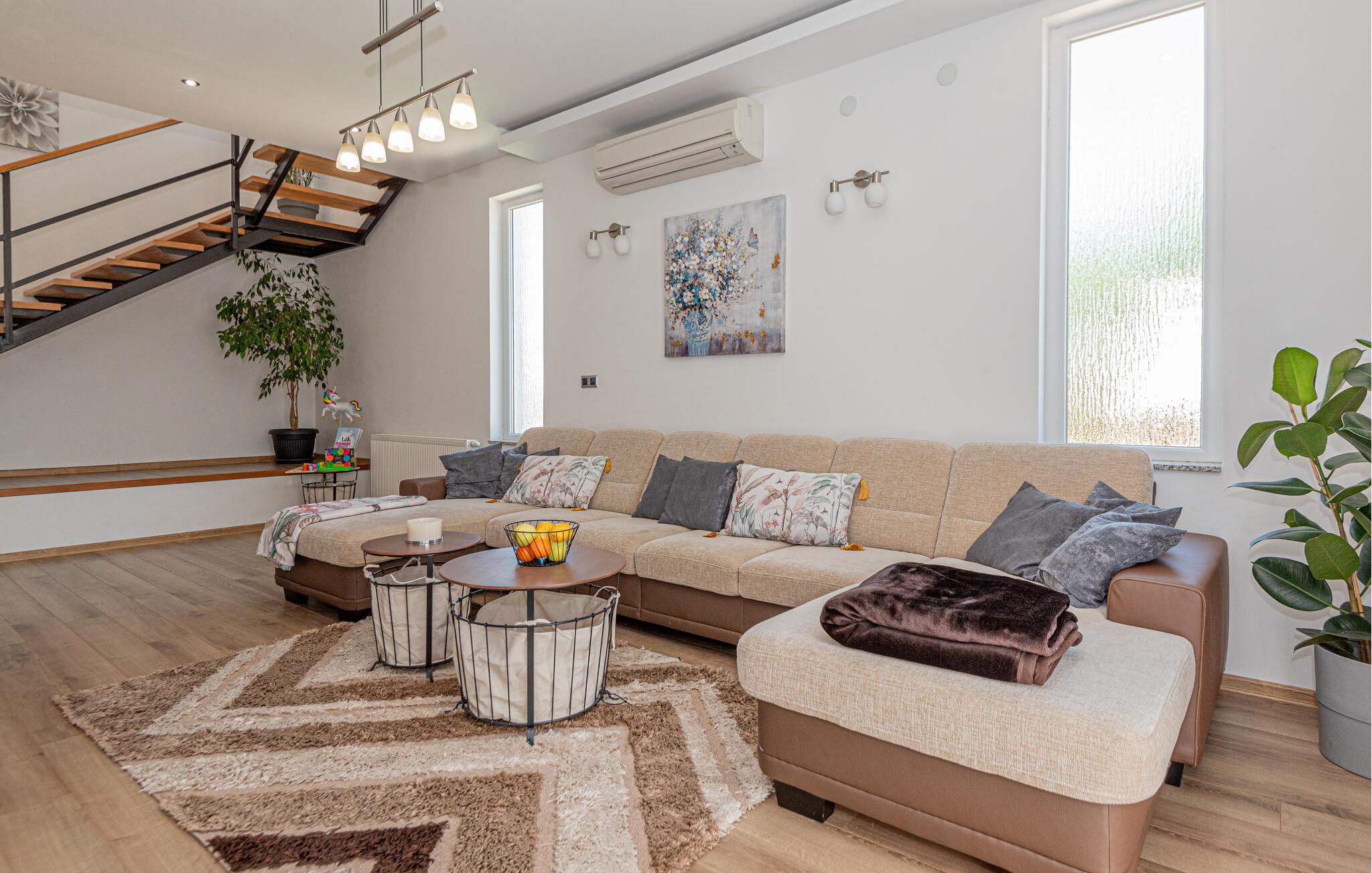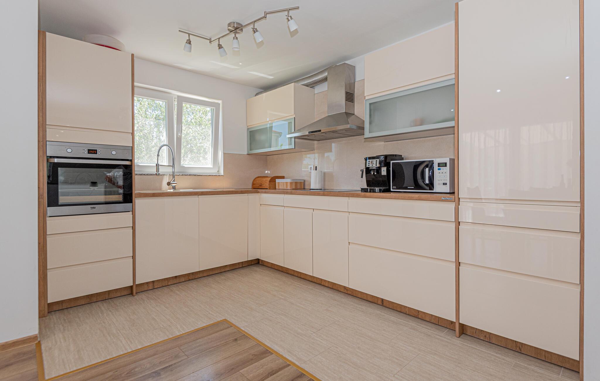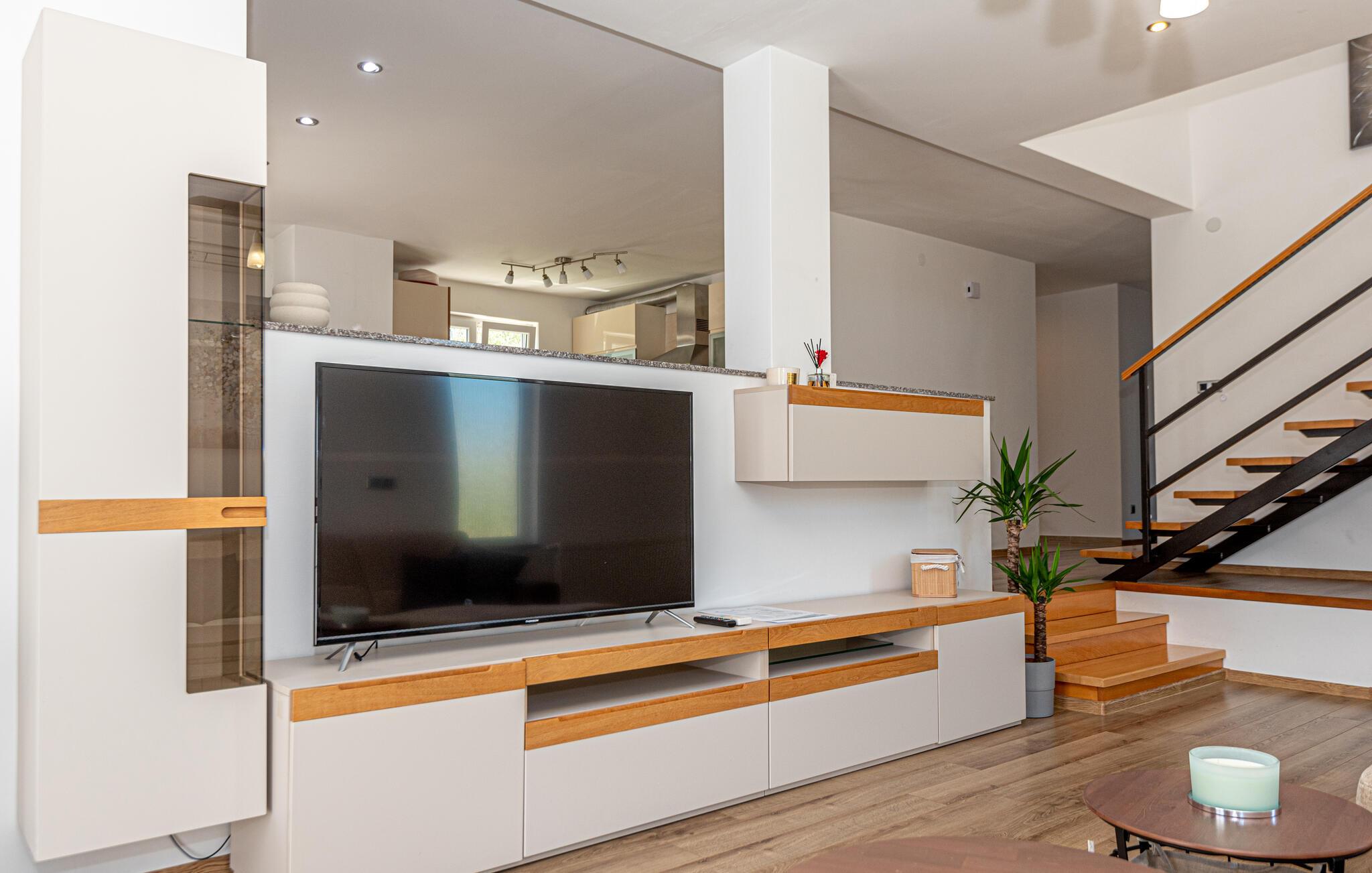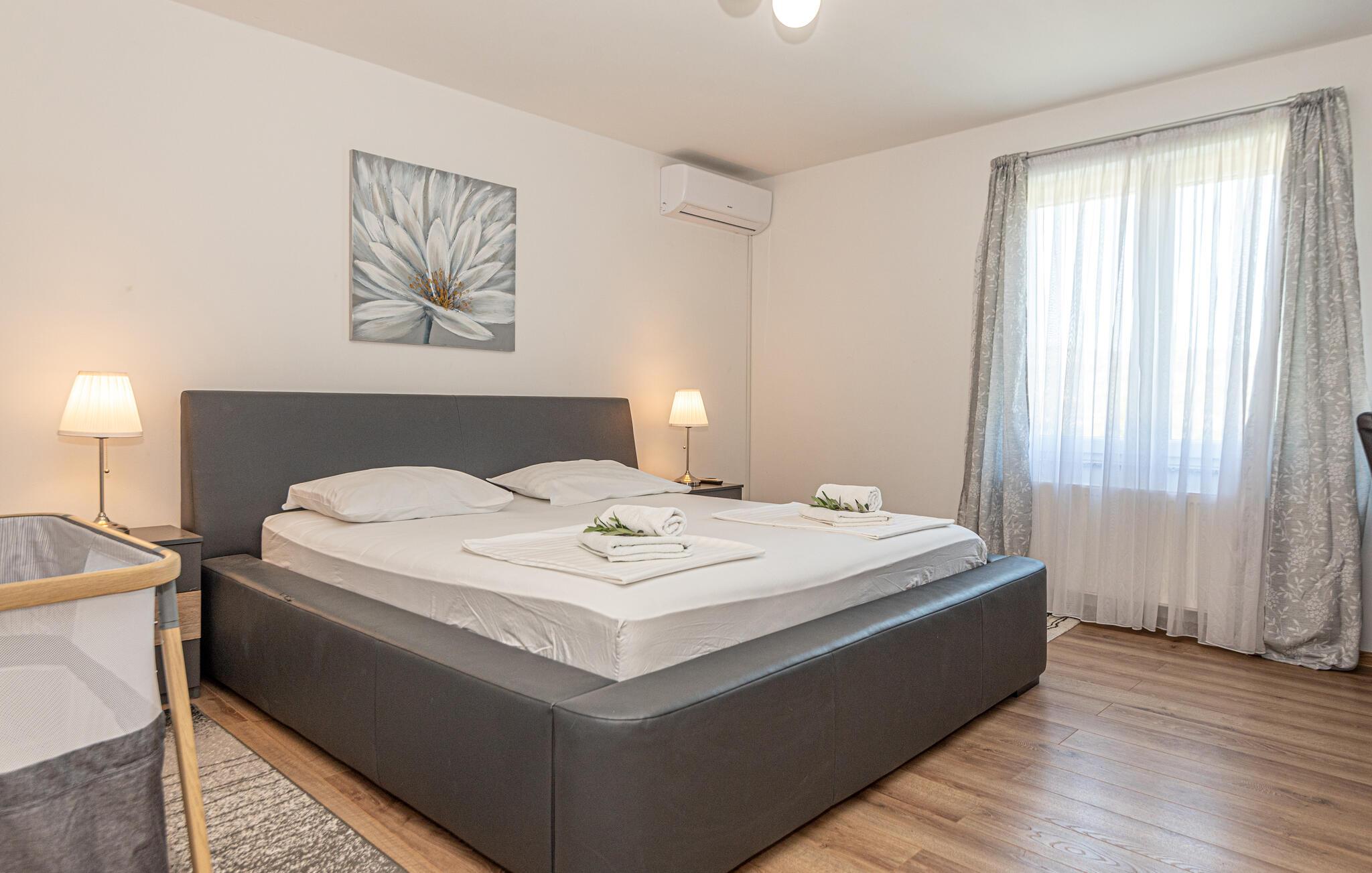 Dieses schöne und mit Geschmack eingerichtete Ferienhaus mit eigenem Pool liegt in dem ruhigen Touristenort Zaton, in der Nähe von Šibenik. Es erstreckt sich auf zwei durch eine interne Treppe verbundenen Etagen. Ein paar Stufen führen zum Wohnbereich hinab. Der lange Sandstrand des Ortes ist barrierefrei und somit auch für Menschen mit körperlichen Einschränkungen bestens geeignet. Direkt an den Strand grenzt ein kleiner Pinienwald an, der an heißen Sommertagen Abkühlung und Schatten in der Mittagshitze spendet. Interessante Ausflugsziele sind die Stadt Zadar, der benachbarte Ort Nin und die Nationalparks Krka, Kornati und Paklenica.