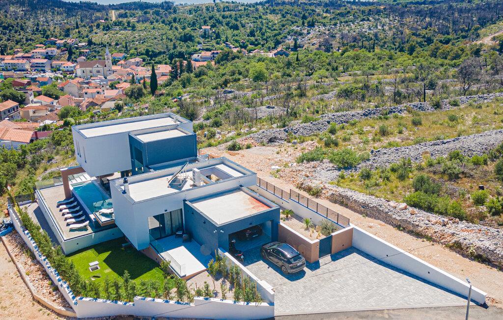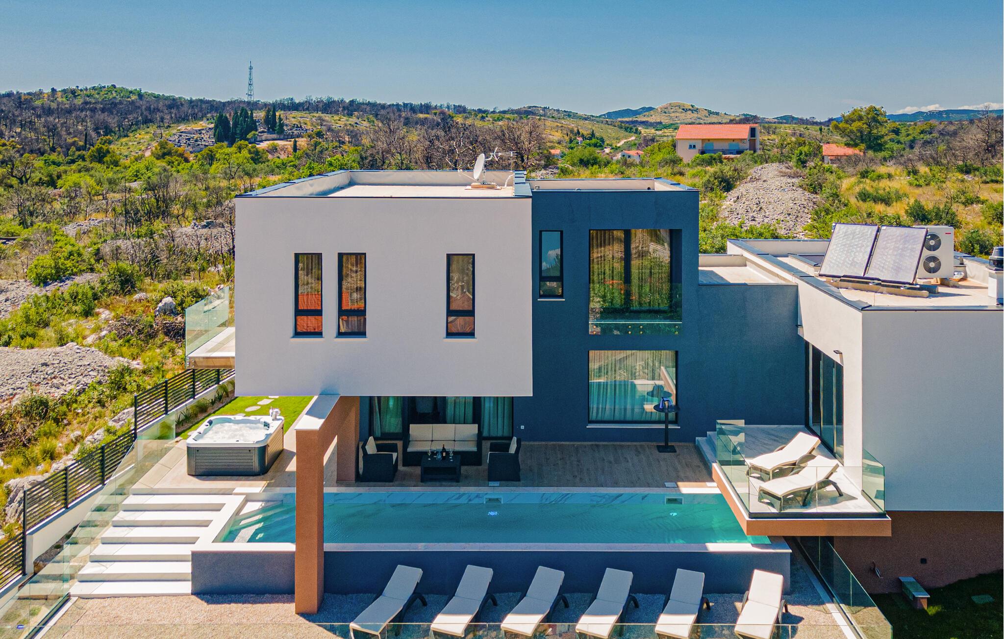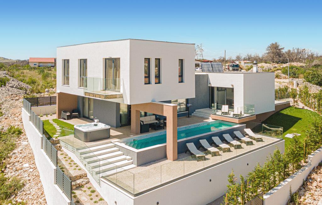 Erleben Sie einen luxuriösen Ferienhausurlaub in Zaton, wo moderne Eleganz auf pure Entspannung trifft. Diese exklusive Villa bietet alles, was Sie für einen unvergesslichen Aufenthalt benötigen. Der großzügige Außenbereich mit privatem Pool und Sonnenliegen lädt zum Entspannen ein. Beginnen Sie Ihren Tag mit einem erfrischenden Bad im Pool und entspannen Sie sich im Whirlpool, während Sie die herrliche Aussicht auf die umliegende Landschaft genießen.