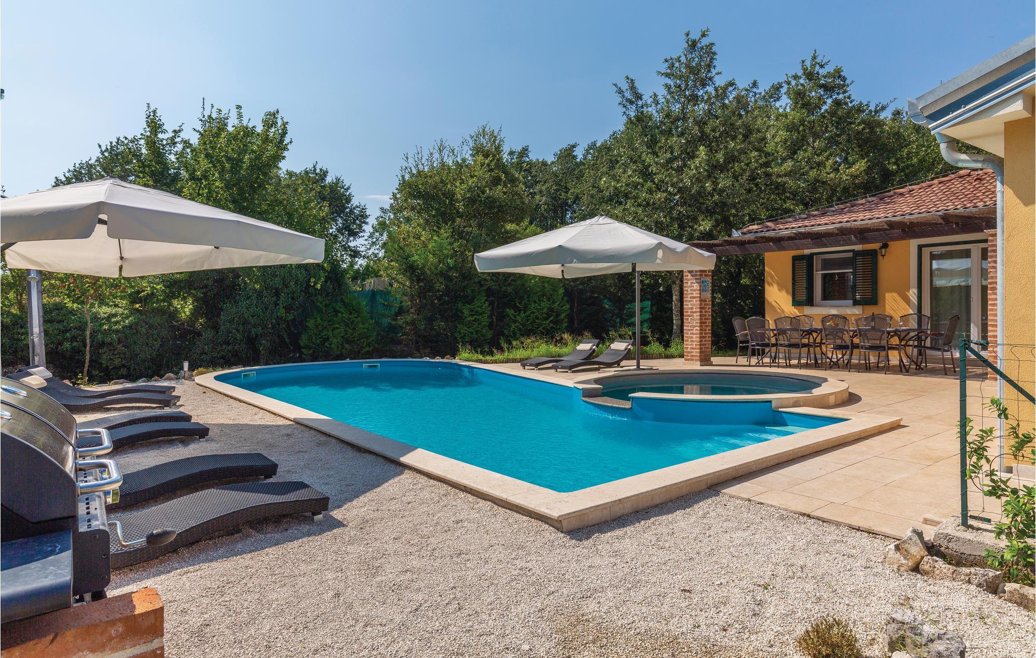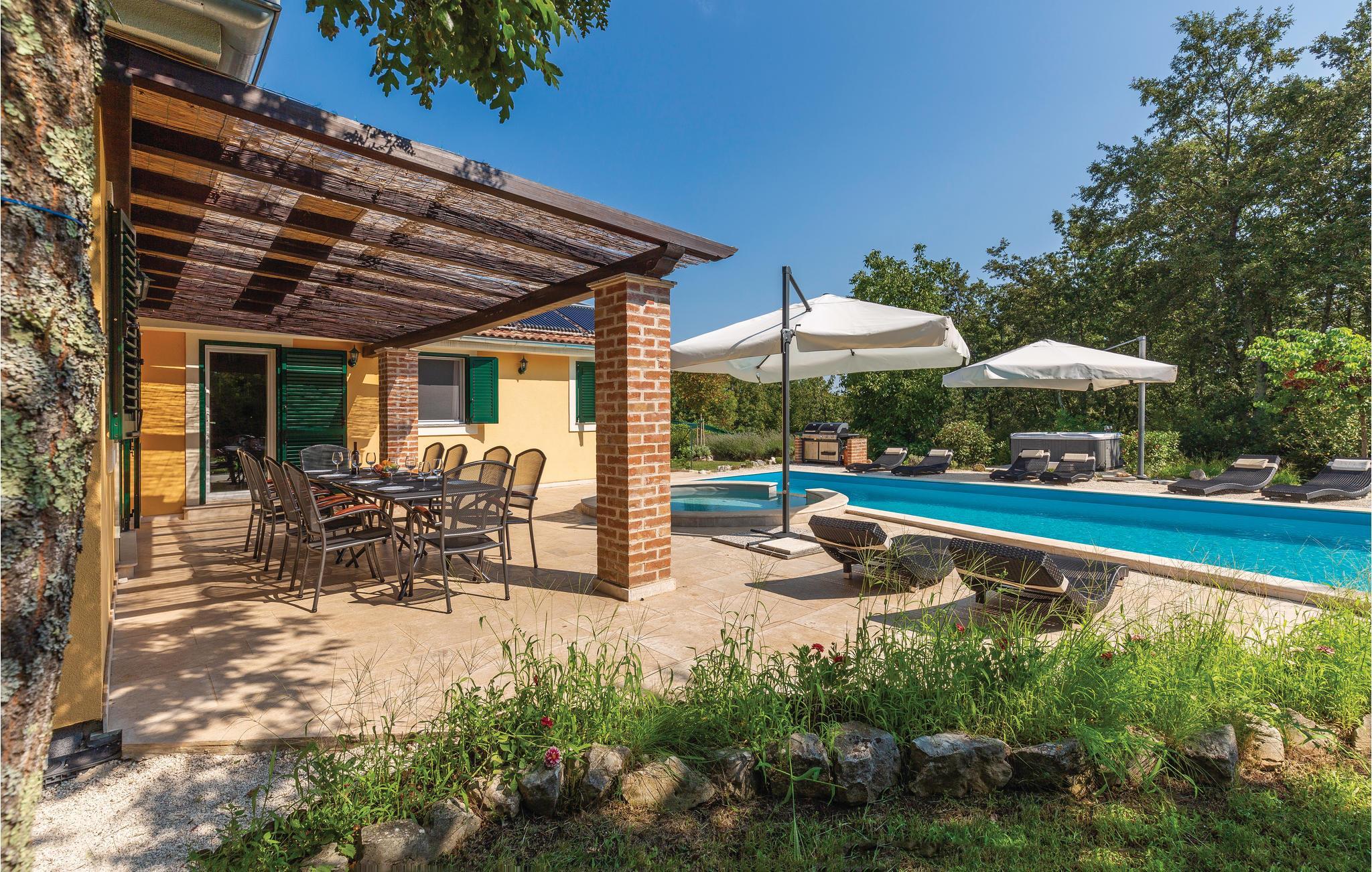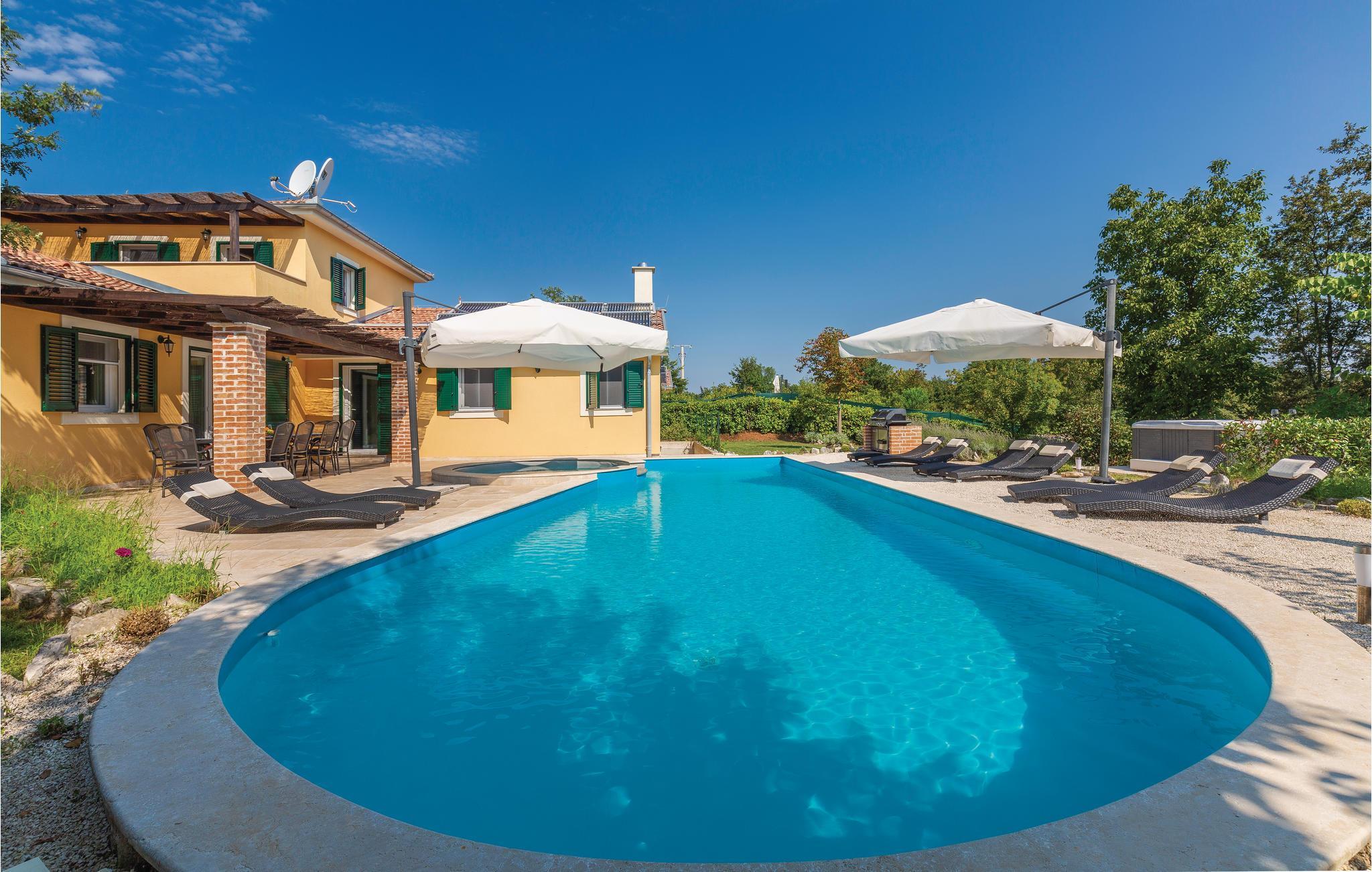Dieses außergewöhnlich gut gestaltete Ferienhaus liegt am Rande eines netten Dorfes im Herzen Istriens. Es ist stilvoll eingerichtet und bietet Ihnen jeglichen Komfort. Die Inneneinrichtung entspricht den heutigen Standards, während die Besonderheit hier sicherlich die Fußbodenheizung und –kühlung ist. Solch ein Kühlsystem bietet deutlich bessere Abkühlung der Räume und verhindert so Lärm und Zugluft der Klimaanlagen. Der Zugang vom Innen- und Außenbereich erfolgt über die großzügige Terrasse, auf der die Eltern einen weiten Überblick, über alles was um den Pool herum passiert, haben können. Der Poolbereich beinhaltet zusätzlich auch einen Whirlpool im Freien in dem die Gäste noch mehr erholsame Stunden während der Sommermonate verbringen können. Um den Aufenthalt zu vervollständigen stellen die Hauseigentümer den Gästen unterhalb der Ferienanlage noch ein Grundstück zur gemeinsamen Nutzung mit den Gästen des Ferienobjektes CIL070 zur Verfügung. Dort stehen ein Kinderspielplatz sowie eine Sport- und Freizeitanlage. Ein Fußballplatz zum Spielen liegt auch nur 150 m vom Ferienhaus. Dies ist sicherlich ein Vorteil für eine relativ große Familie oder Gruppe von Freunden die gerne ihren Urlaub zusammen verbringen möchten. Das Haus liegt ruhig und am Rande des hauseigenen Waldes, es ist das letzte Haus am Ortsrand. Die Lage ist bestens zum Laufen, Wandern oder für einen Spaziergang mit dem Hund geeignet. Attraktionen, Kunst und Kultur in der Umgebung, die sich als Ziel für Tagesausflüge anbieten sind das römische Kolosseum in Pula, die Trüffelstadt Motovun, die wunderschöne Stadt Rovinj oder, für Kinder sicherlich interessant, der Aqua Park in Porec.