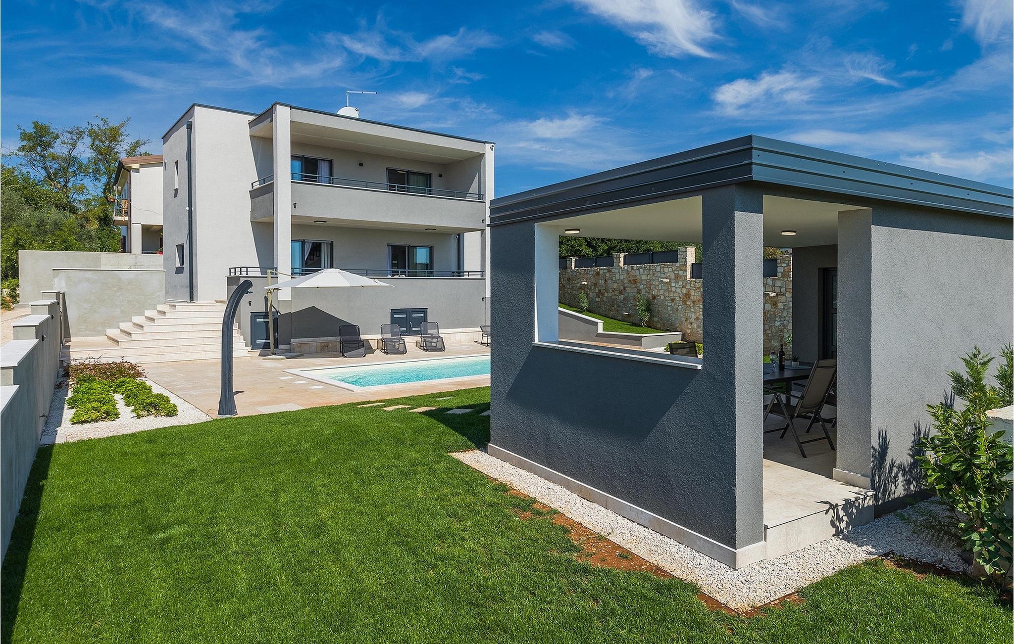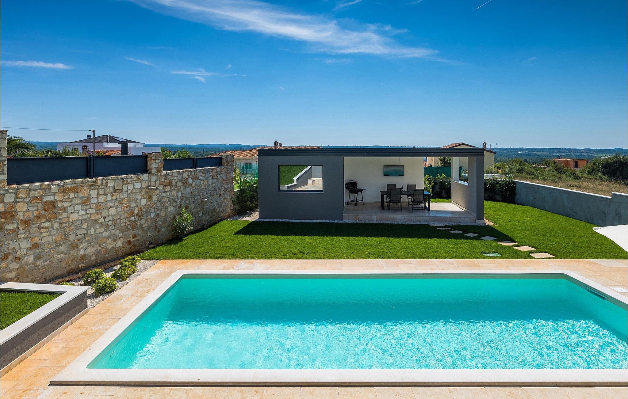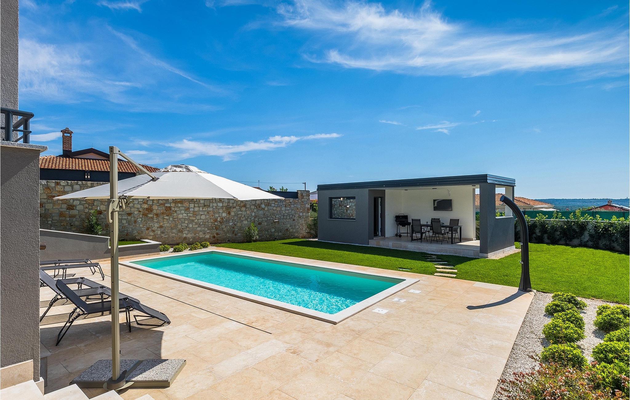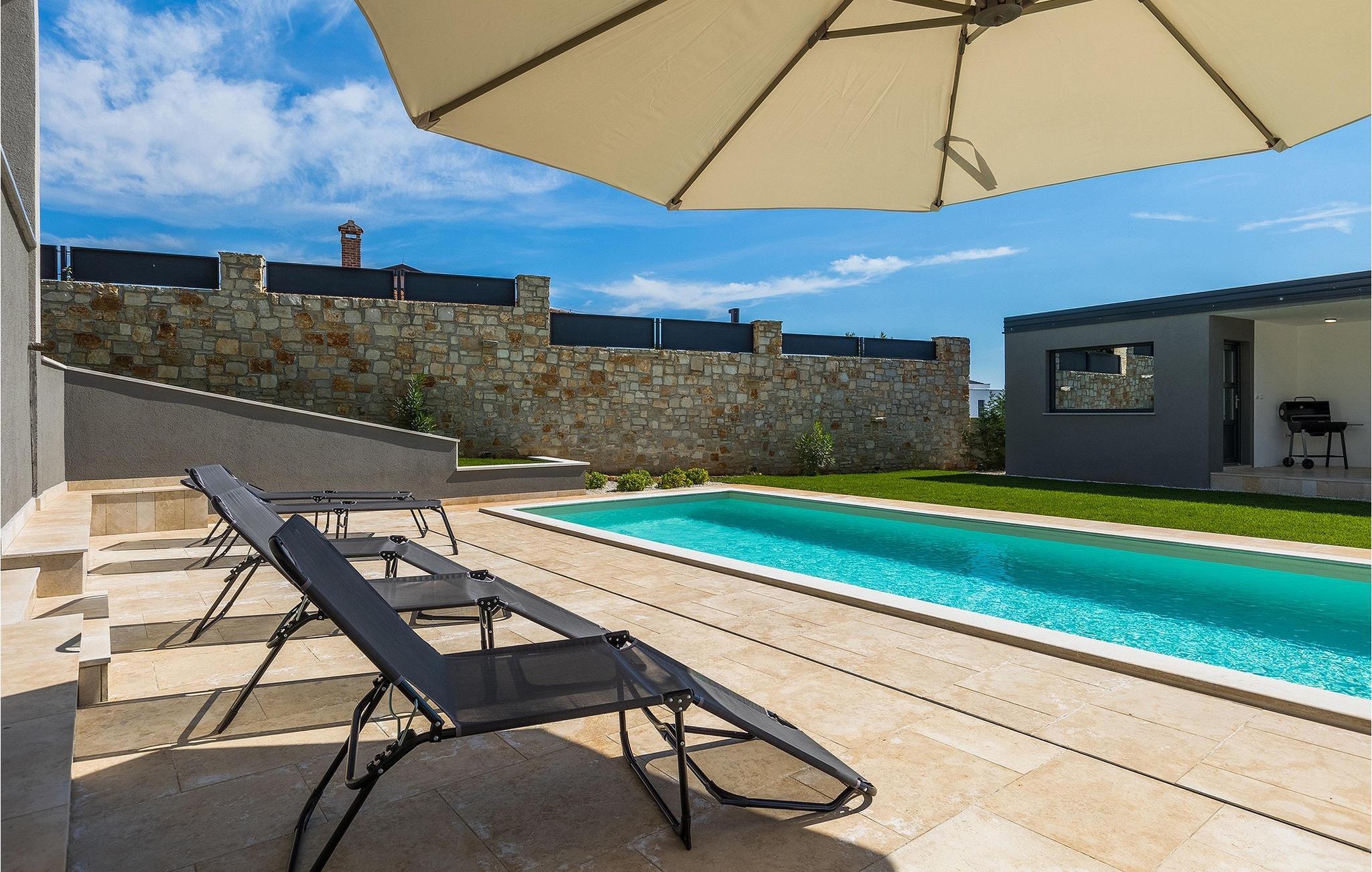 Die wunderschöne Villa Nebra in Istrien liegt nur 2 km von der Küste und ist die perfekte Wahl für einen ruhigen Familienurlaub. Vor dieser herrlichen modern eingerichteten Villa befindet sich eine Terrasse mit privatem Pool sowie eine überdachte Terrasse mit Esstisch und Grill, wo Sie die Möglichkeit haben, Ihre Lieblingsspezialitäten zuzubereiten und die entspannende sommerliche Atmosphäre mit Ihrer Familie zu genießen.