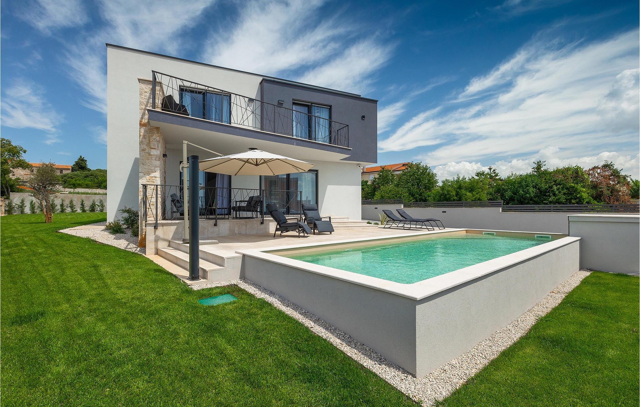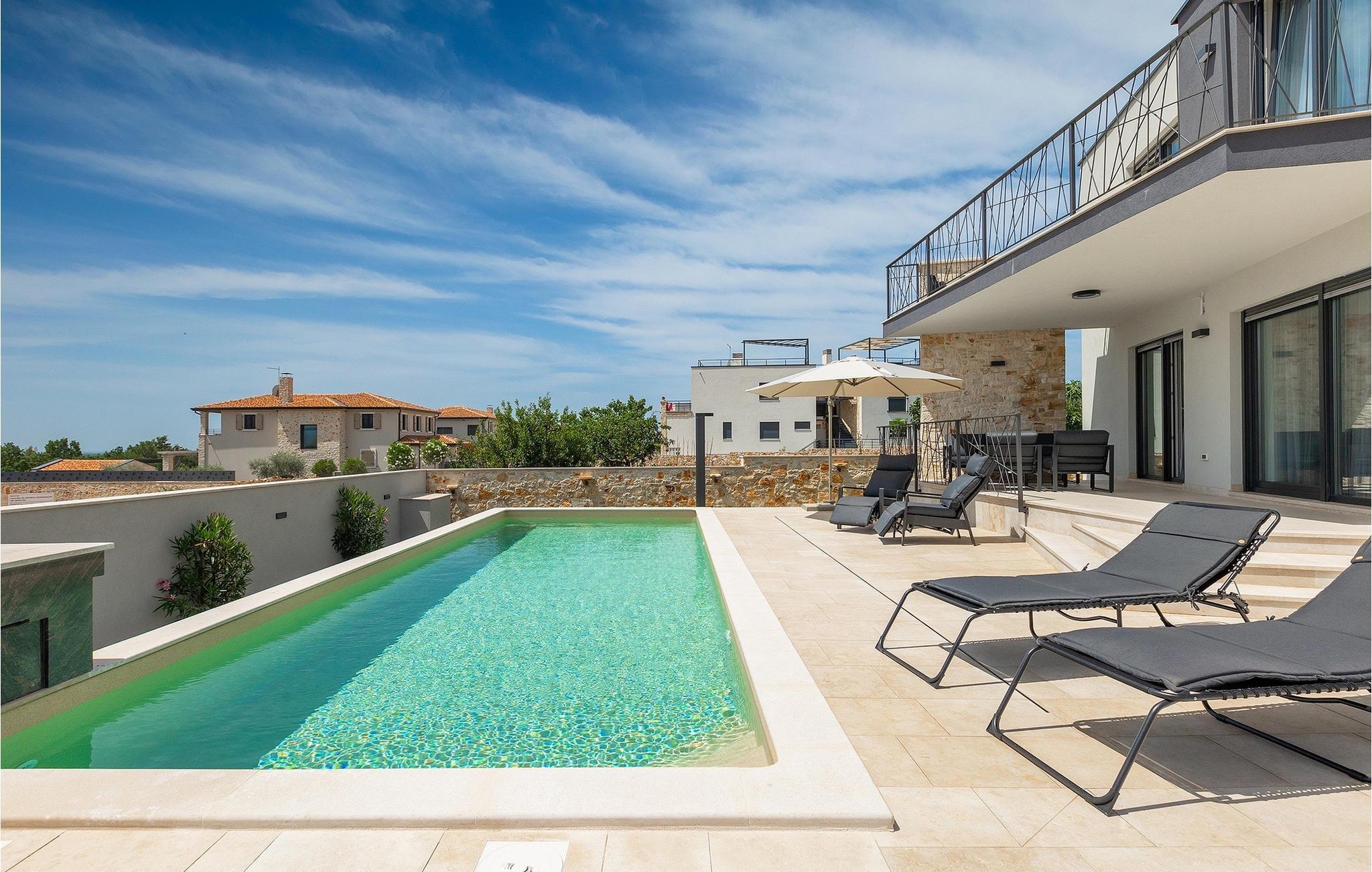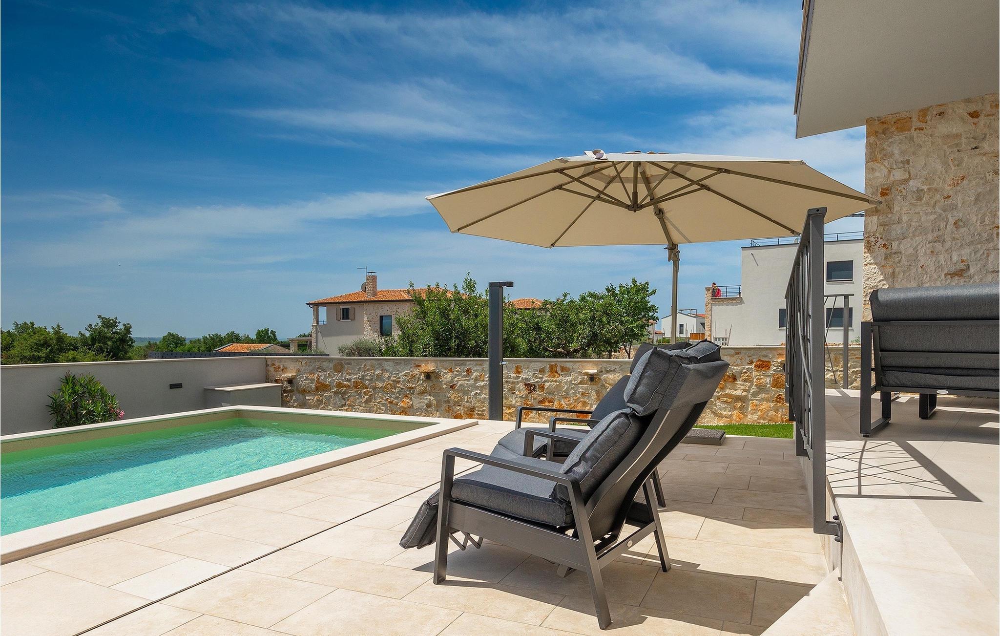 Der 32m2 große Pool - das Herzstück der Villa - wird Ihnen an heißen Sommertagen Erfrischung bieten und die bequemen Liegen laden Sie dazu ein mit einem kühlen Getränk in der Hand die istrische Sonne zu genießen. Auf der überdachten Terrasse haben Sie eine gemütliche Sitzecke, wo es sich am besten die erste Tasse Kaffee am Morgen genießen lässt und für das Mittagessen steht Ihnen ein Grill bereich mit Esstisch zur Verfügung. Stellen Sie Ihre Grillkünste unter Beweis und versammeln Sie Familie und Freunde, um lokale Spezialitäten im Freien zu probieren.