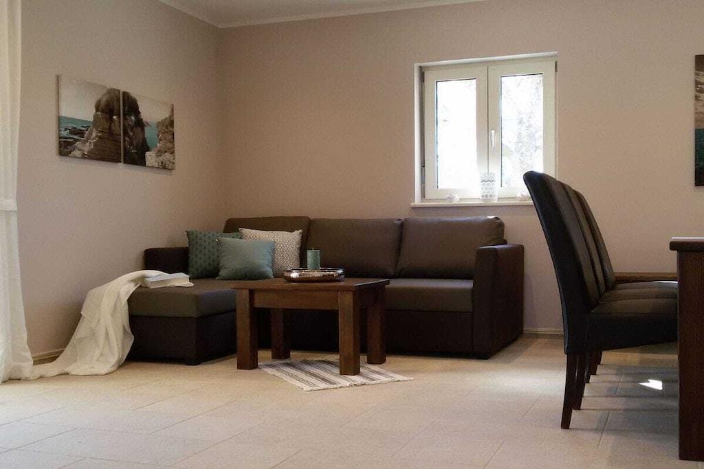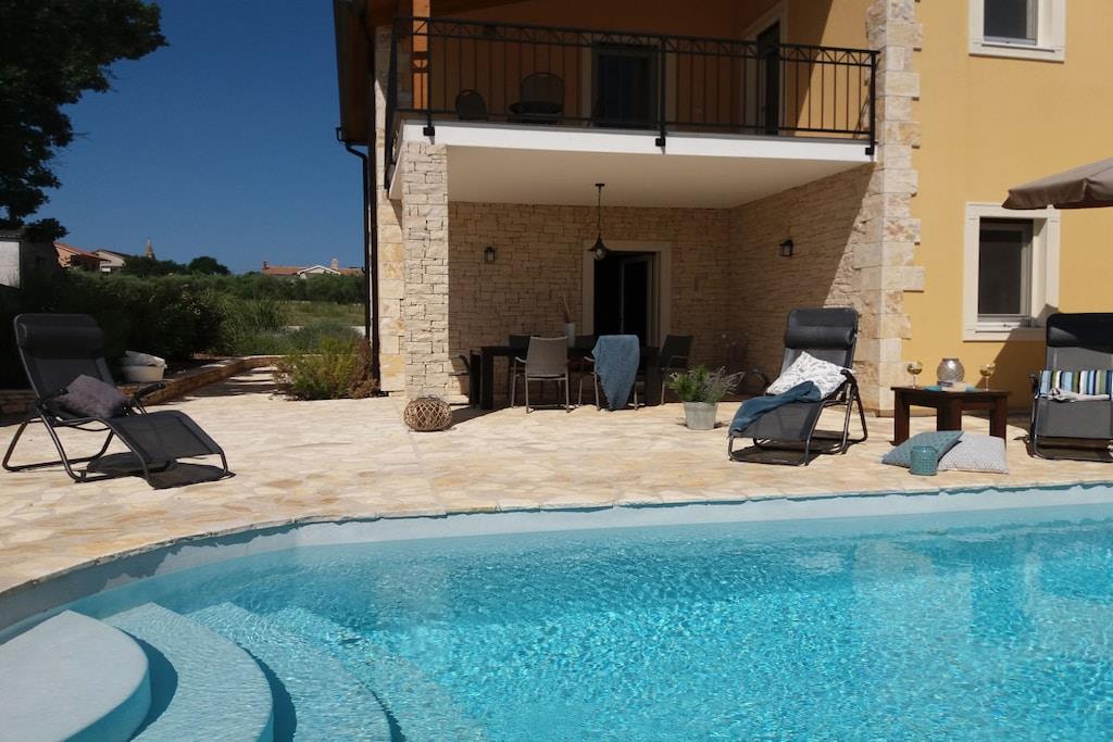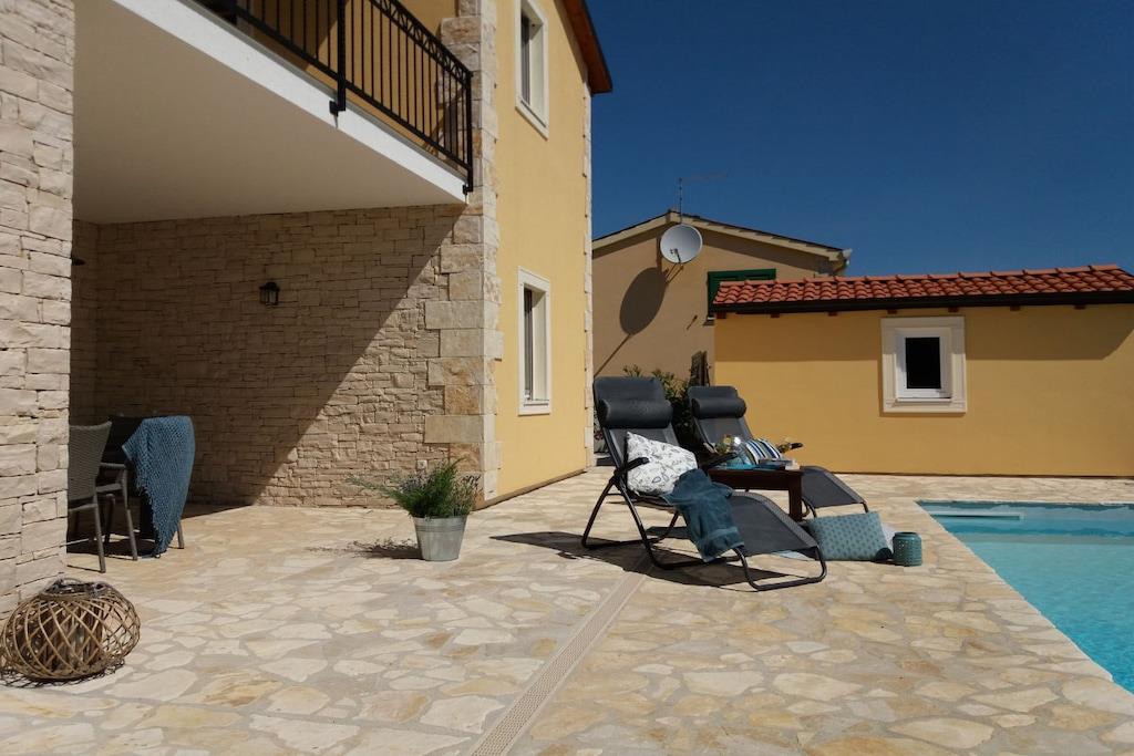 Diese hochwertige, wunderschöne "Villa Jomi" befindet sich nur 2.5 km vom Strand entfernt und liegt in der Ortschaft Tar-Vabriga bei Porec. Die Villa liegt am Ortsrand von Tar. Auf einer Wohnfläche von insgesamt 150 m² finden bis zu 9 Personen Platz. Das Haus besteht aus 4 Schlafzimmern jeweils mit separatem Bad, Gäste WC, Waschmaschine, komplett ausgestatteter offener Küche mit großem Esstisch und Wohnzimmer mit ausziehbaren Sofa und Kamin. Im Außenbereich befindet sich eine schöne Terrasse mit Zugang zum privatem Pool. Zudem hat das Haus einen schönen Balkon mit Blick in die Natur, welcher von 2 Schlafzimmern begehbar ist. "Villa Jomi" nutzt Solarenergie, ist klimatisiert und verfügt über WLAN. Parkplätze stehen ebenfalls zur Verfügung.