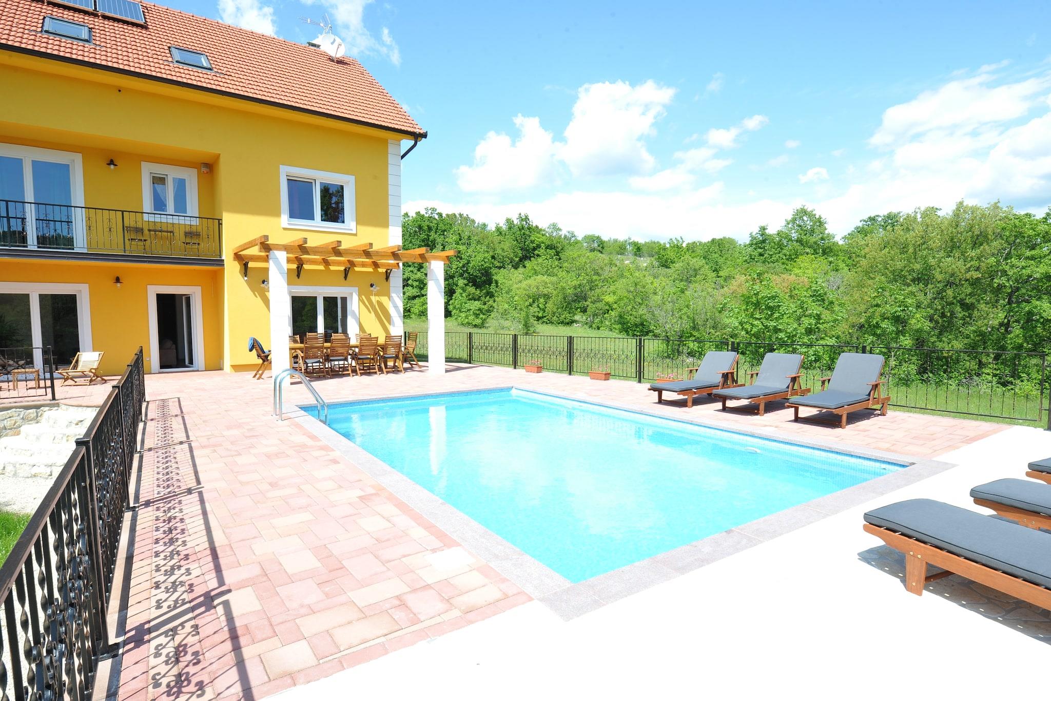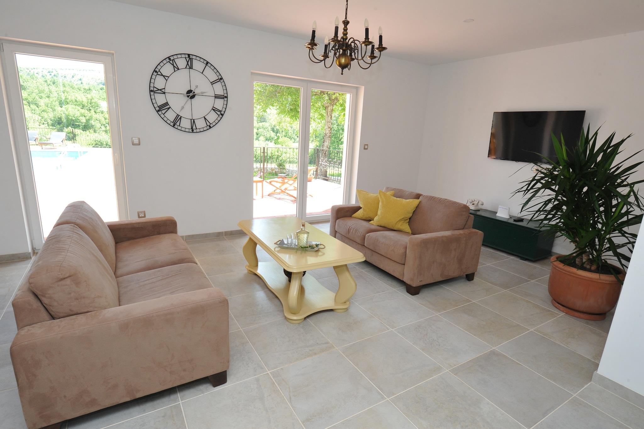 Im Inland von Dalmatien gelegen ist dieses Anwesen nahe genug für alle Möglichkeiten. Dennoch aber weit genug entfernt, dass man sich fühlt man wäre entkommen. Die Villa ist komfortabel, gut ausgestattet und vor allem sehr privat gelegen. Sie verfügt über drei Stockwerke: Alle Schlafzimmer, jedes mit eigenem Badezimmer und Klimaanlage, befinden sich in den oberen Stockwerken, während das Erdgeschoss ein luftiger Raum mit offener Küche, Ess- und Wohnbereich mit französischen Türen zur Terrasse, Liegewiese und Pool ist. Die grüne Landschaft, Ruhe, frische und saubere Luft machen den Außenbereich zu einem perfekten Ort für Mahlzeiten im Freien, Unterhaltungen, Faulenzen und entspannen am Pool. Obwohl die Villa einen perfekten Urlaub mit wirklichem Gefühl der Abgeschiedenheit darstellt, bietet ihre Lage aber auch eine Vielzahl von Möglichkeiten für Ausflüge : Innerhalb von dreißig Minuten Fahrt sind idyllische Seen und malerische kleine Städte vorzufinden. Fast jeder Platz an der zentralen dalmatinischen Küste ist in weniger als einer Stunde zu erreichen. Dazu zählen die Riviera von Omis oder die Riviera von Makarska - eine der schönsten in Kroatien - ,sowie die Hauptstadt der Region - Split.