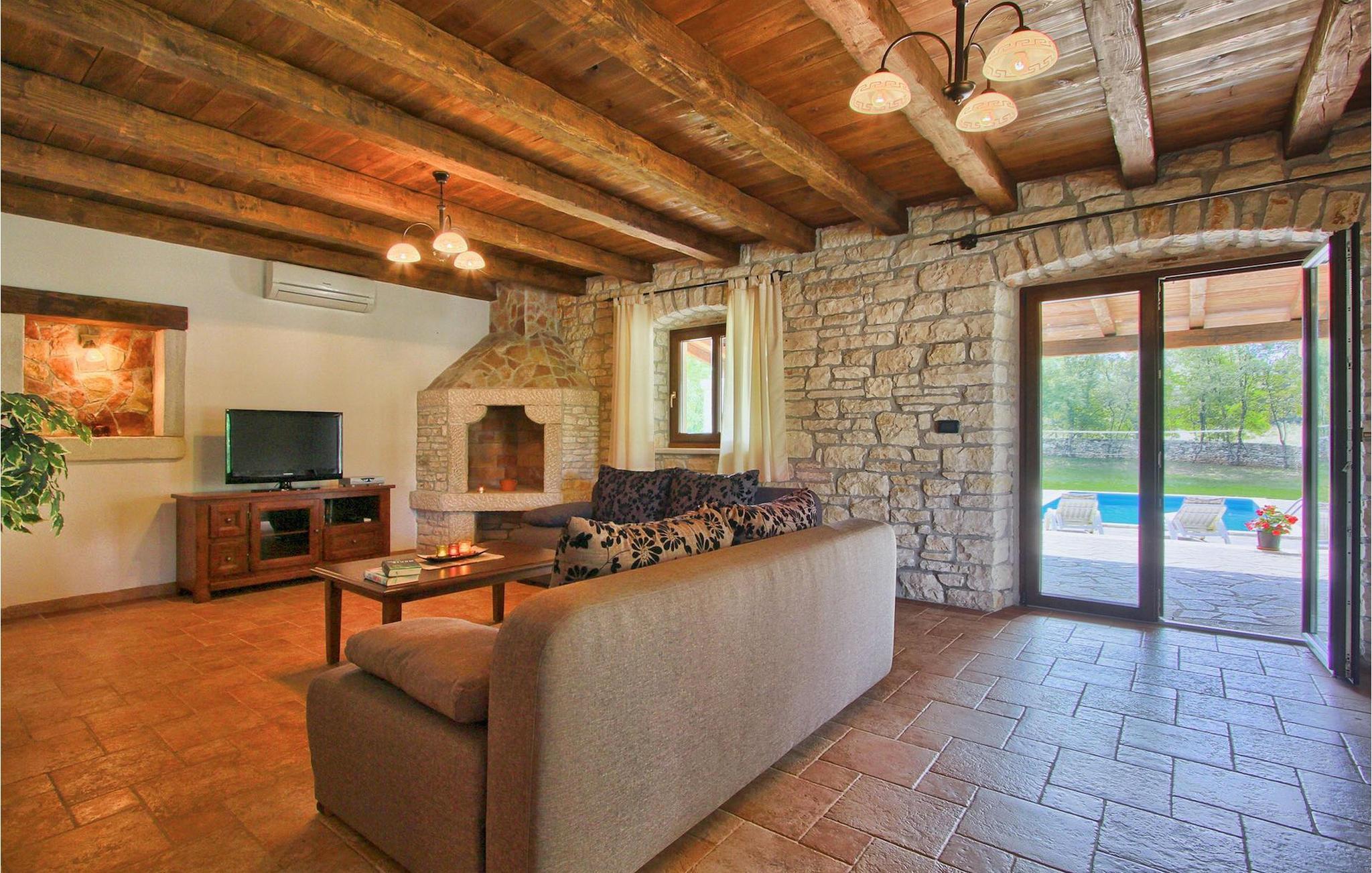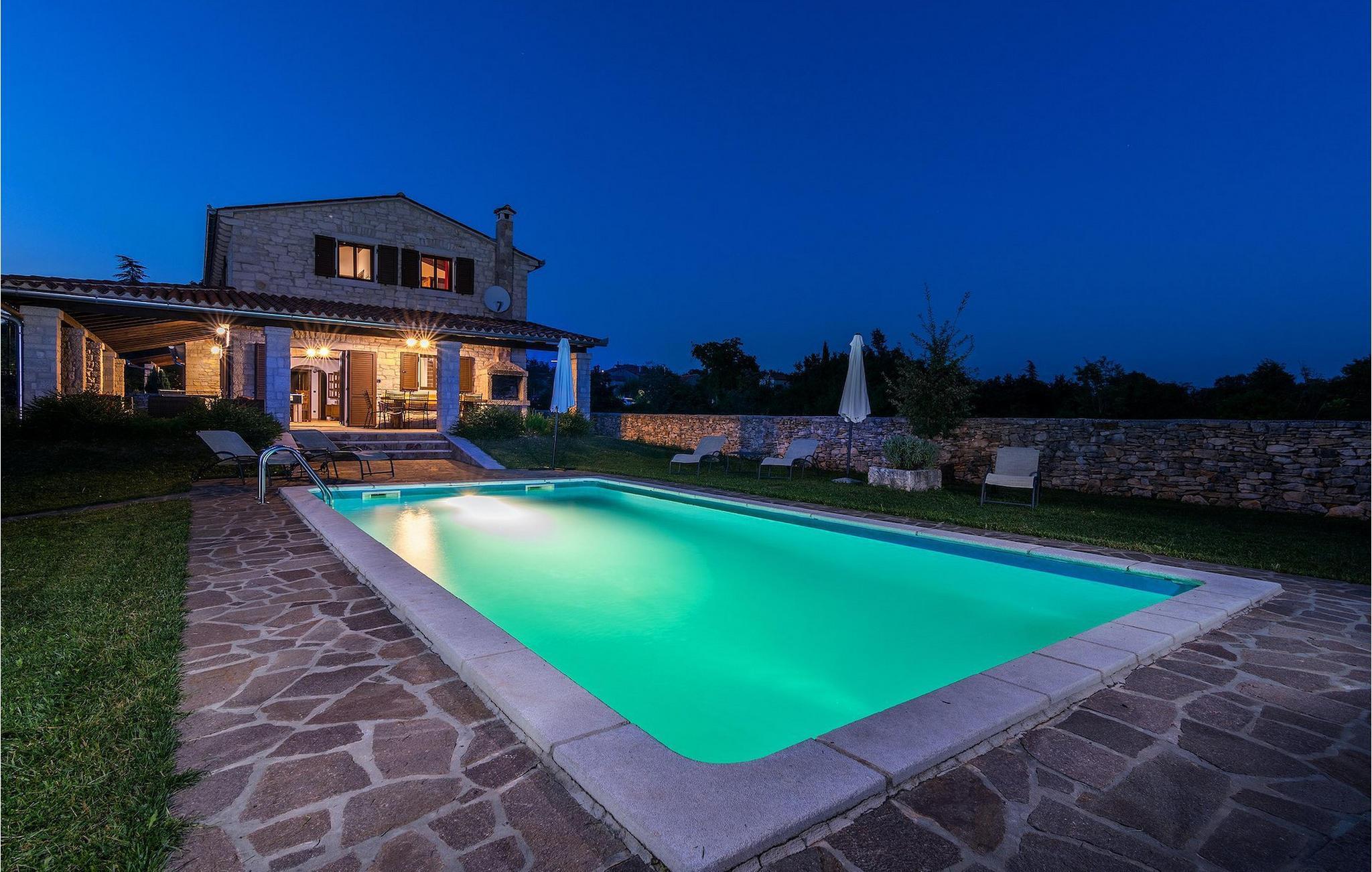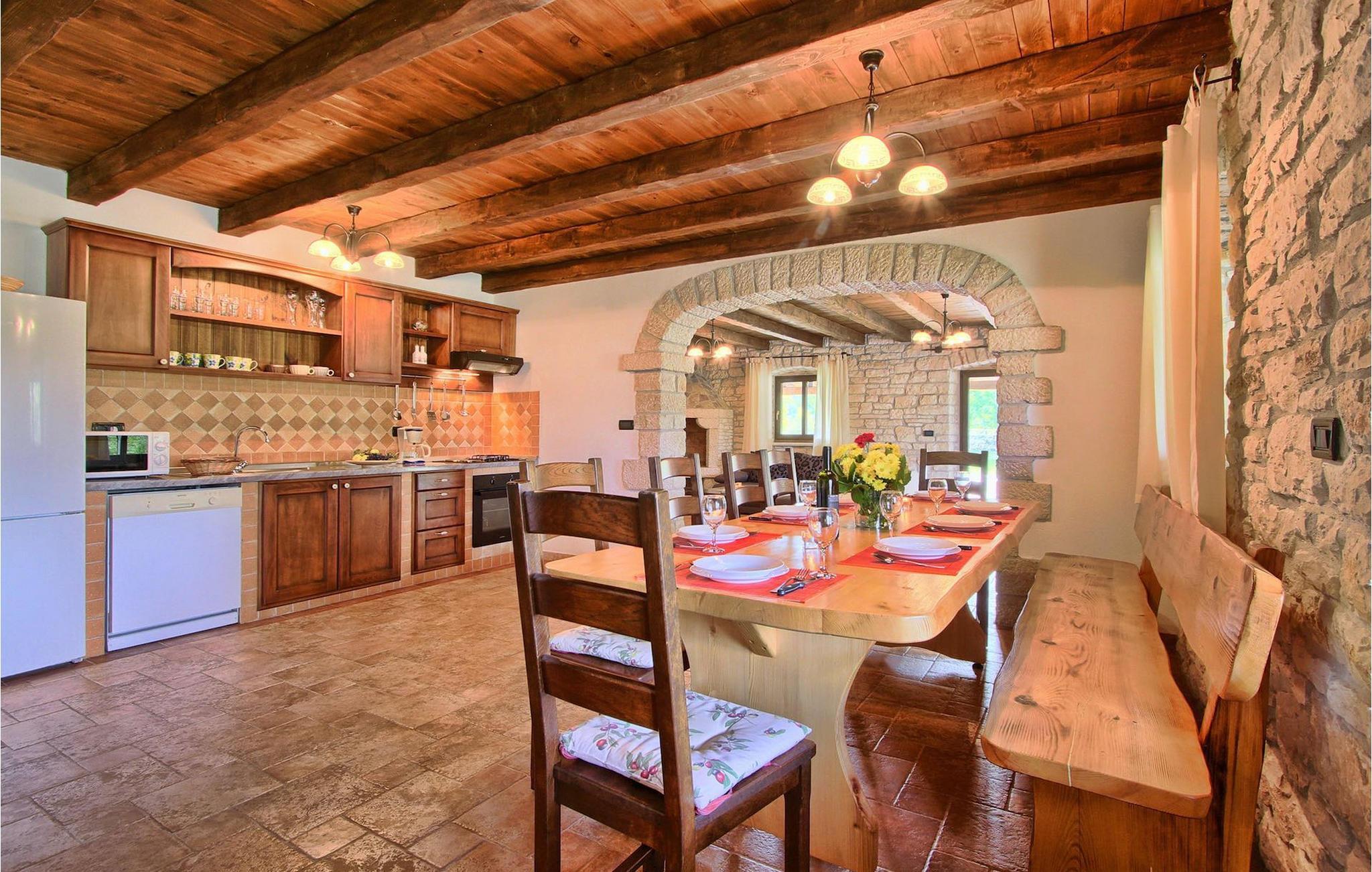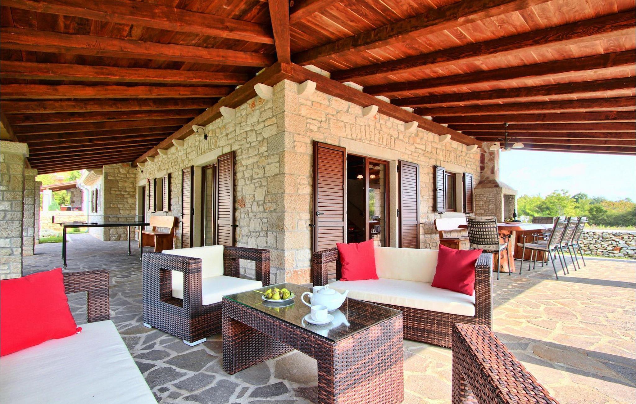 Diese gemütliche Familienvilla liegt am Rande des Dorfes Danijeli, im Herzen Istriens. Mit insgesamt fünf Schlafzimmern verteilt auf zwei Etagen bietet diese traditionelle Steinvilla Platz für zehn Personen. Das Erdgeschoss öffnet sich zur überdachten Terrasse, die zu einer Tasse Kaffee in der gemütlichen Lounge einlädt. Auf der Terrasse können Sie am offenen Kamin grillen und Ihre Mahlzeiten im Freien genießen. Im Erdgeschoss befindet sich der rustikale Wohn- und Essbereich mit Kamin, die Küche, ein Badezimmer sowie zwei Schlafzimmer mit Doppelbett, eines davon mit eigenem Bad mit Dusche. Im Obergeschoss befinden sich die restlichen drei Schlafzimmer, Zwei mit Doppelbett und eins mit zwei Einzelbetten. Eines der Doppelbettzimmer verfügt über ein eigenes Bad, und die anderen zwei Zimmer teilen sich das Badezimmer. Die Villa verfügt über ein privates Parking mit drei Parkplätzen.