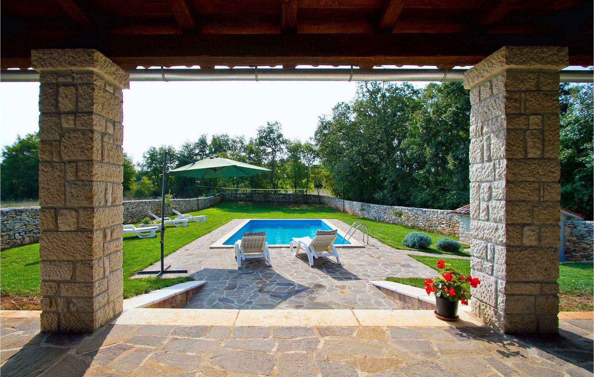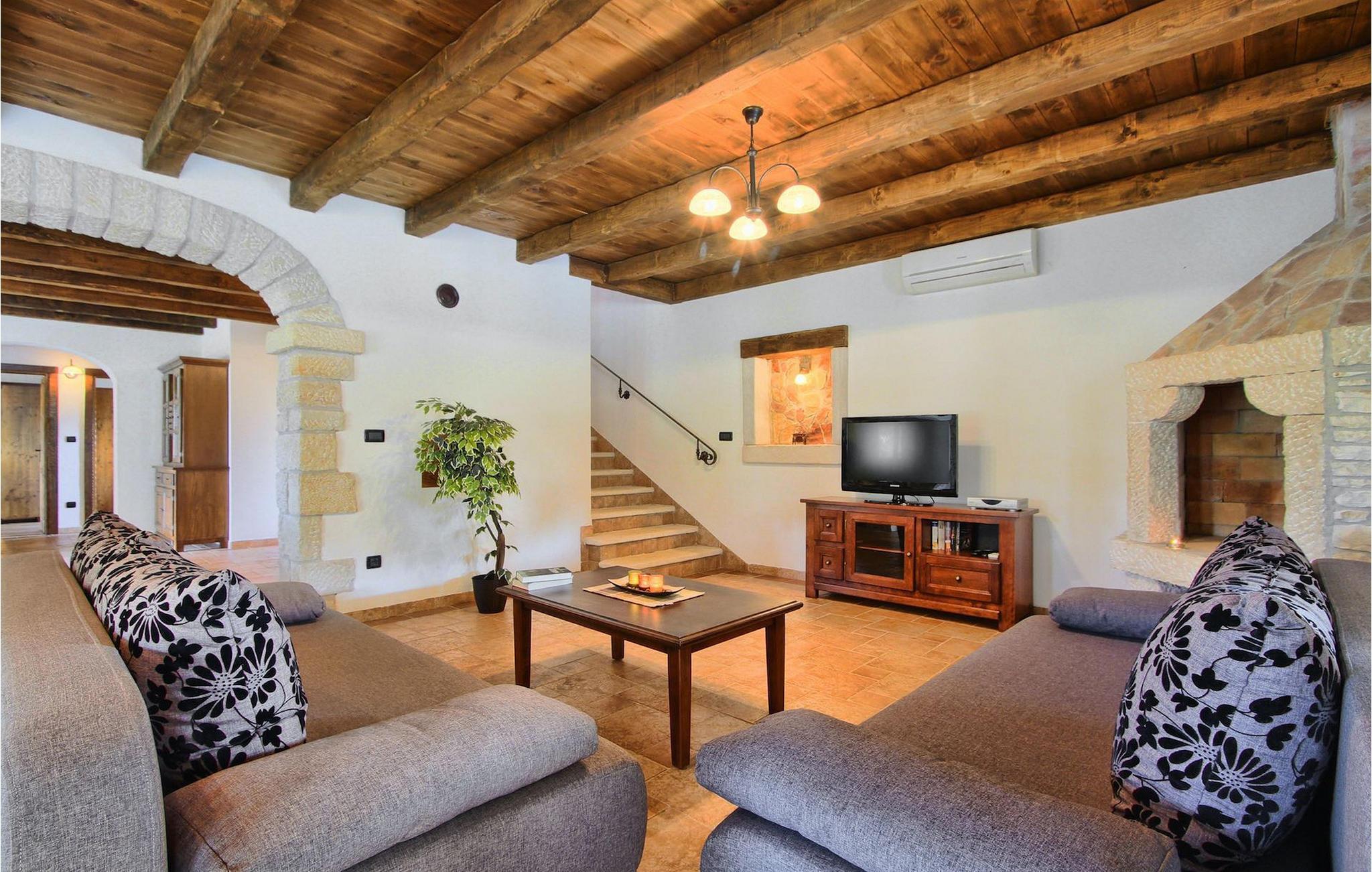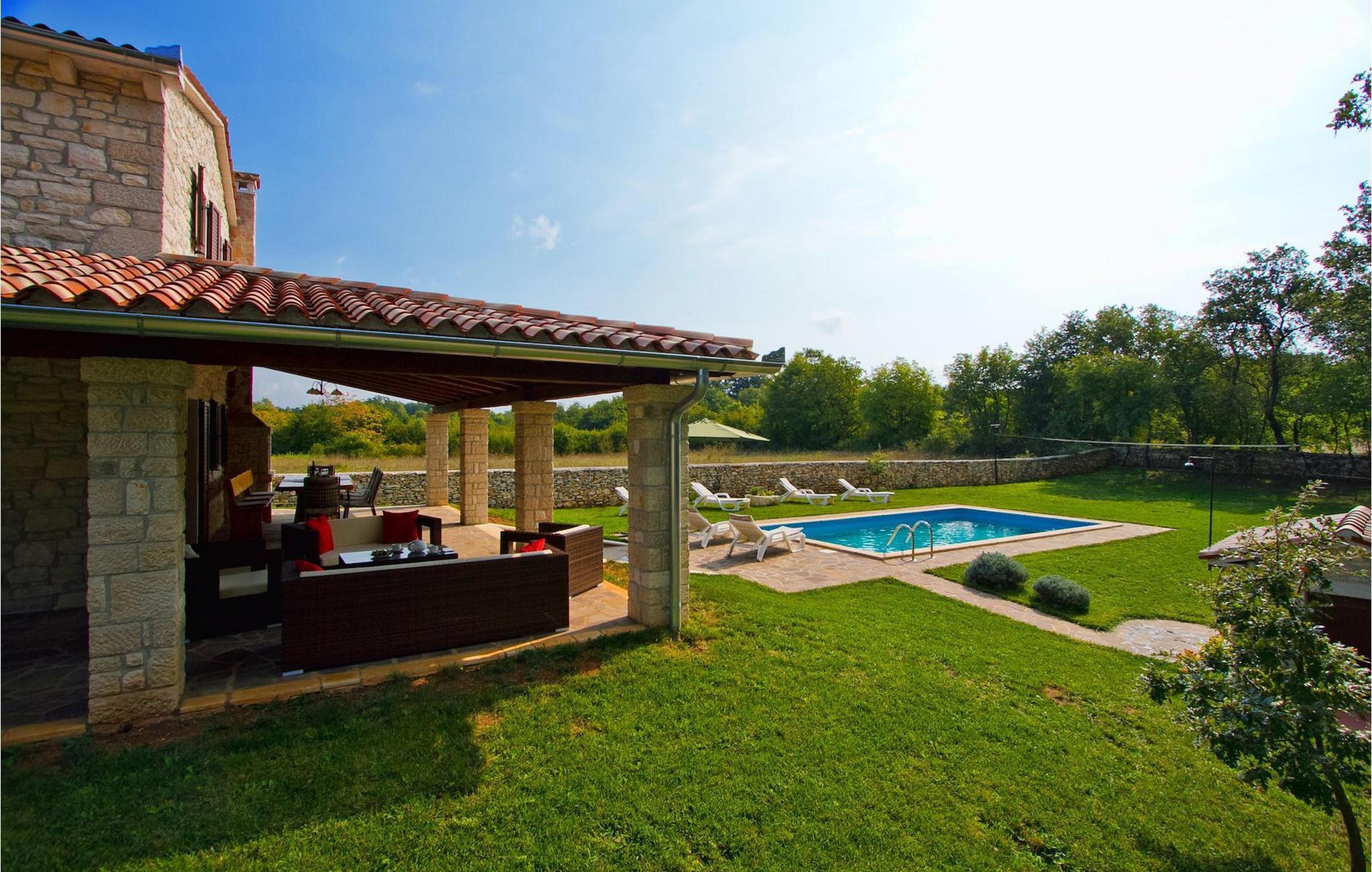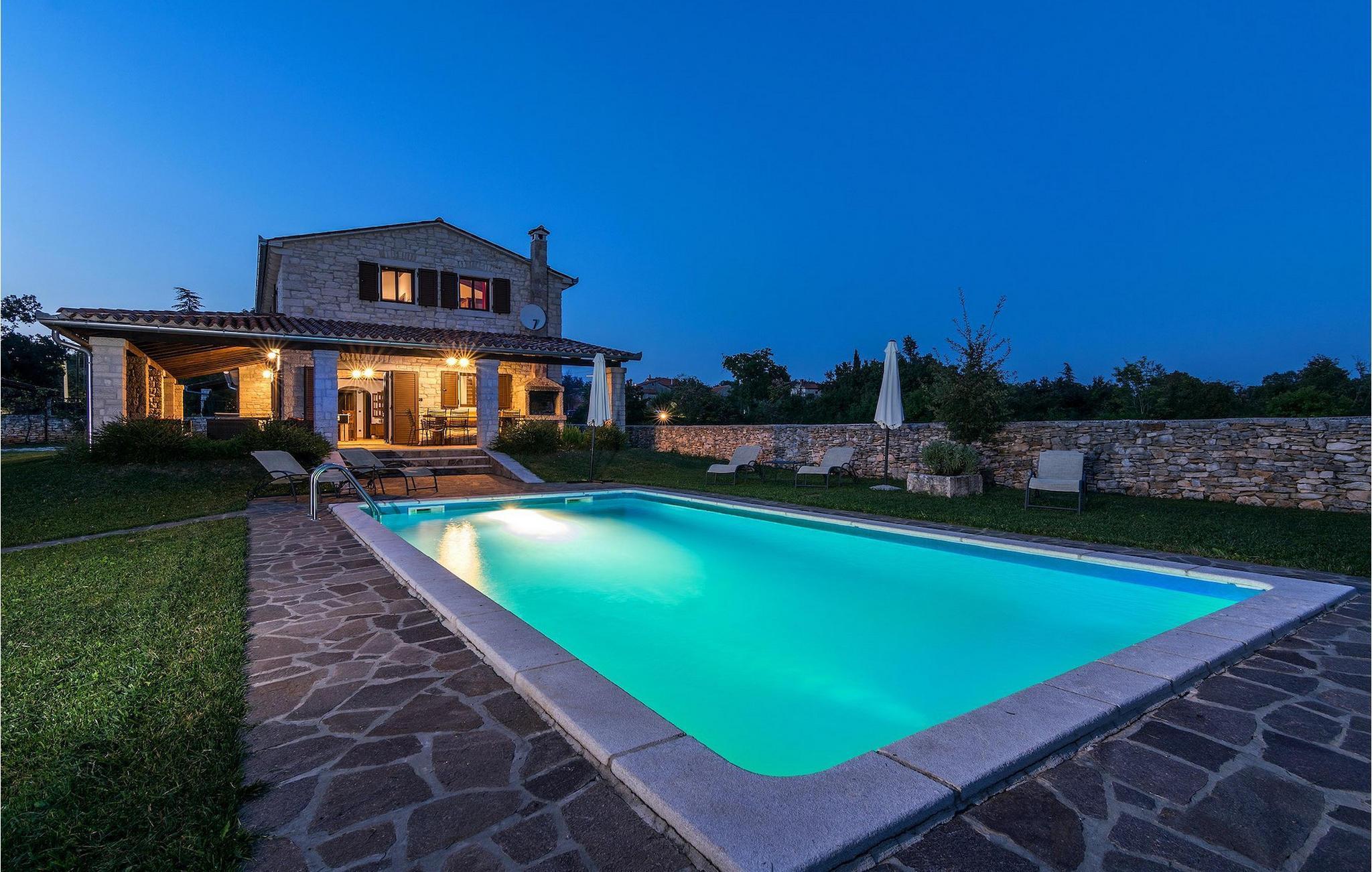 Diese gemütliche Familienvilla liegt am Rande des Dorfes Danijeli, im Herzen Istriens. Mit insgesamt fünf Schlafzimmern verteilt auf zwei Etagen bietet diese traditionelle Steinvilla Platz für zehn Personen. Das Erdgeschoss öffnet sich zur überdachten Terrasse, die zu einer Tasse Kaffee in der gemütlichen Lounge einlädt. Auf der Terrasse können Sie am offenen Kamin grillen und Ihre Mahlzeiten im Freien genießen. Im Erdgeschoss befindet sich der rustikale Wohn- und Essbereich mit Kamin, die Küche, ein Badezimmer sowie zwei Schlafzimmer mit Doppelbett, eines davon mit eigenem Bad mit Dusche. Im Obergeschoss befinden sich die restlichen drei Schlafzimmer, Zwei mit Doppelbett und eins mit zwei Einzelbetten. Eines der Doppelbettzimmer verfügt über ein eigenes Bad, und die anderen zwei Zimmer teilen sich das Badezimmer. Die Villa verfügt über ein privates Parking mit drei Parkplätzen.