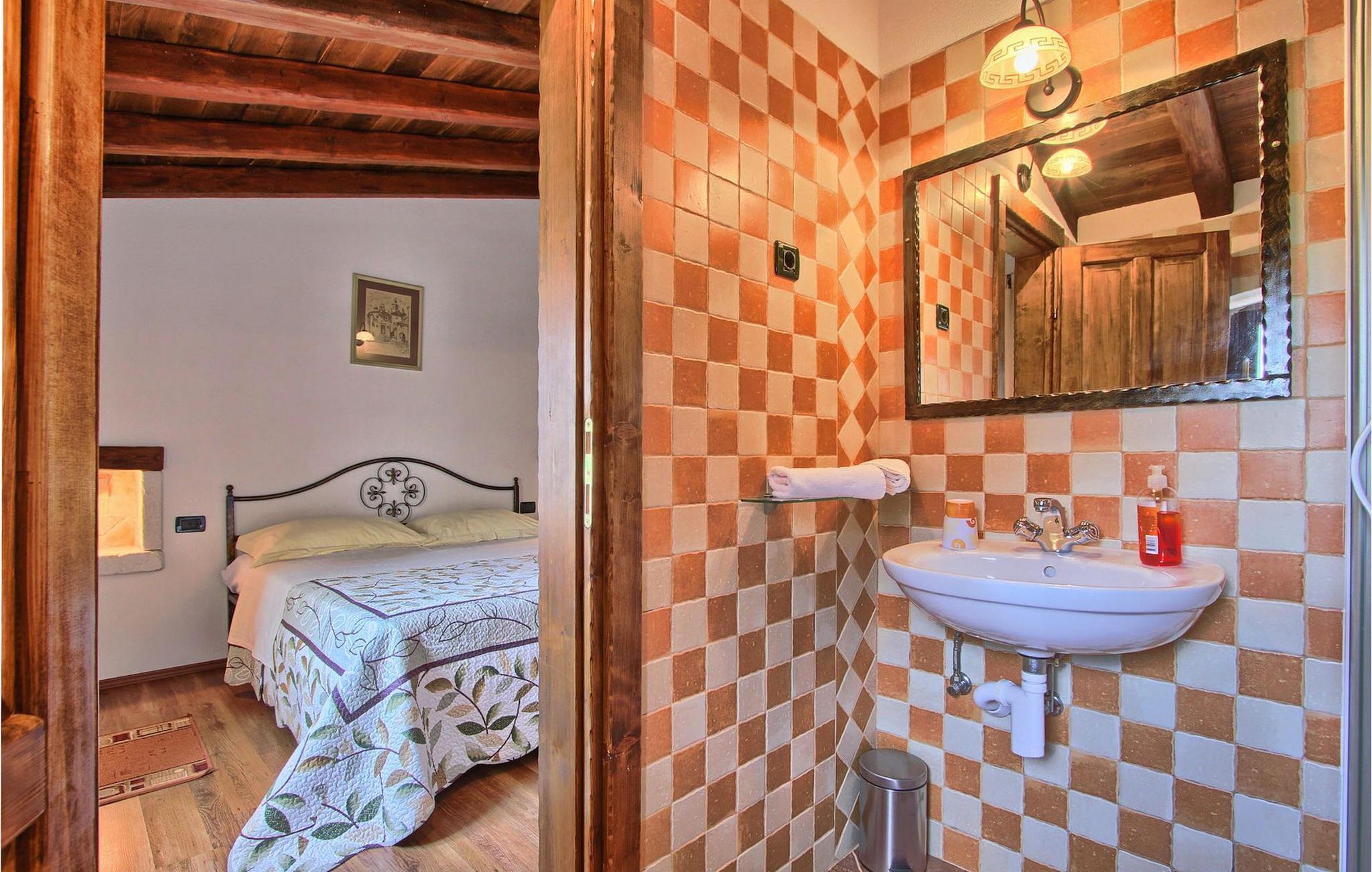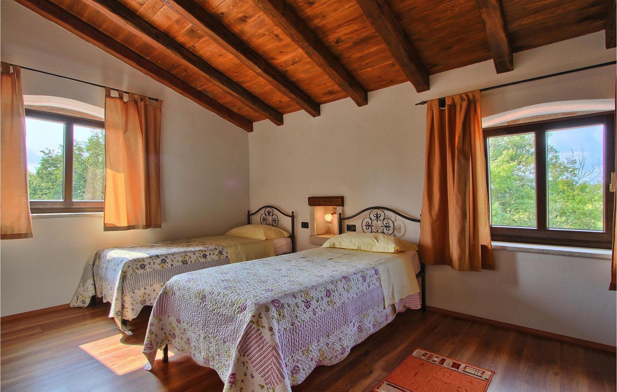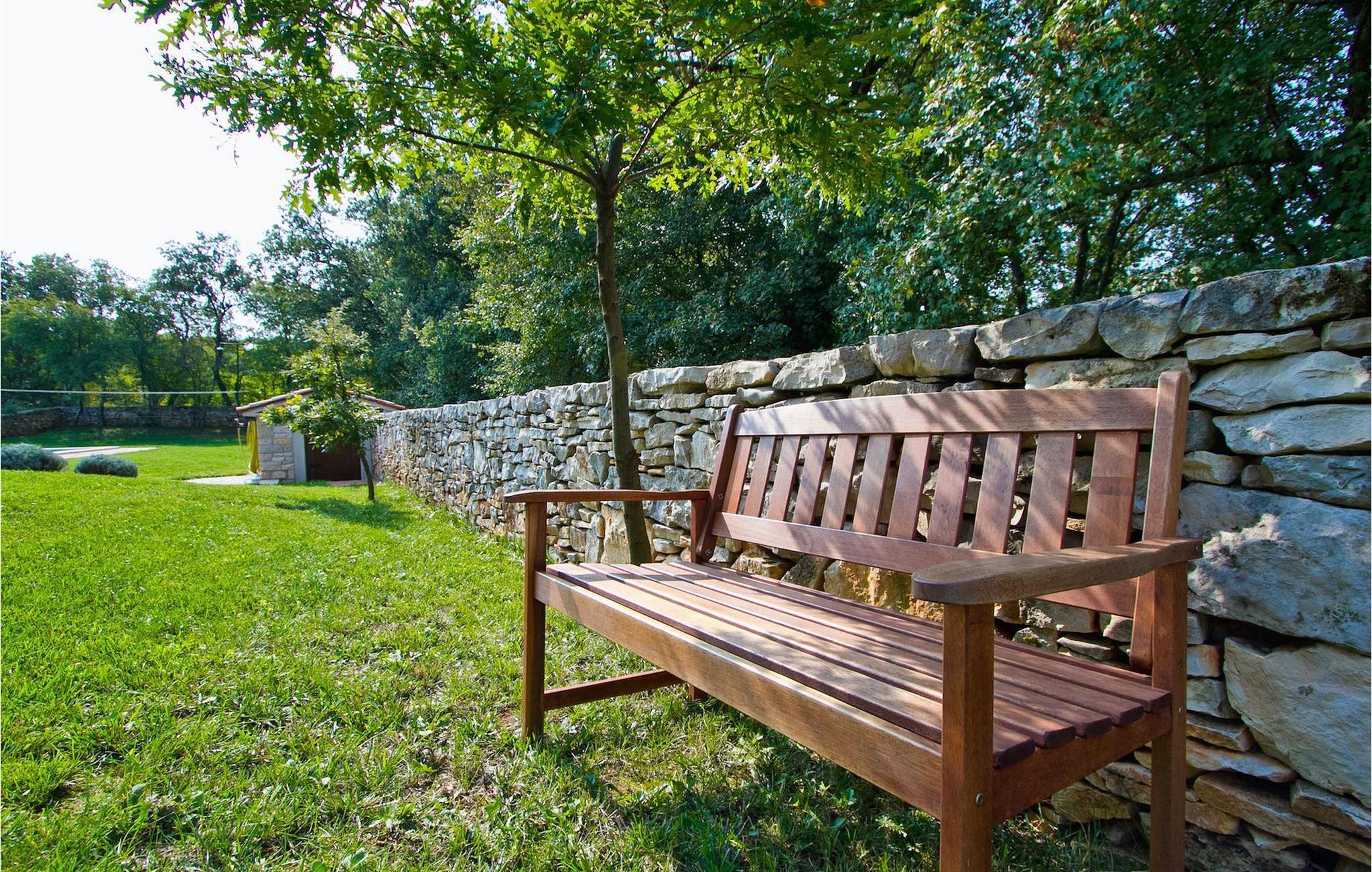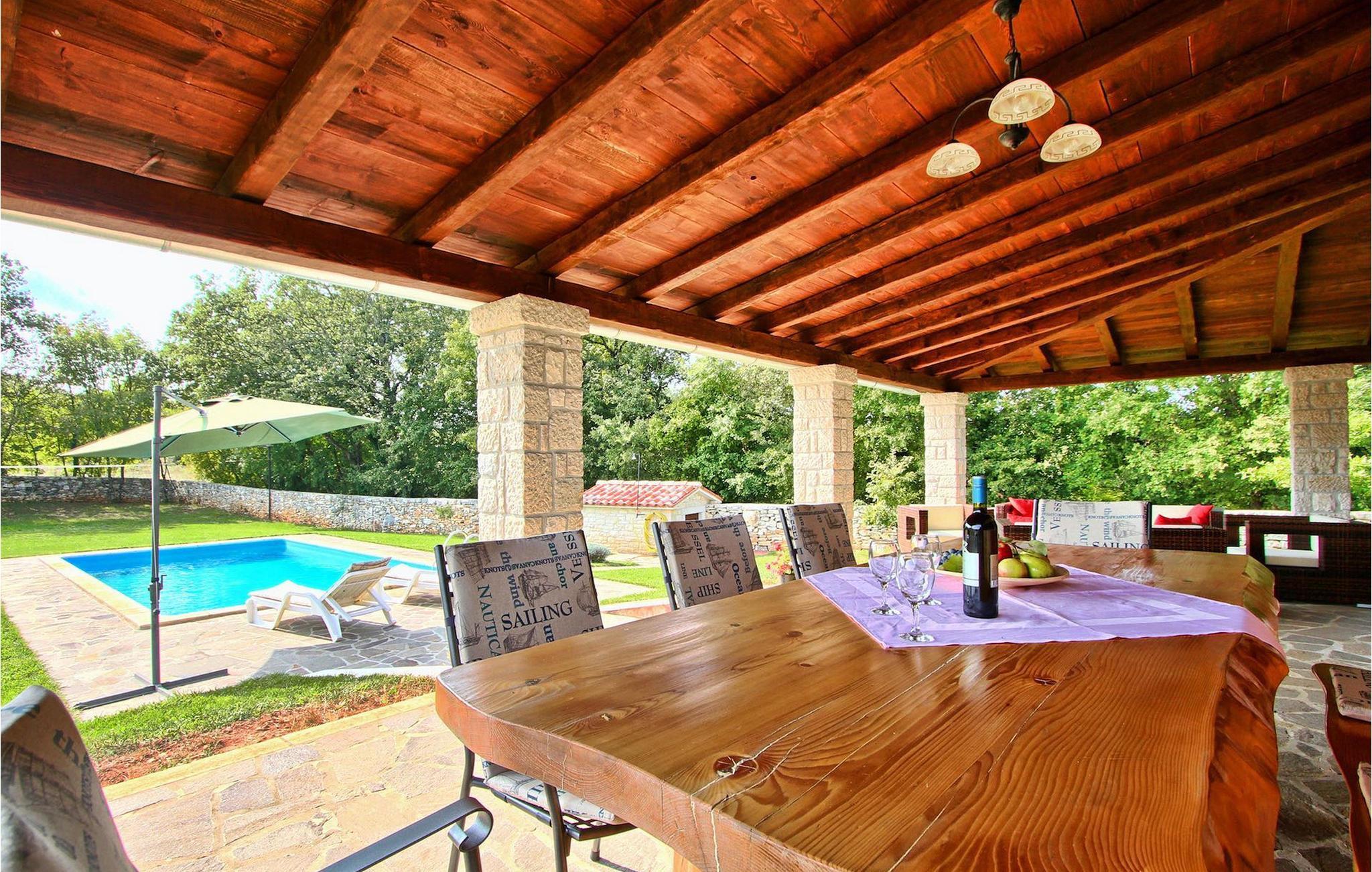 Diese gemütliche Familienvilla liegt am Rande des Dorfes Danijeli, im Herzen Istriens. Mit insgesamt fünf Schlafzimmern verteilt auf zwei Etagen bietet diese traditionelle Steinvilla Platz für zehn Personen. Das Erdgeschoss öffnet sich zur überdachten Terrasse, die zu einer Tasse Kaffee in der gemütlichen Lounge einlädt. Auf der Terrasse können Sie am offenen Kamin grillen und Ihre Mahlzeiten im Freien genießen. Im Erdgeschoss befindet sich der rustikale Wohn- und Essbereich mit Kamin, die Küche, ein Badezimmer sowie zwei Schlafzimmer mit Doppelbett, eines davon mit eigenem Bad mit Dusche. Im Obergeschoss befinden sich die restlichen drei Schlafzimmer, Zwei mit Doppelbett und eins mit zwei Einzelbetten. Eines der Doppelbettzimmer verfügt über ein eigenes Bad, und die anderen zwei Zimmer teilen sich das Badezimmer. Die Villa verfügt über ein privates Parking mit drei Parkplätzen.