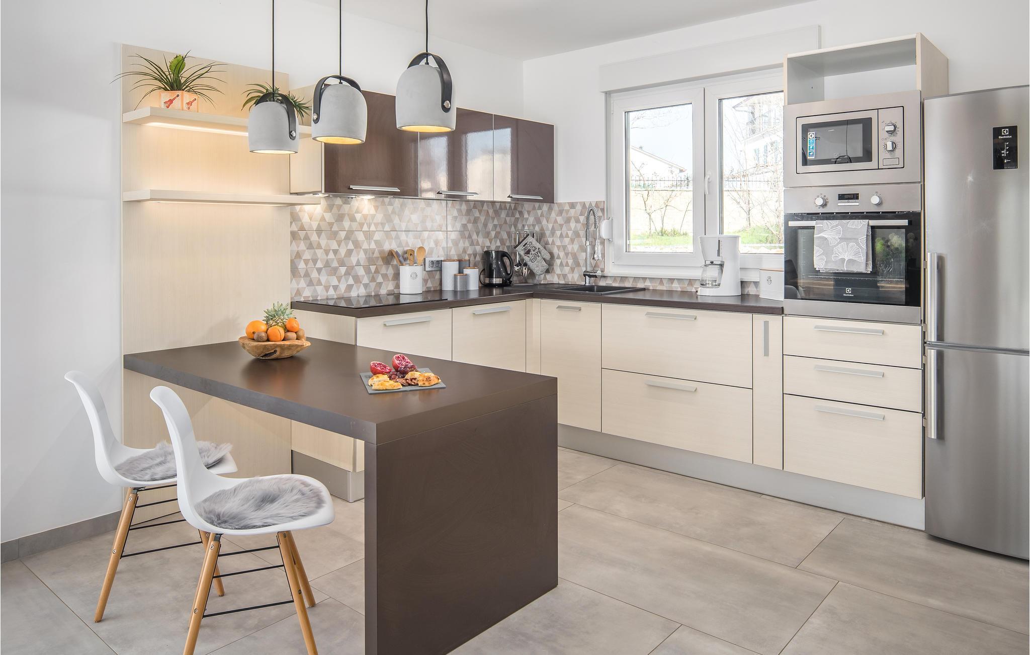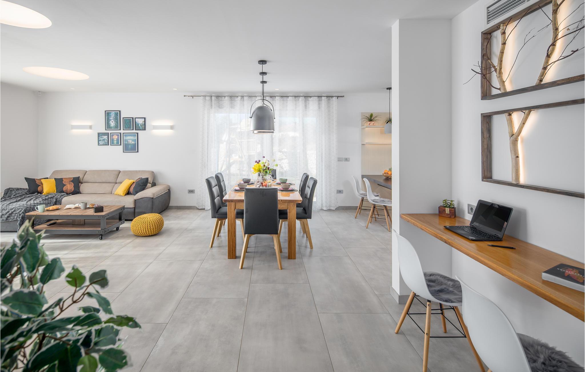 Das Ferienhaus ist schön und modern eingerichtet und bietet viel Inhalt für Kinder und Familie. Dank Fußbodenheizung im ganzen Haus ist es auch an kühleren Tagen angenehm. An heißen Tagen sorgt die Klimaanlage für Abkühlung. Das Haus erstreckt sich über eine Etage, auf der sich 2 Schlafzimmer, 2 Badezimmer, ein separates WC, eine Essküche und ein Wohnbereich verteilen.