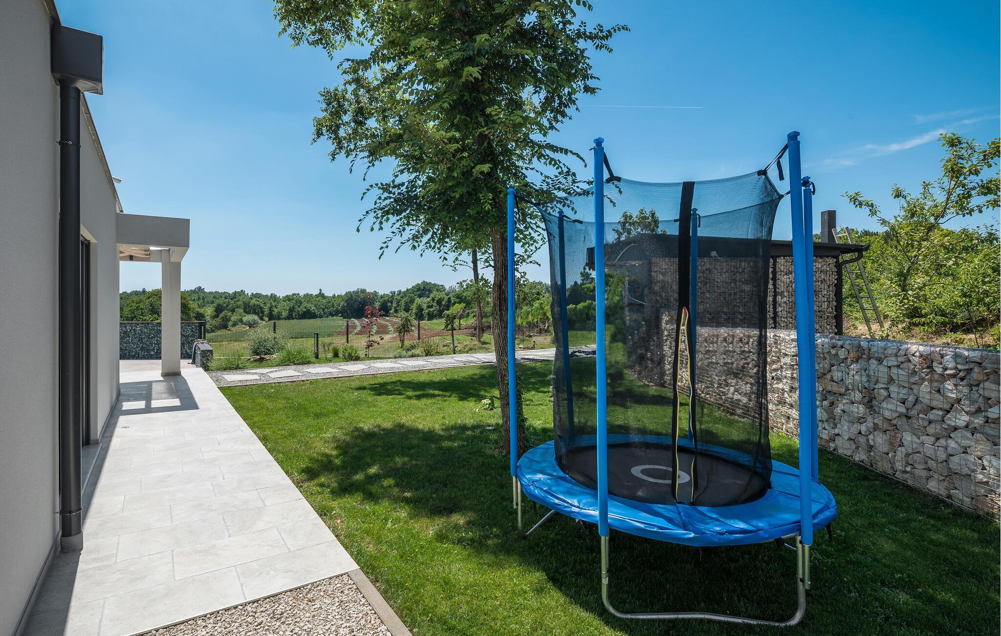 Vom Wohnzimmer gelangen Sie auf die Terrasse und das Sonnendeck mit Pool. Auf der überdachten Terrasse mit Garten- und Loungemöbeln lässt es sich wunderbar mit einem kühlen Getränk entspannen. Die Kinder werden die vielen Aktivitätsmöglichkeiten und Spiele wie zum Beispiel die Rutsche, das Spielhaus oder die Schaukel lieben.