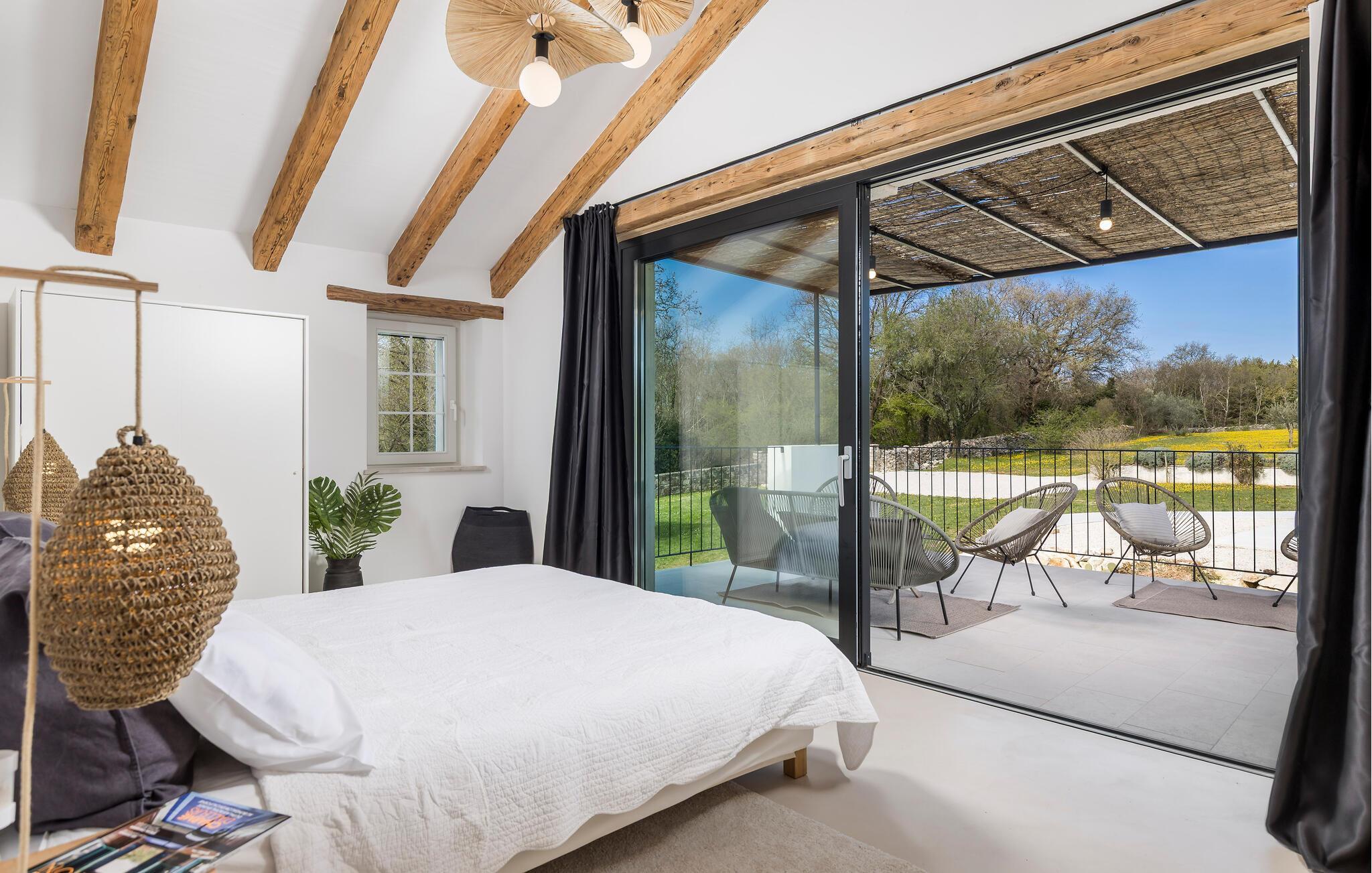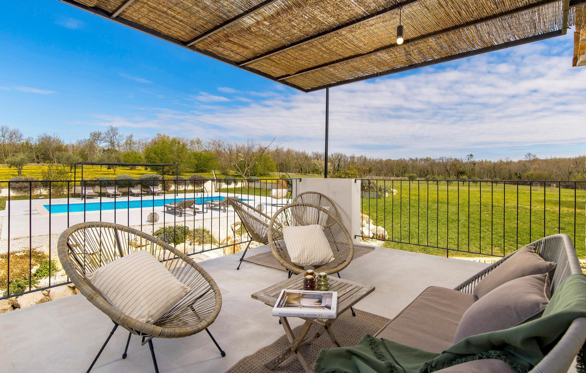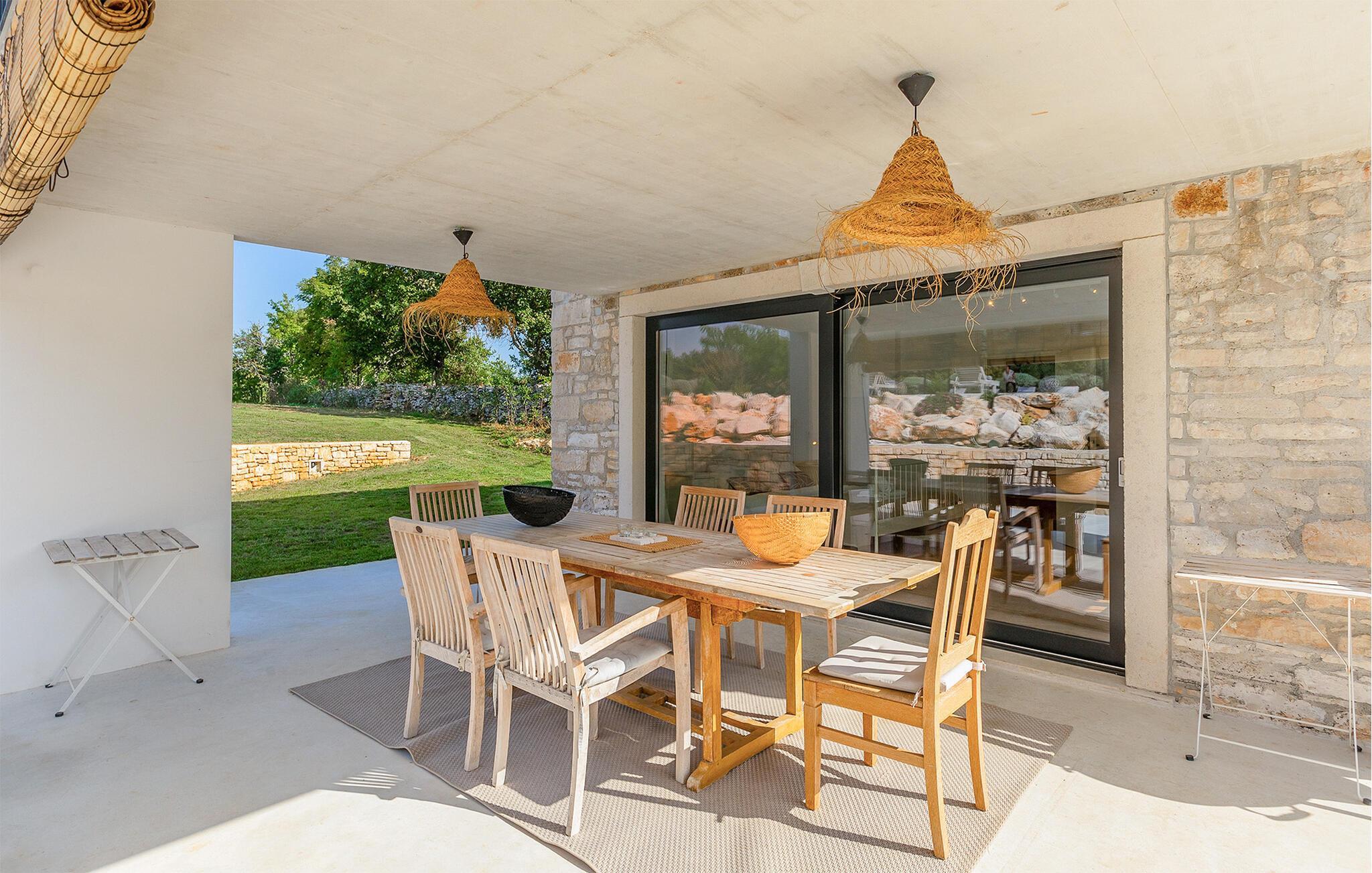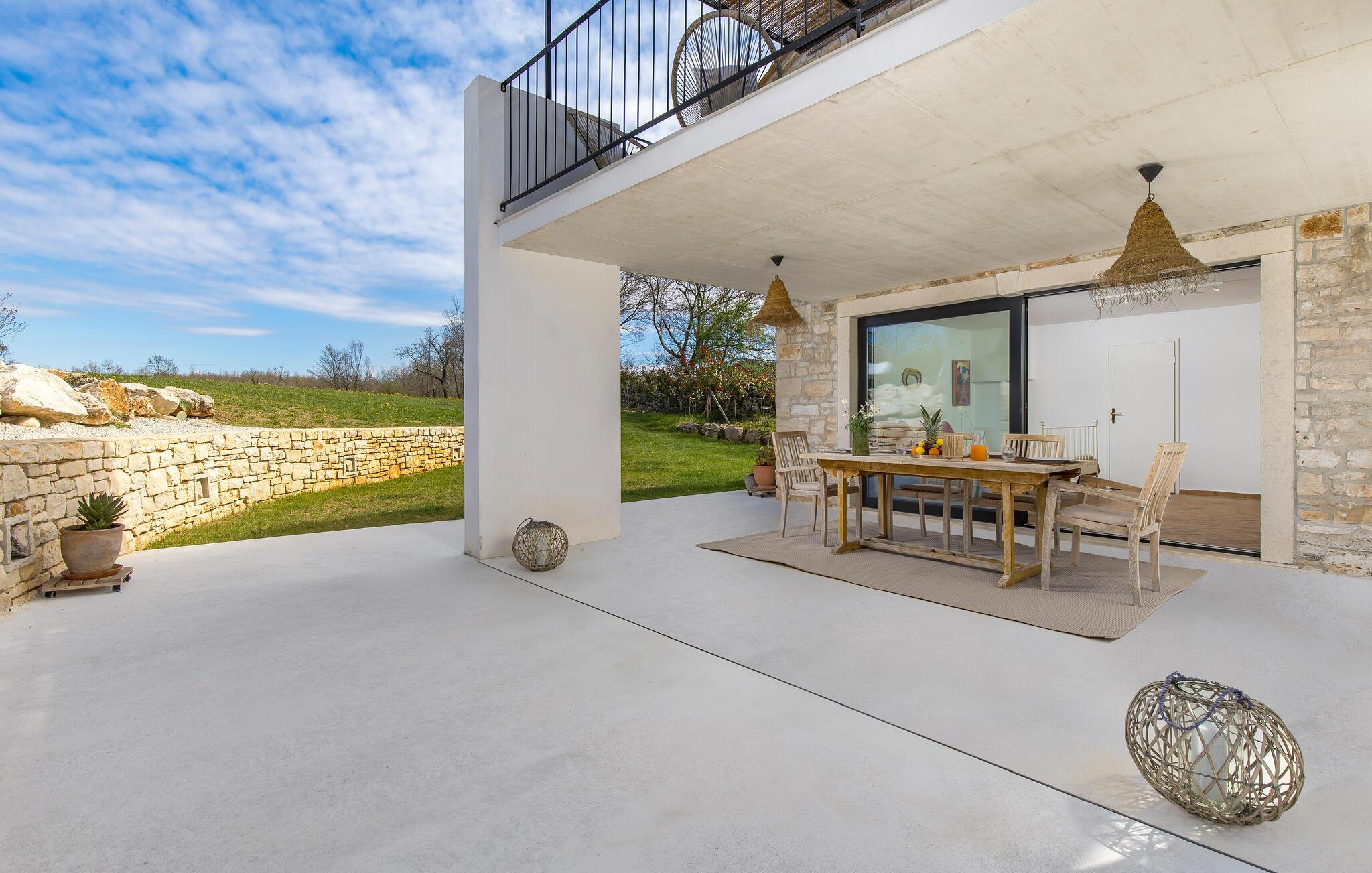 Die moderne überdachte Terrasse im ersten Stock bietet einen herrlichen Blick auf das Feld und seine prächtigen Olivenbäume. Außerdem haben das Schlafzimmer im Erdgeschoss und das obere Schlafzimmer mit der Terrasse sehr große Glaswände, die das Wohngefühl im Freien und natürliches Licht verstärken. In den Abendstunden ist es schön, die wunderschön beleuchtete Umgebung unter dem magischen Sternenhimmel zu genießen. Mit der Villa Natura sind Sie mitten in der Natur, aber nicht zu weit von der nächsten größeren Stadt entfernt - die nächste Küstenstadt ist Porec - nur 20 Autominuten entfernt.