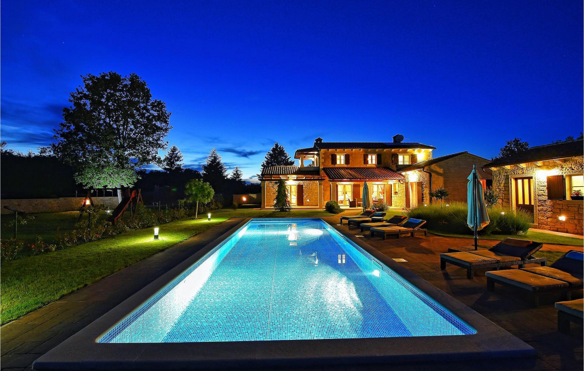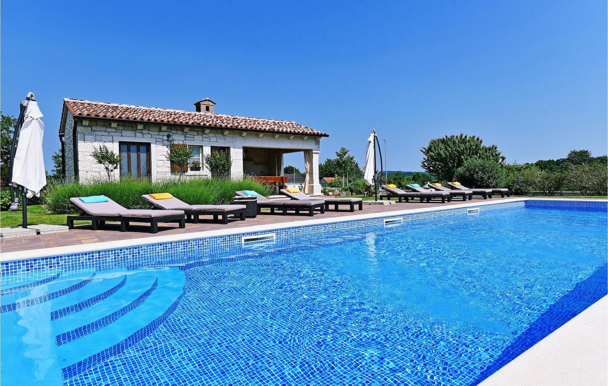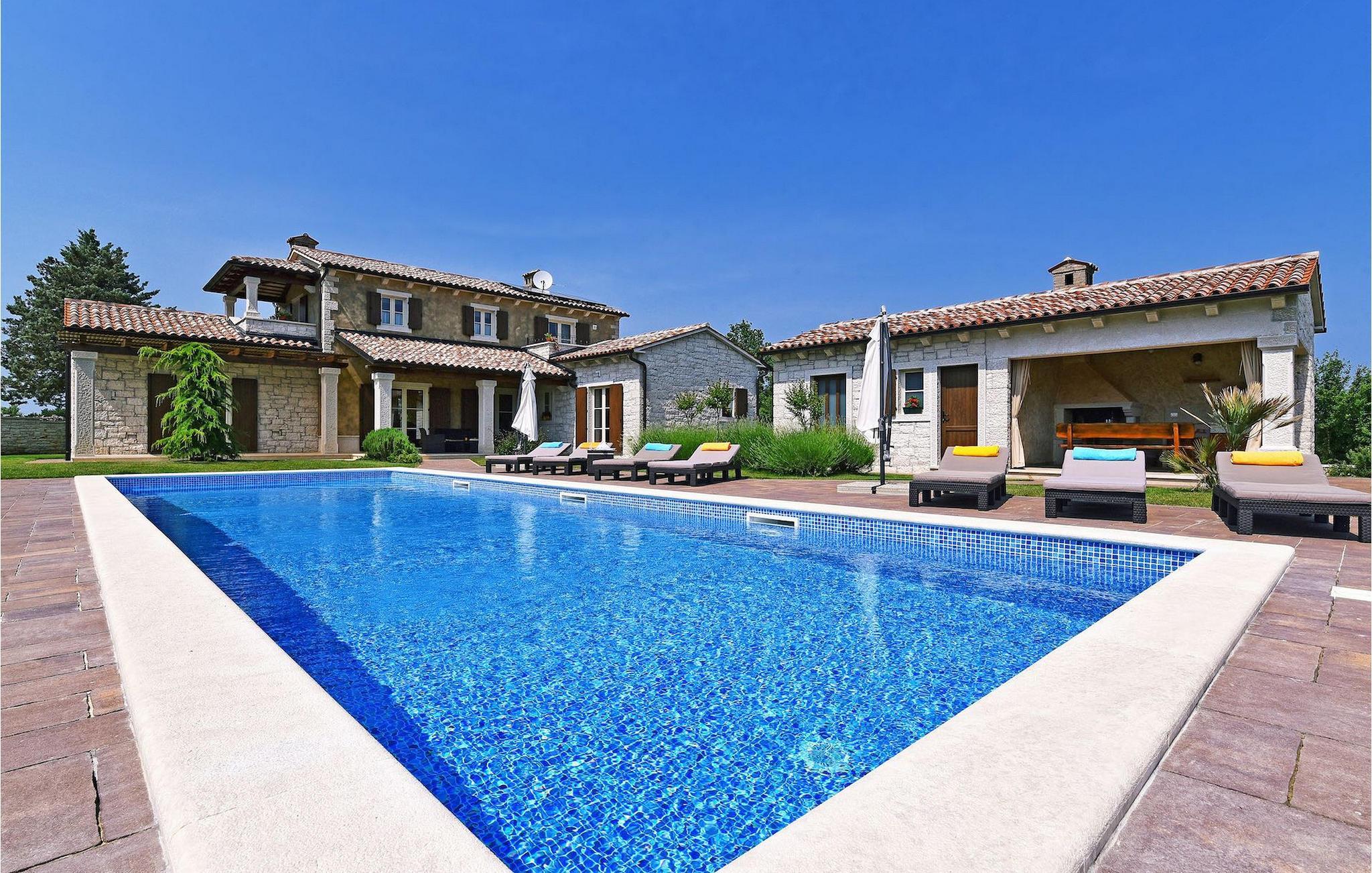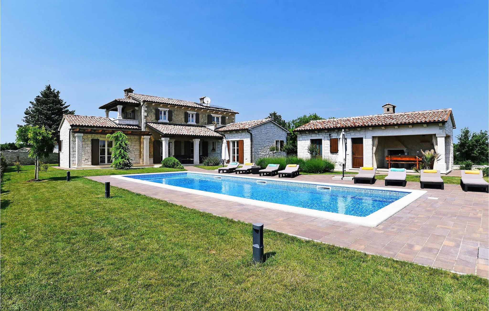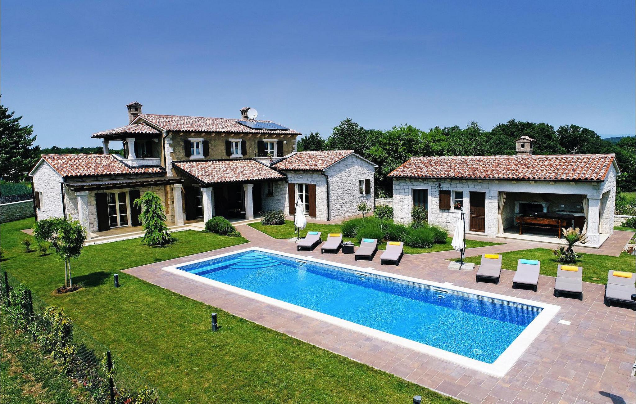 Diese neu erbaute Villa liegt am Rande einer kleinen Istrischen Ortschaft. Sie bietet Ruhe und Erholung, und dennoch ist sie nur einige Autominuten von den Stränden und touristischen Hochburgen entfernt. Im EG gibt es ein großes Wohnzimmer und zwei Ensuite-Schlafzimmer. Im OG gibt es 2 weitere Ensuite-Schlafzimmer. Draußen gibt es einen großen, privaten Pool, einen überdachten Essbereich, Sonnenliegen und einen privaten Parkplatz. Diese klimatisierte Villa liegt inmitten grüner Wiesen und Wälder.