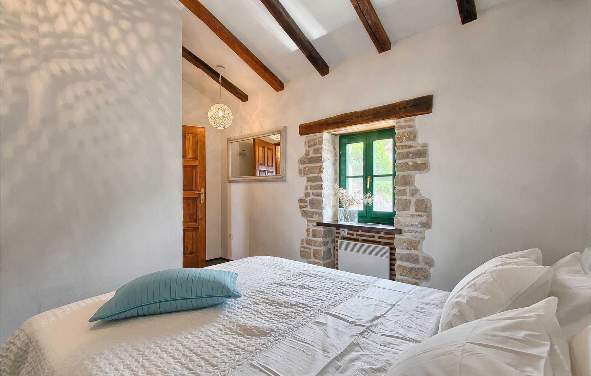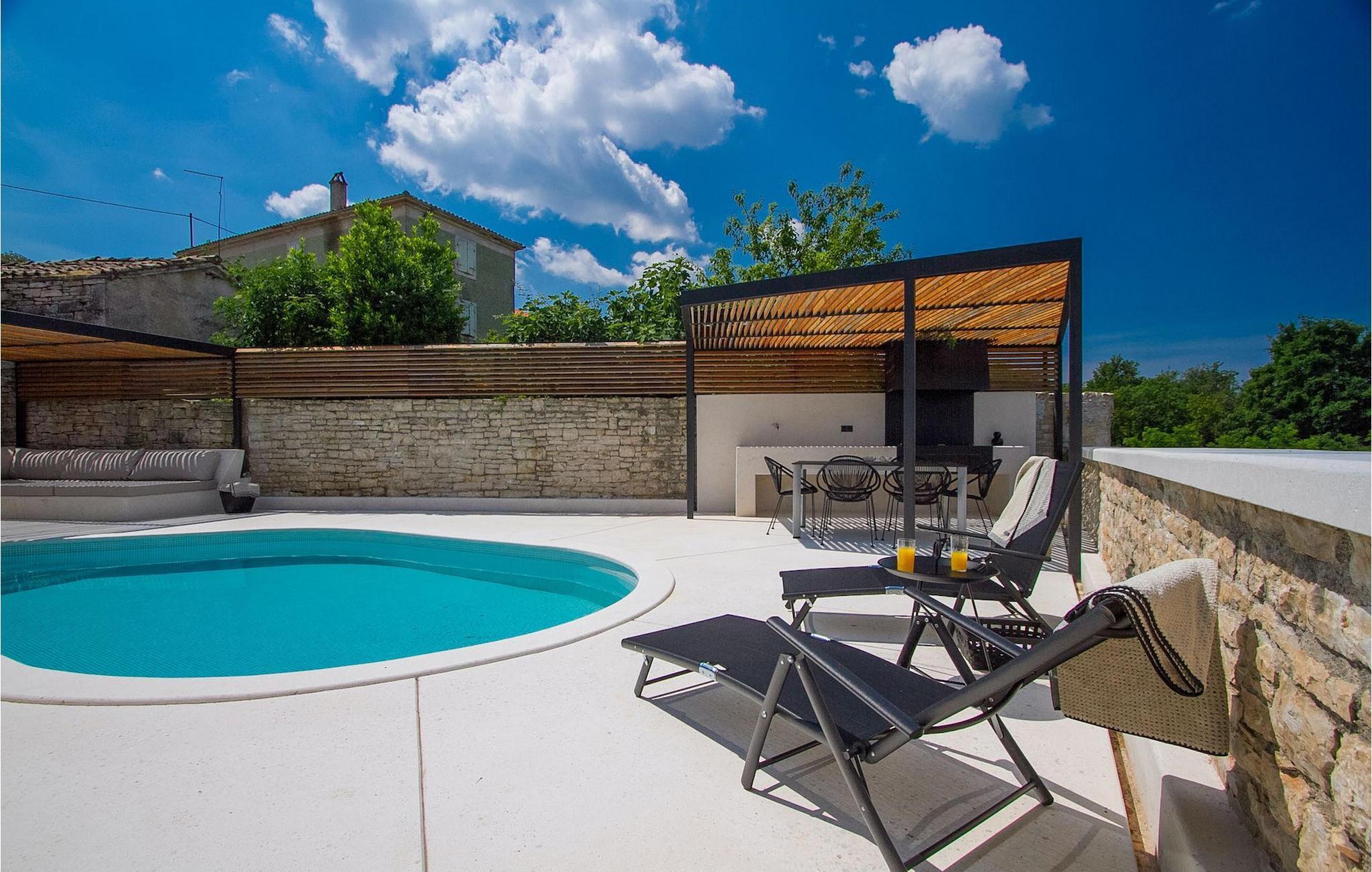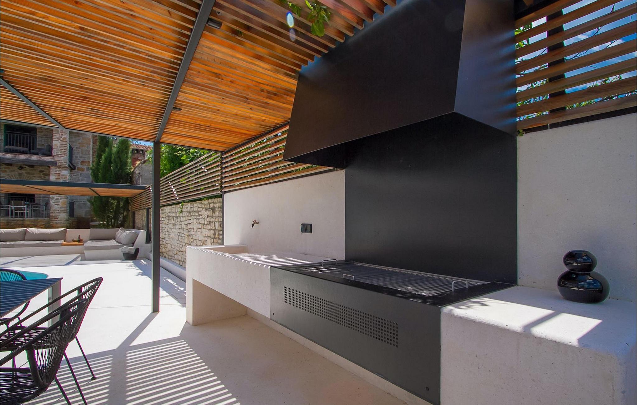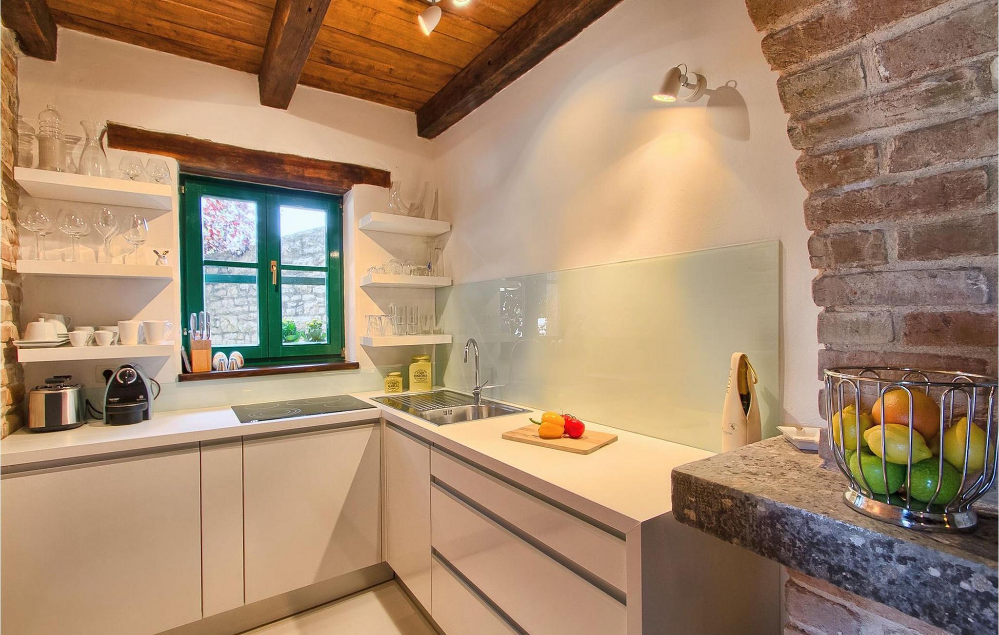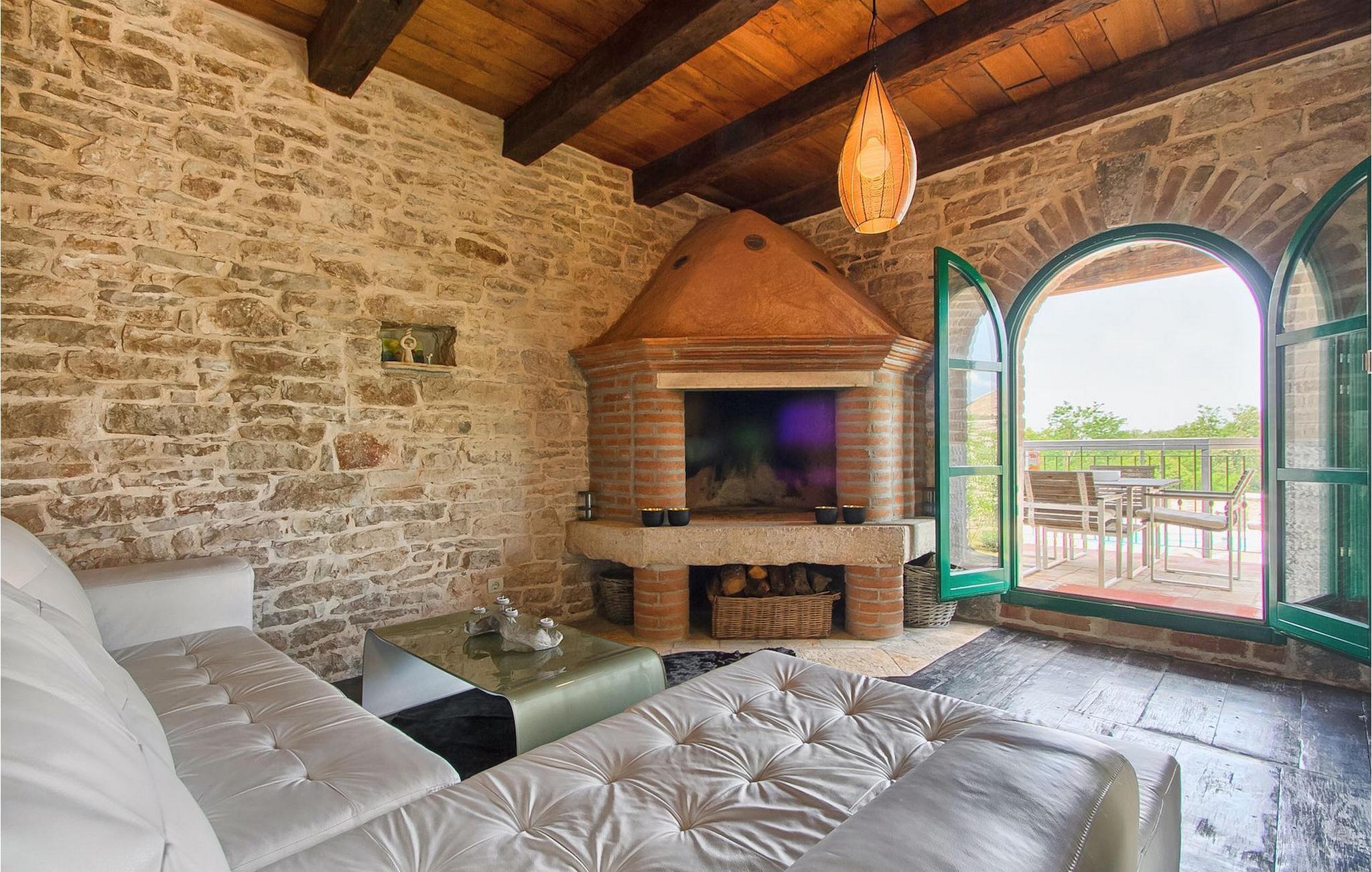 Im Erdgeschoss finden Sie eine voll ausgestattete Küche, Essbereich und ein Wohnzimmer mit Kamin. Im Dachgeschoss befinden sich zwei Schlafzimmer mit Doppelbett und ein Badezimmer. Im Außenbereich befindet sich ein Pool und Außendusche, alle mit einem schönen Garten umgeben. Wenn Sie den ganzen Tag im Freien verbringen möchten, haben Sie eine zusätzliche Sommerküche mit Grill und Terrasse zur Verfügung. Die große Couch auf der Terrasse ist ein schöner gemütlicher Ort, wo Sie das milde Klima Istriens genießen können, während Sie einen erfrischenden Cocktail schlürfen. Falls Sie keine Lust haben, einkaufen zu gehen, ist es gut zu wissen, dass ein mobiler Laden (weißer Lieferwagen mit Lebensmitteln) regelmäßig in das Dorf kommt. Dort ist es möglich, einige Lebensmittel zu bestellen, die bereits am darauffolgendem Tag geliefert werden können.
