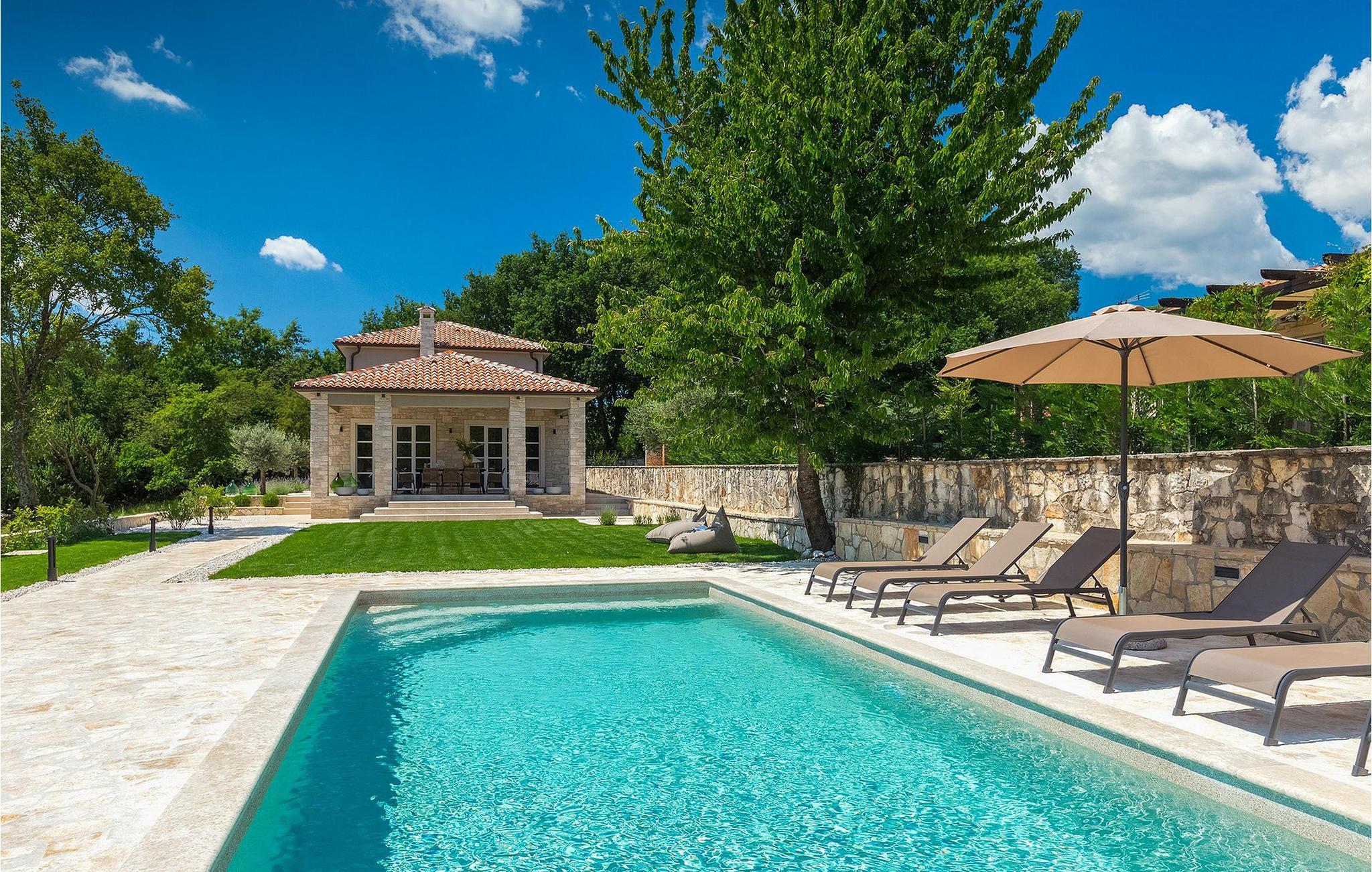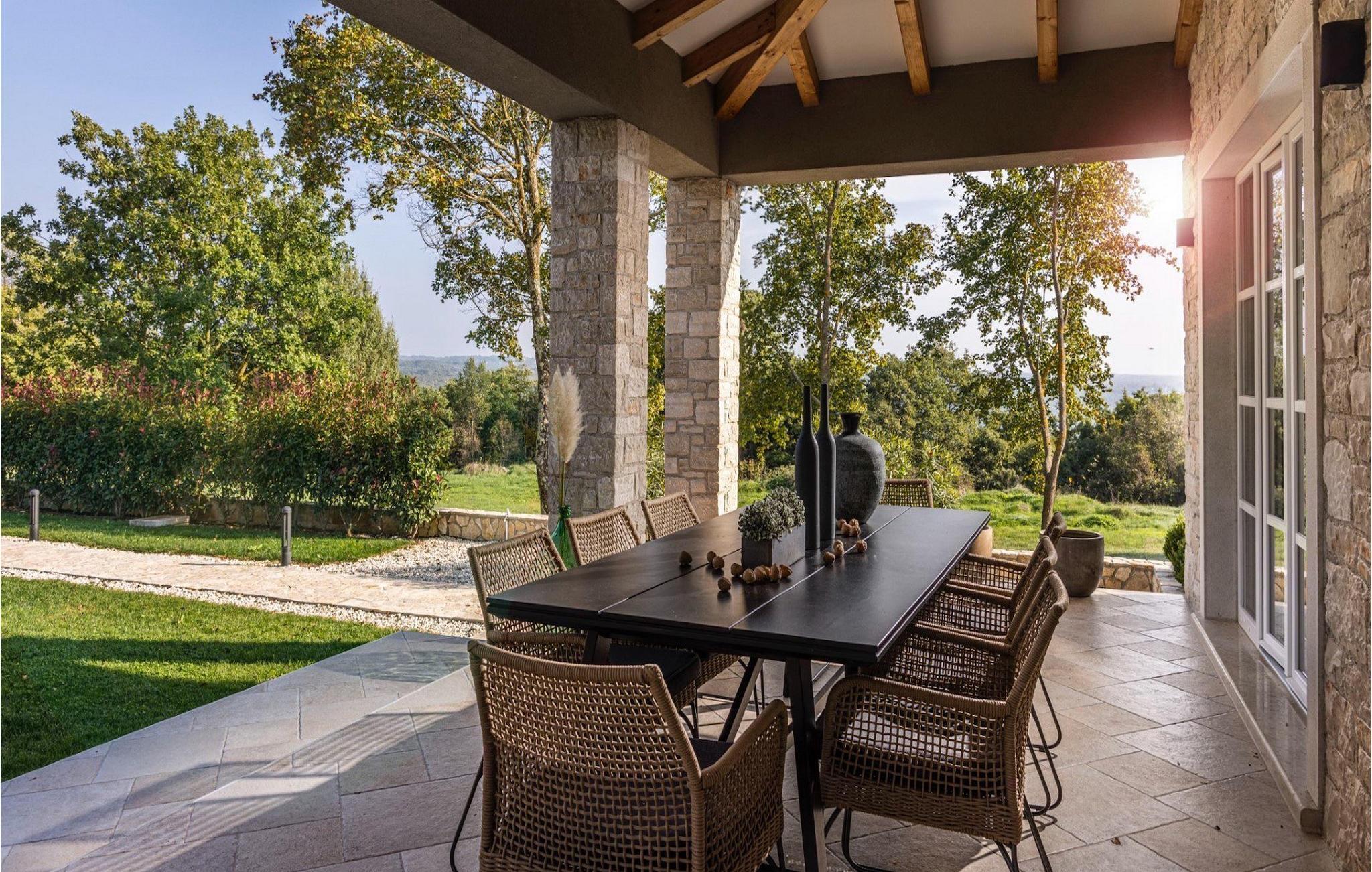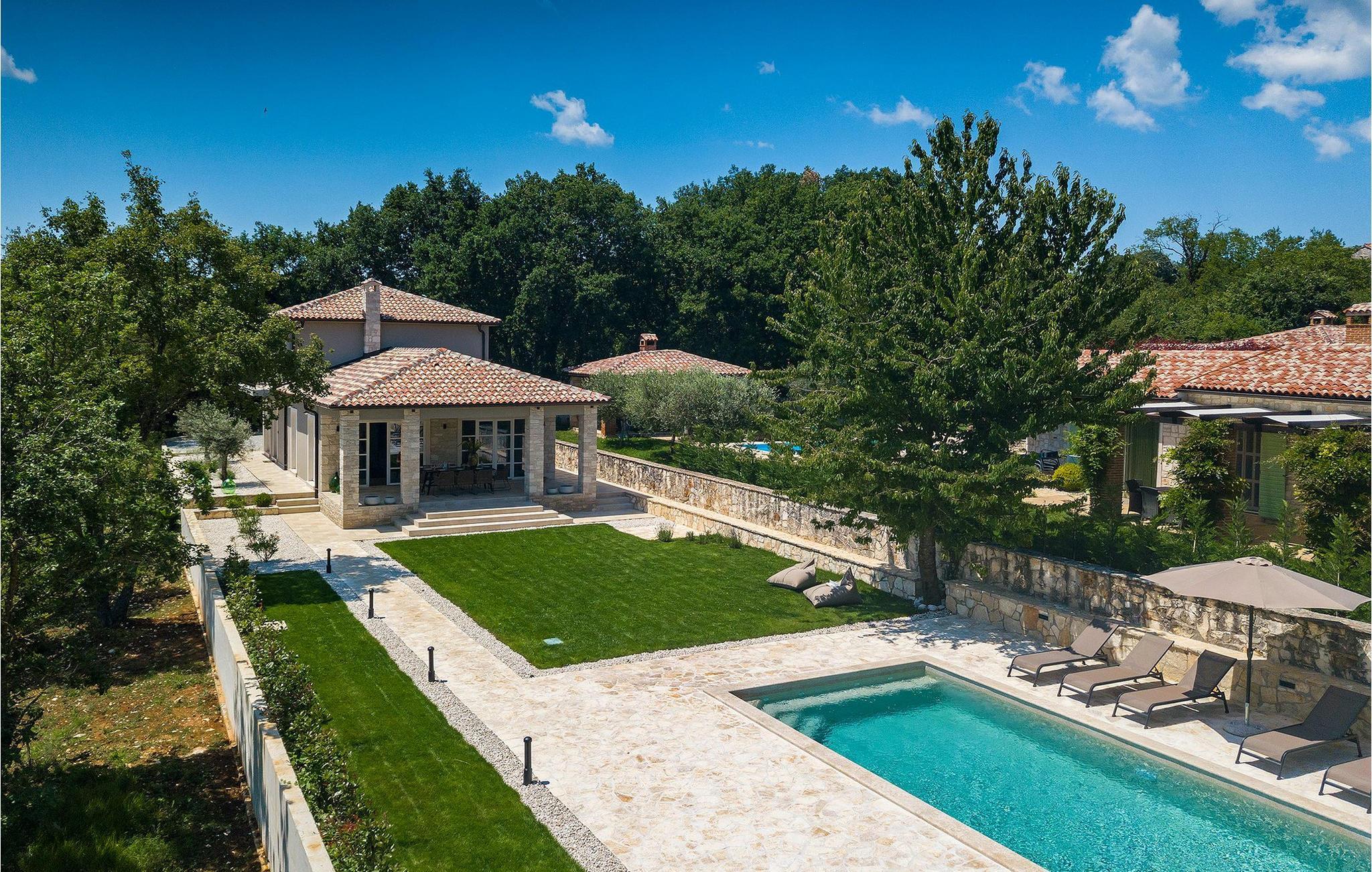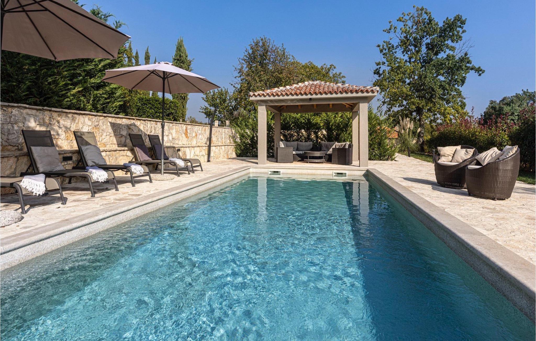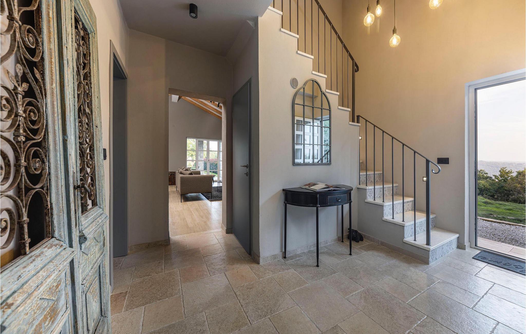 Villa Faturi ist eine moderne Steinvilla mit privatem Pool, wunderschönem Panoramablick und schön gepflegtem Garten. Das Interieur der Villa ist modern und mit Liebe zum Detail gestaltet. Im Erdgeschoss befinden sich ein geräumiges Wohnzimmer, ein Esszimmer und eine Küche. Außerdem gibt es zwei Schlafzimmer mit Doppelbetten und zwei Badezimmer. Im ersten Stock sind zwei Schlafzimmer und ein Badezimmer sowie ein Balkon mit Blick auf die Umgebung. Im Garten der Villa befindet sich eine Terrasse mit Blick auf Pool und Garten. Hier können Sie im Freien eine köstliche Mahlzeit genießen. Der große private Pool dient zur Erfrischung an heißen Sommertagen. Die Liegestühle run dum den Pool herum laden zur Entspannung ein. Gartenpflege findet jeden Donnerstag statt.Die Villa befindet sich in einer ruhigen Umgebung in der Nähe des Dorfes Kringa. Kringa liegt in Zentralistrien und ist nur fünf Kilometer von Tinjan entfernt, dem zweitgrößten Ort in der Gemeinde Tinjan. Auf dem Gebiet des Dorfes Tinjan befand sich einst in der Eisenzeit eine Siedlung, die sich später zu einer römischen Festung entwickelte. In der hügeligen Umgebung gibt es weitere Ortschaften. Die wunderschöne Landschaft dieser Region eignet sich hervorragend zum Reiten, Radfahren und Spazierengehen. In der Nähe befinden sich das schöne Porec und viele bezaubernde istrische Strände. Außerdem gibt es zahlreiche historische Stätten und andere Sehenswürdigkeiten zu erkunden. Aus Porec aus können Sie dem Boot einen Ausflug nach Venedig machen. Nur 45 Minuten von der Villa entfernt liegen Pula, die größte Stadt Istriens, und der Nacional Park Brijuni. Die Lage der Villa Faturi ist ideal für einen erholsamen Urlaub in Zentralistrien.