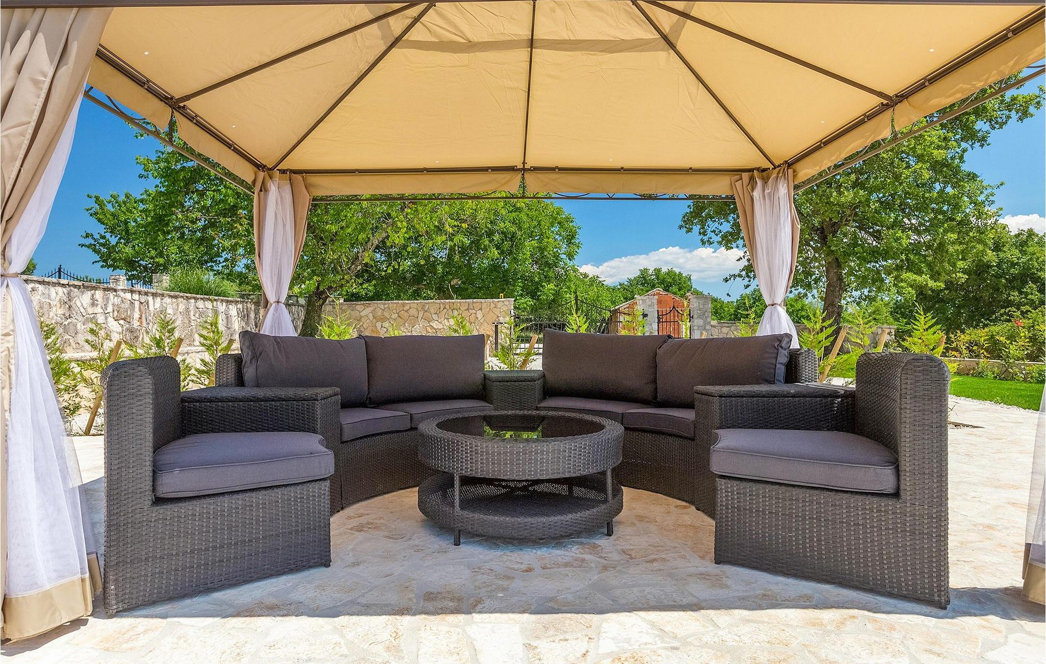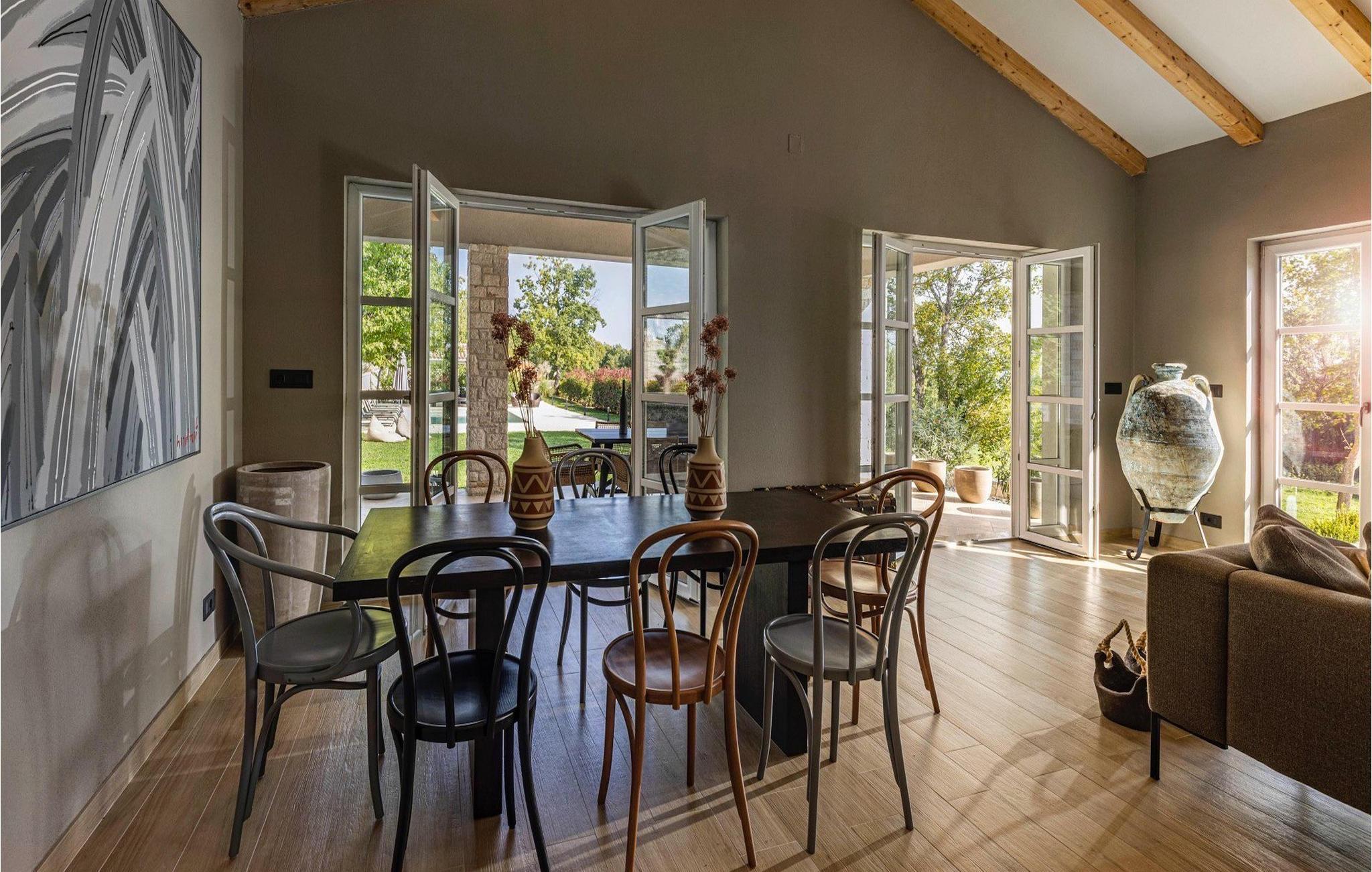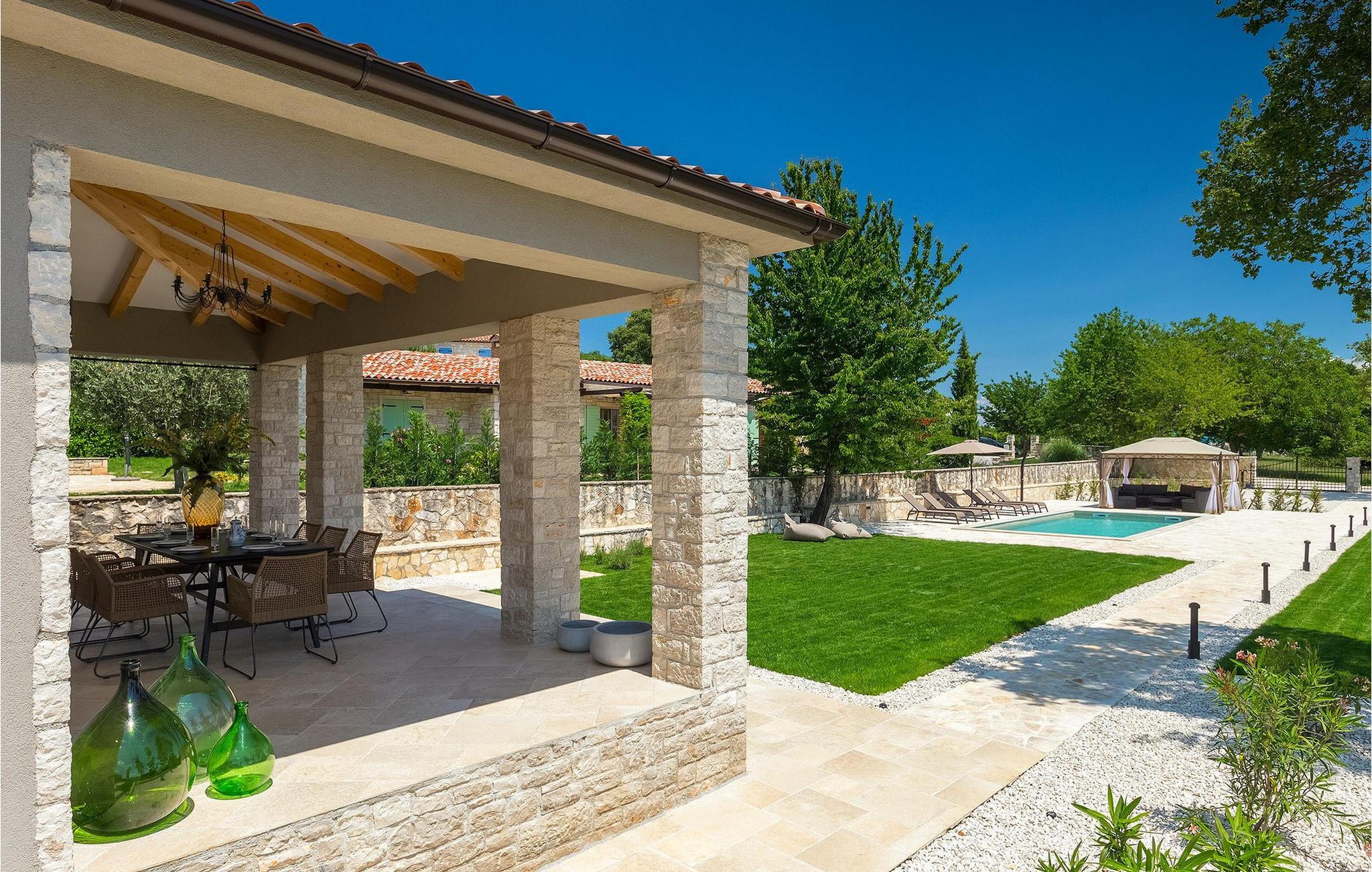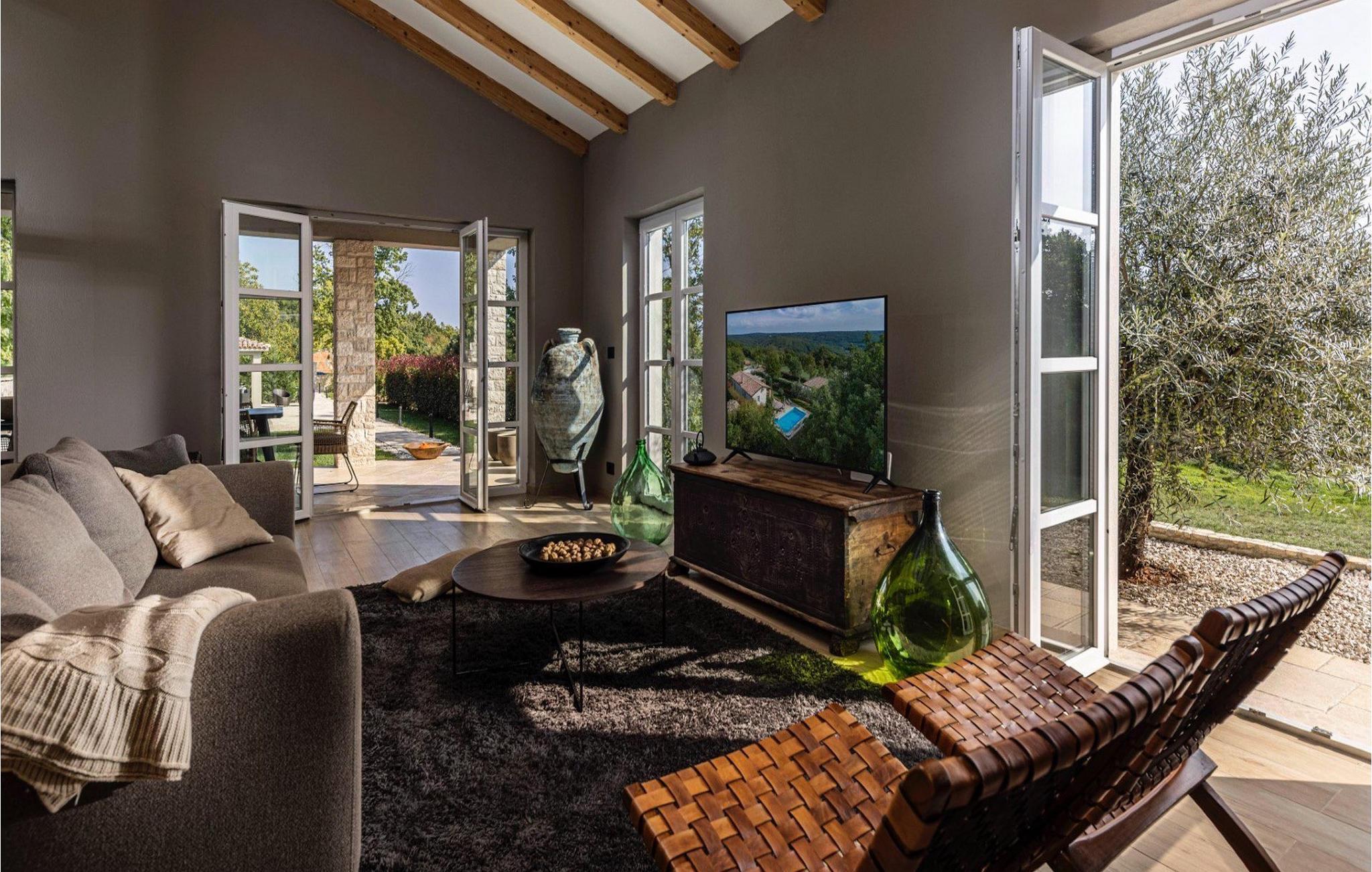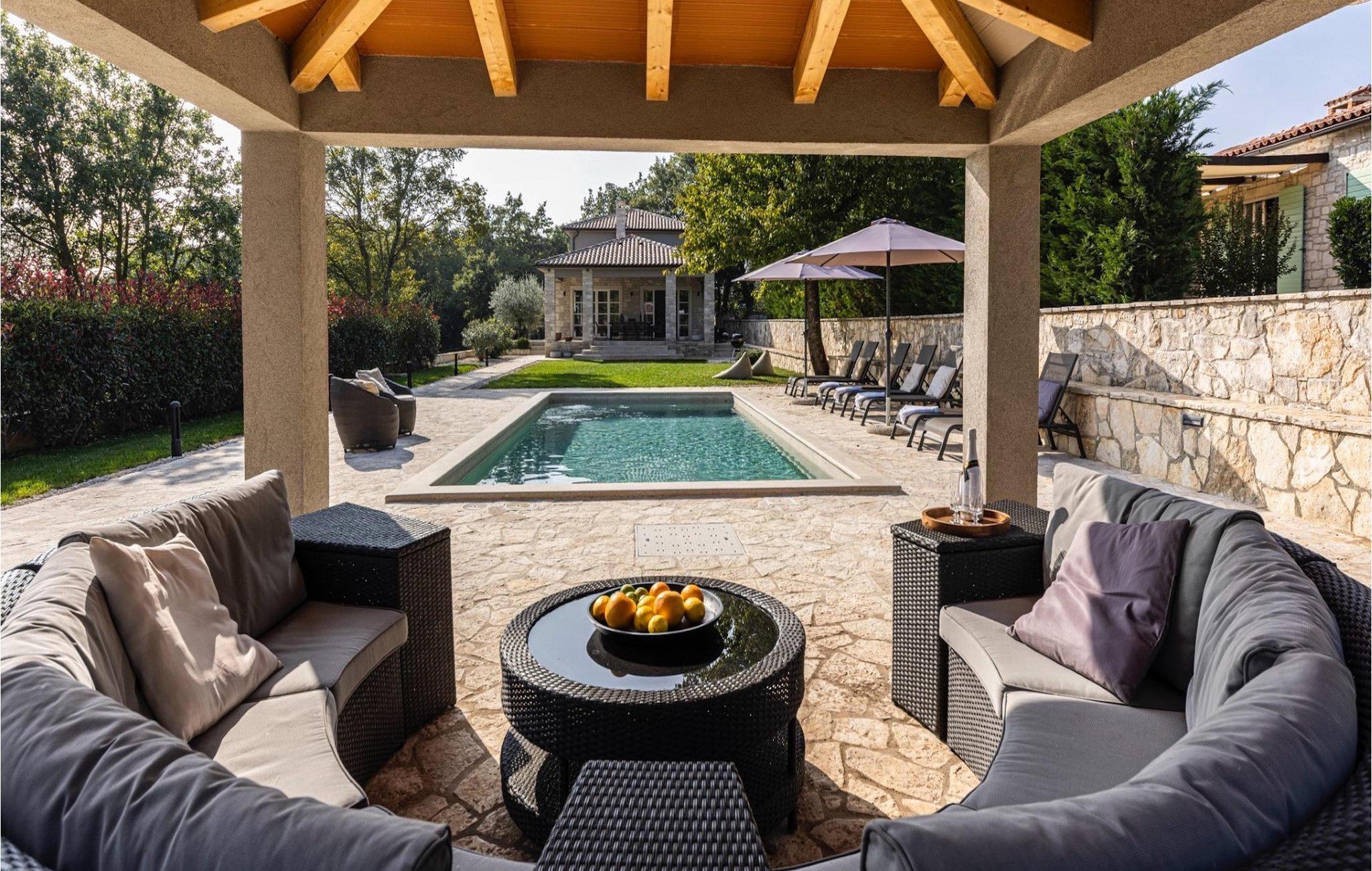 Villa Faturi ist eine moderne Steinvilla mit privatem Pool, wunderschönem Panoramablick und schön gepflegtem Garten. Das Interieur der Villa ist modern und mit Liebe zum Detail gestaltet. Im Erdgeschoss befinden sich ein geräumiges Wohnzimmer, ein Esszimmer und eine Küche. Außerdem gibt es zwei Schlafzimmer mit Doppelbetten und zwei Badezimmer. Im ersten Stock sind zwei Schlafzimmer und ein Badezimmer sowie ein Balkon mit Blick auf die Umgebung. Im Garten der Villa befindet sich eine Terrasse mit Blick auf Pool und Garten. Hier können Sie im Freien eine köstliche Mahlzeit genießen. Der große private Pool dient zur Erfrischung an heißen Sommertagen. Die Liegestühle run dum den Pool herum laden zur Entspannung ein. Gartenpflege findet jeden Donnerstag statt.Die Villa befindet sich in einer ruhigen Umgebung in der Nähe des Dorfes Kringa. Kringa liegt in Zentralistrien und ist nur fünf Kilometer von Tinjan entfernt, dem zweitgrößten Ort in der Gemeinde Tinjan. Auf dem Gebiet des Dorfes Tinjan befand sich einst in der Eisenzeit eine Siedlung, die sich später zu einer römischen Festung entwickelte. In der hügeligen Umgebung gibt es weitere Ortschaften. Die wunderschöne Landschaft dieser Region eignet sich hervorragend zum Reiten, Radfahren und Spazierengehen. In der Nähe befinden sich das schöne Porec und viele bezaubernde istrische Strände. Außerdem gibt es zahlreiche historische Stätten und andere Sehenswürdigkeiten zu erkunden. Aus Porec aus können Sie dem Boot einen Ausflug nach Venedig machen. Nur 45 Minuten von der Villa entfernt liegen Pula, die größte Stadt Istriens, und der Nacional Park Brijuni. Die Lage der Villa Faturi ist ideal für einen erholsamen Urlaub in Zentralistrien.