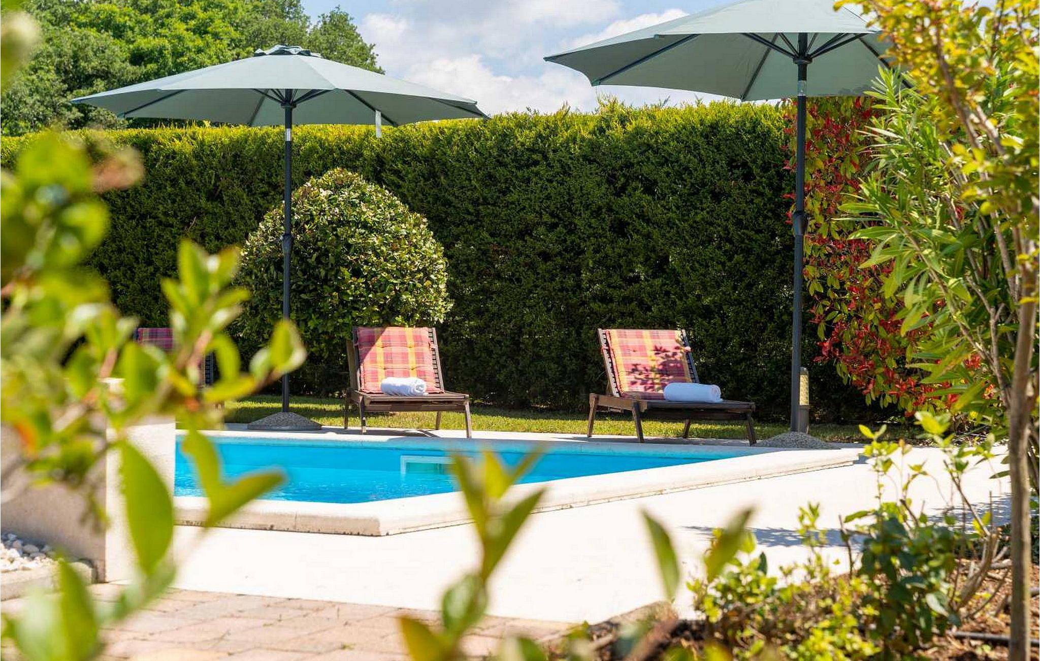 Villa für 6 Personen mit einer Wohnfläche von 144 qm - im Erdgeschoss befindet sich eine vollkommen ausgestattete Küche/Speiseraum mit Tisch für 8 Personen, Wohnzimmer mit Kamin, SAT-TV, ein Doppelzimmer mit eigener Dusche/WC, ein separates WC, überdachte Terrasse mit Sitzgarnitur und Blick auf den Pool. Im ersten Stock befinden sich 2 Doppelzimmer, eines mit Dusche/WC und SAT-TV, und eines mit Bad/WC.