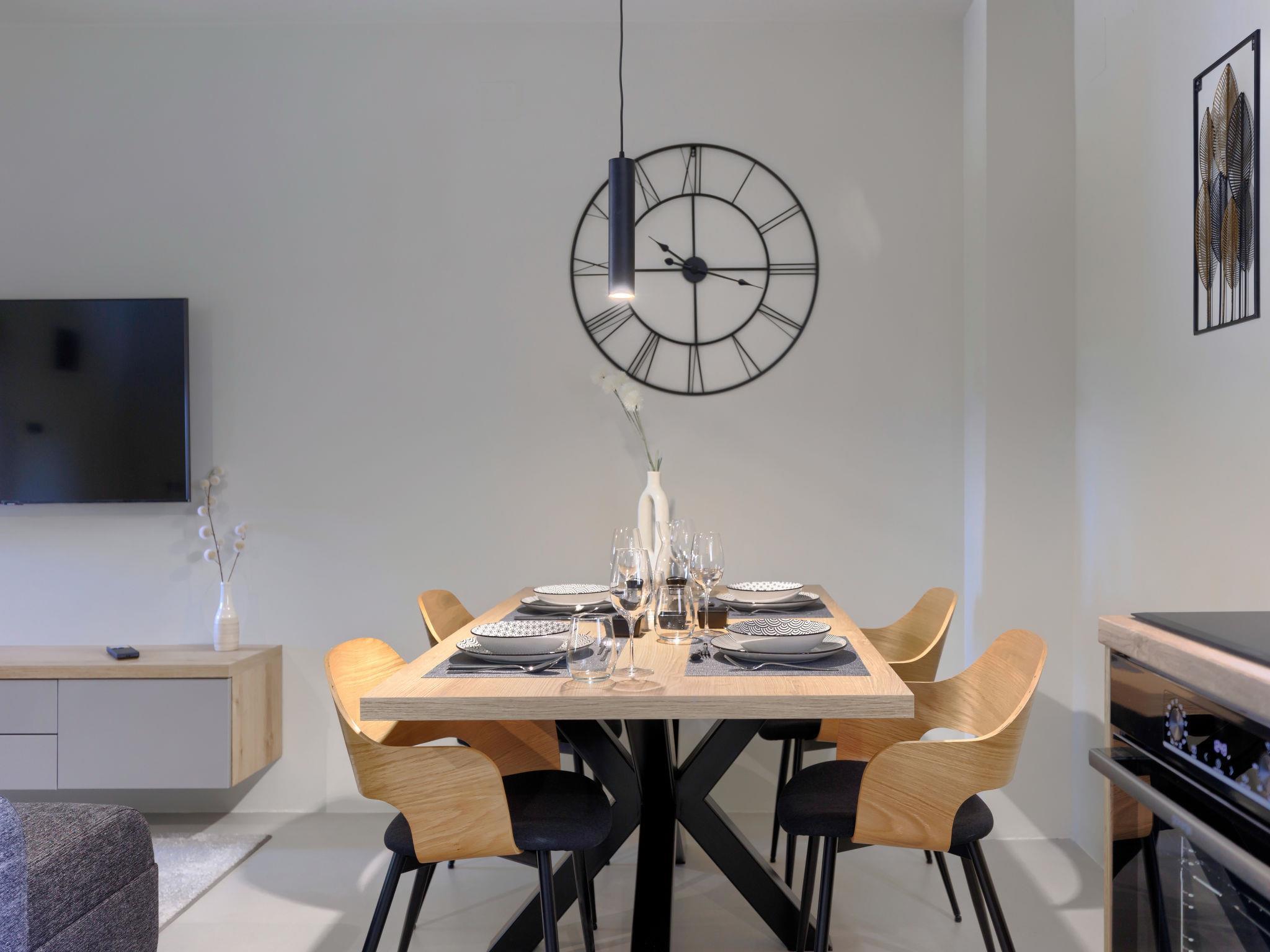 3-Zimmer-Reihenhaus 109 m2 auf 3 Stockwerken. Sehr schön und geschmackvoll eingerichtet: 1 offenes Zimmer mit 1 franz. Bett (160 cm, Länge 200 cm), Dusche/WC und Klimaanlage. Ausgang zum Schwimmbad. Obergeschoss: Wohn-/Esszimmer mit Sat-TV (Flachbildschirm), Klimaanlage. Offene Küche (Backofen, Geschirrspüler, 4 Induktionskochplatten, Toaster, Wasserkocher, Mikrowelle, Tiefkühler, elektrische Kaffeemaschine). Dachgeschoss: 1 abgeschrägtes, offenes Zimmer, Deckenhöhe 180 - 250 cm mit 1 franz. Bett (160 cm, Länge 200 cm), Dusche/WC und Klimaanlage. Heizung. Elektrogrill, Liegestühle. Sicht auf das Schwimmbad. Zur Verfügung: Safe, Bügeleisen, Fliegengitter, Babybett, Haartrockner. Internet (Wireless LAN, gratis).