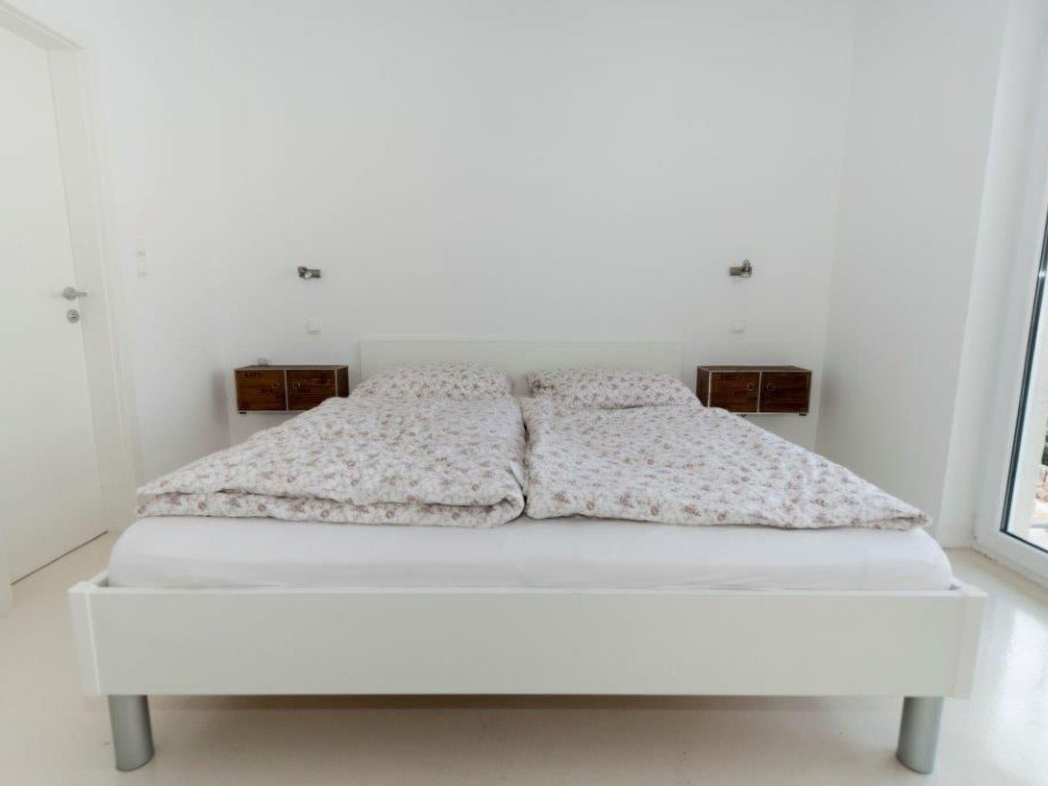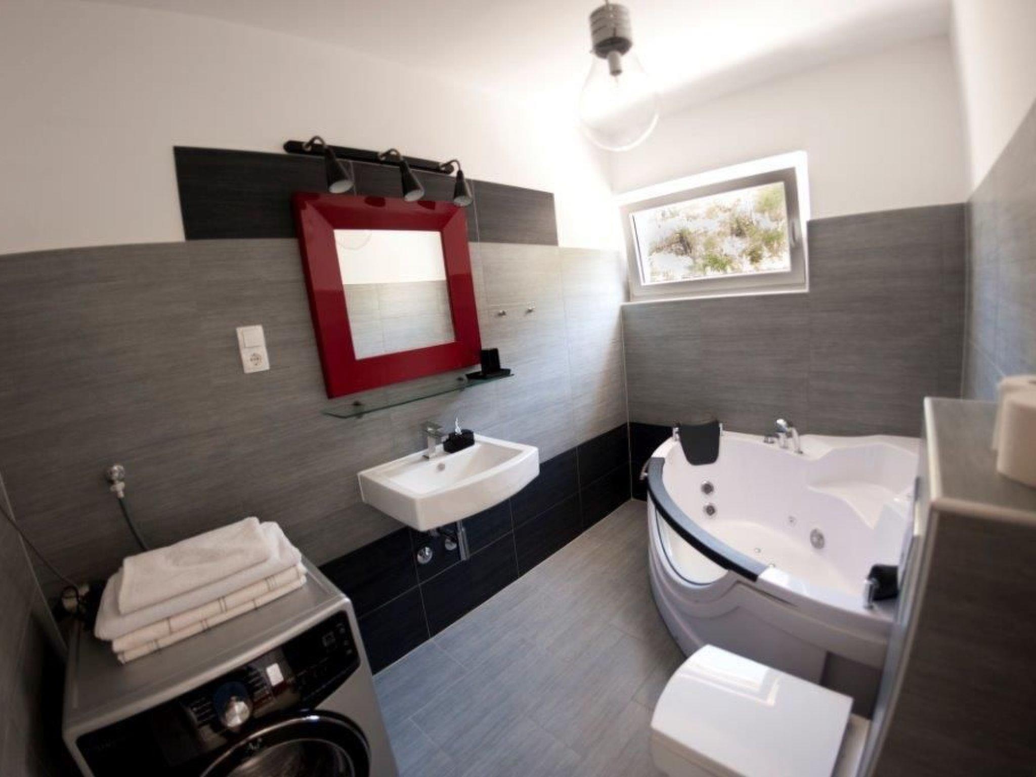 Diese großzügige 98 m² große Ferienwohnung mit Klimaanlage (kühl/warm) nimmt das gesamte Dachgeschoss der Villa ein. Sie besteht aus einem tageslichtdurchfluteten Wohn- und Esszimmer mit integrierter, offener Einbauküche, zwei Schlafzimmern und zwei sehr modernen Bädern. Das Wohnzimmer verfügt über ein bequemes Sofa und zwei stilvolle Designersessel, einen gläsernen Couchtisch, einen an der Wand montierten Flachbildfernseher (Kabel- und Satellitenprogramme, USB-Anschluss, DVD-Player), eine Stereoanlage und einen offenen Kamin. Brennholz ist reichlich vorhanden. Es gibt einen angrenzenden Essbereich mit einem Esstisch und vier Stühlen. Gleich nebenan befindet sich eine voll ausgestattete, weiße Hochglanzküche mit den neuesten Geräten wie Spülmaschine, Cerankochfeld mit elegantem Edelstahl-Dunstabzug, Elektrobackofen, Kühlschrank mit Gefrierfach, Wasserkocher, Toaster und Kaffeemaschine. Eines der beiden Schlafzimmer verfügt über ein Doppelbett mit den Maßen 180 x 200 cm, das andere über ein Doppelbett mit den Maßen 180 x 200 cm. Beide Schlafzimmer verfügen über Nachttische mit Leselampen und Schränke mit reichlich Stauraum für Kleidung und Gepäck. Von den Betten aus können Sie den weiten Blick über die Bucht und das Meer genießen. Das Sofa im Wohnzimmer kann in ein zusätzliches Bett für eine weitere Person umgewandelt werden. Von den zwei Badezimmern verfügt eines über eine geräumige Duschkabine und eines über eine Eckbadewanne mit Duschvorrichtung, beide haben ein Waschbecken mit Wandspiegel und eine Toilette. Eine Waschmaschine und ein kostenloser und zuverlässiger drahtloser Internetzugang sind vorhanden. Wenn Sie mit dem Auto anreisen, dann gibt es einen sicheren Parkplatz direkt vor der Villa.