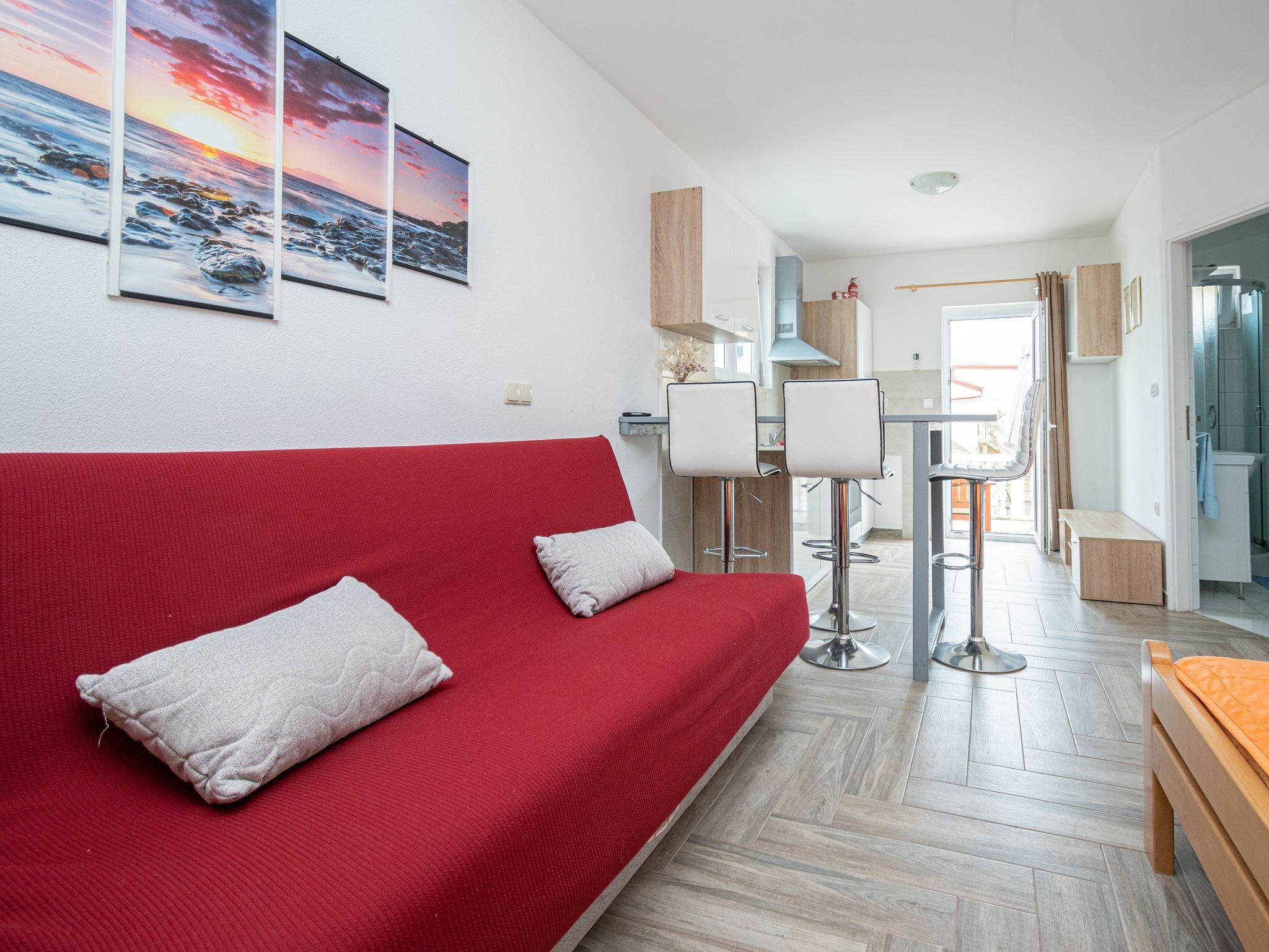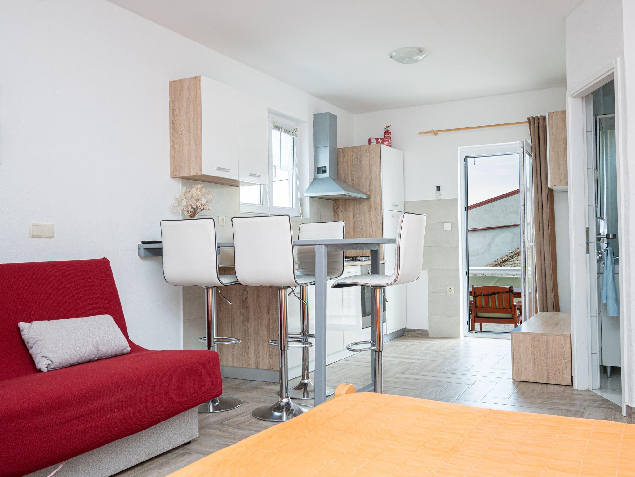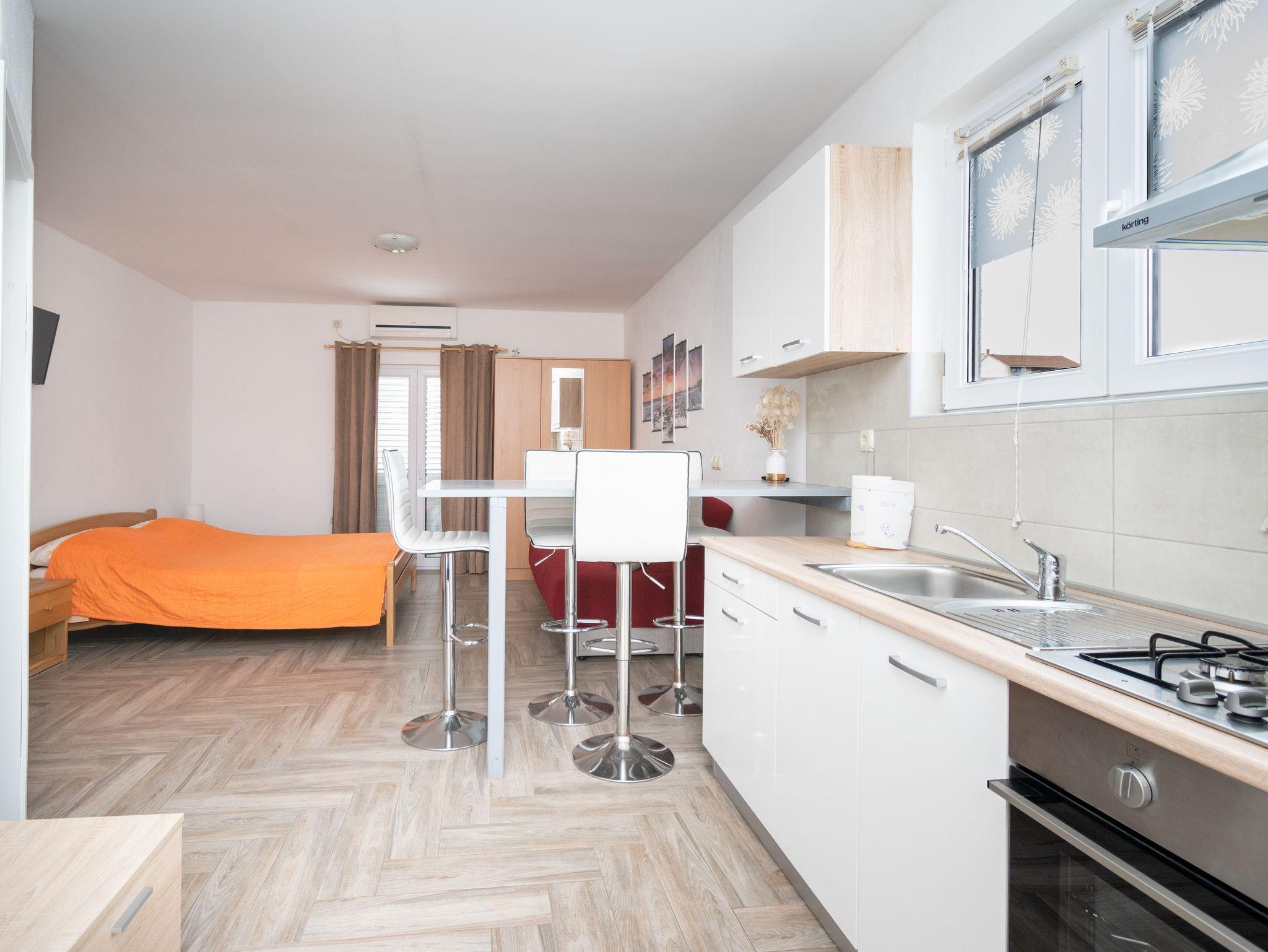 Studio bietet Platz für 3 Gäste. Die Betten sind in Schlafzimmern, die es 1 gibt, innerhalb einer Gesamtfläche von 26m2, angeordnet. Die Gäste haben eine eigene Terrasse zur Verfügung, auf der sie in warmen Sommernächten genießen können. Das Studio-Apartment bietet Meerblick. Es ist erlaubt, Speisen auf dem Gemeinschafts-Grill vorzubereiten. IM PREIS INBEGRIFFEN: Kurtaxe, Endreinigung, Klimatisierung, Parkplatz, Internet, tragbarer Grill. VERBINDLICHE ZUSÄTZLICHE KOSTEN: Aufzahlung für Kurzaufenthalte (prozentualer Zuschlag pro Nächtigungsanzahl: 30% - 1, 20% - 2, 10% - 3). Die Verfügbarkeit zusätzlicher Dienstleistungen in Ihrem reservierten Termin und die Preise derselben (falls nicht aufgeführt) müssen im Voraus überprüft werden. Zusätzliche Dienstleistungen die in der Zahlungsaufforderung nicht aufgeführt sind werden direkt beim Vermieter bezahlt, angenommen der Gast nutzt auch diese. Ermäßigung auf den Grundpreis: Gratistag 14=13 (bei einem Aufenthalt von 14 Tagen oder mehr erhalten Sie einen Gratistag für den Aufenthalt bis 31.12.26).
