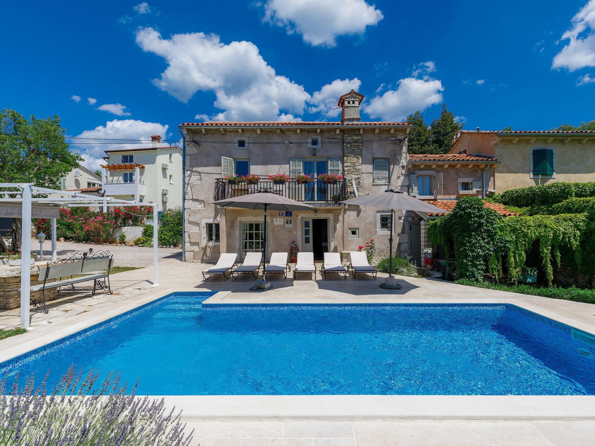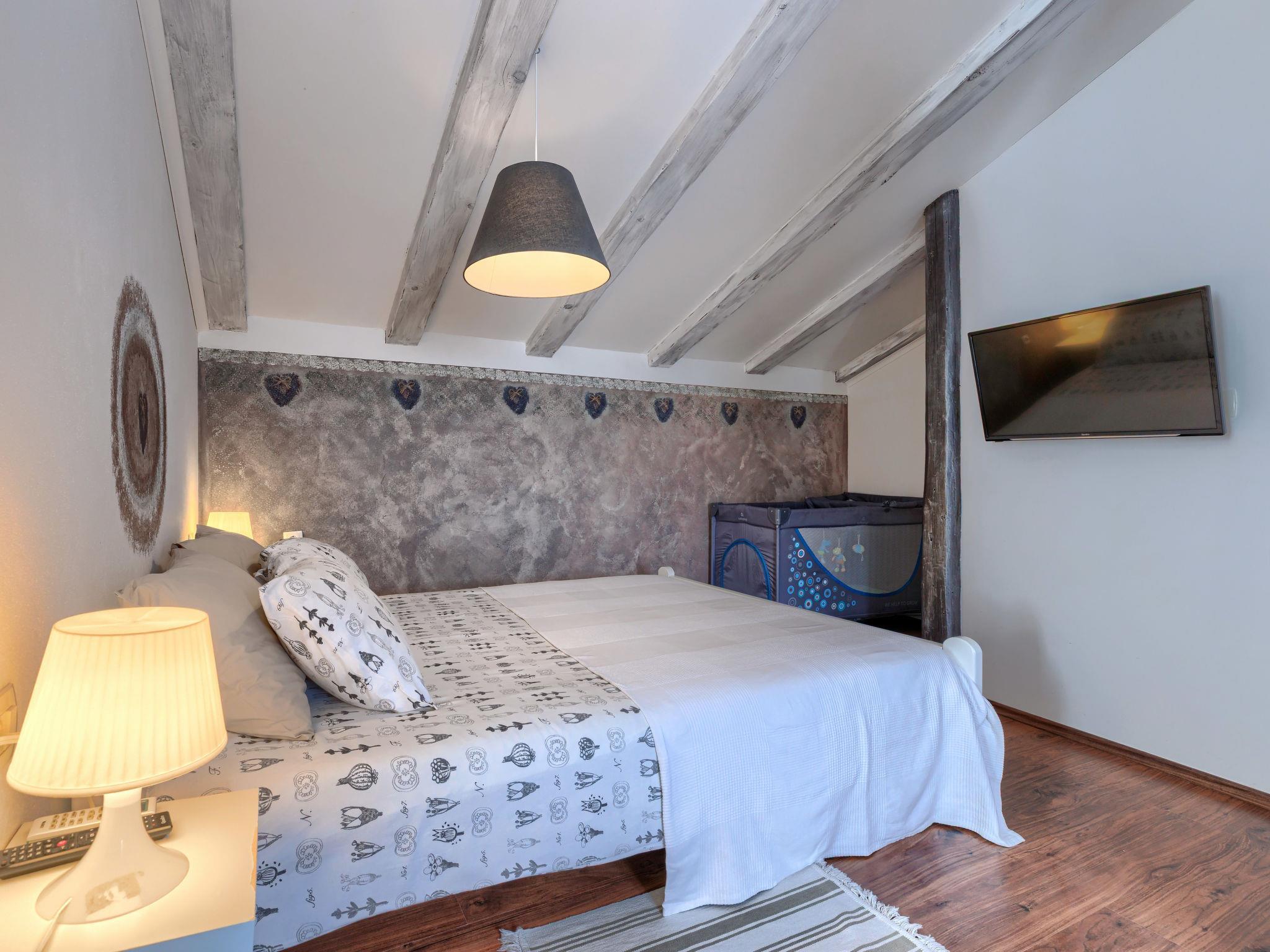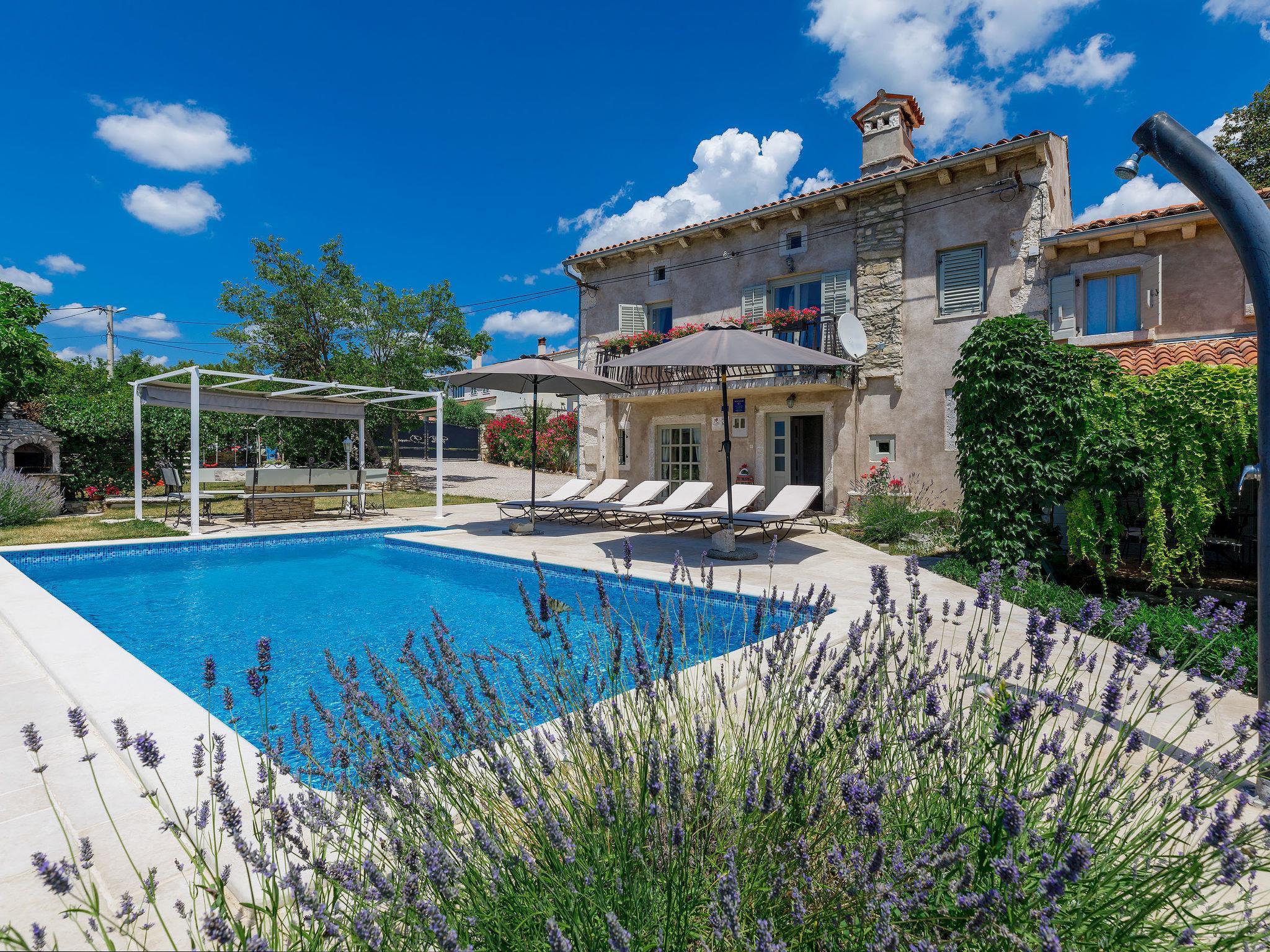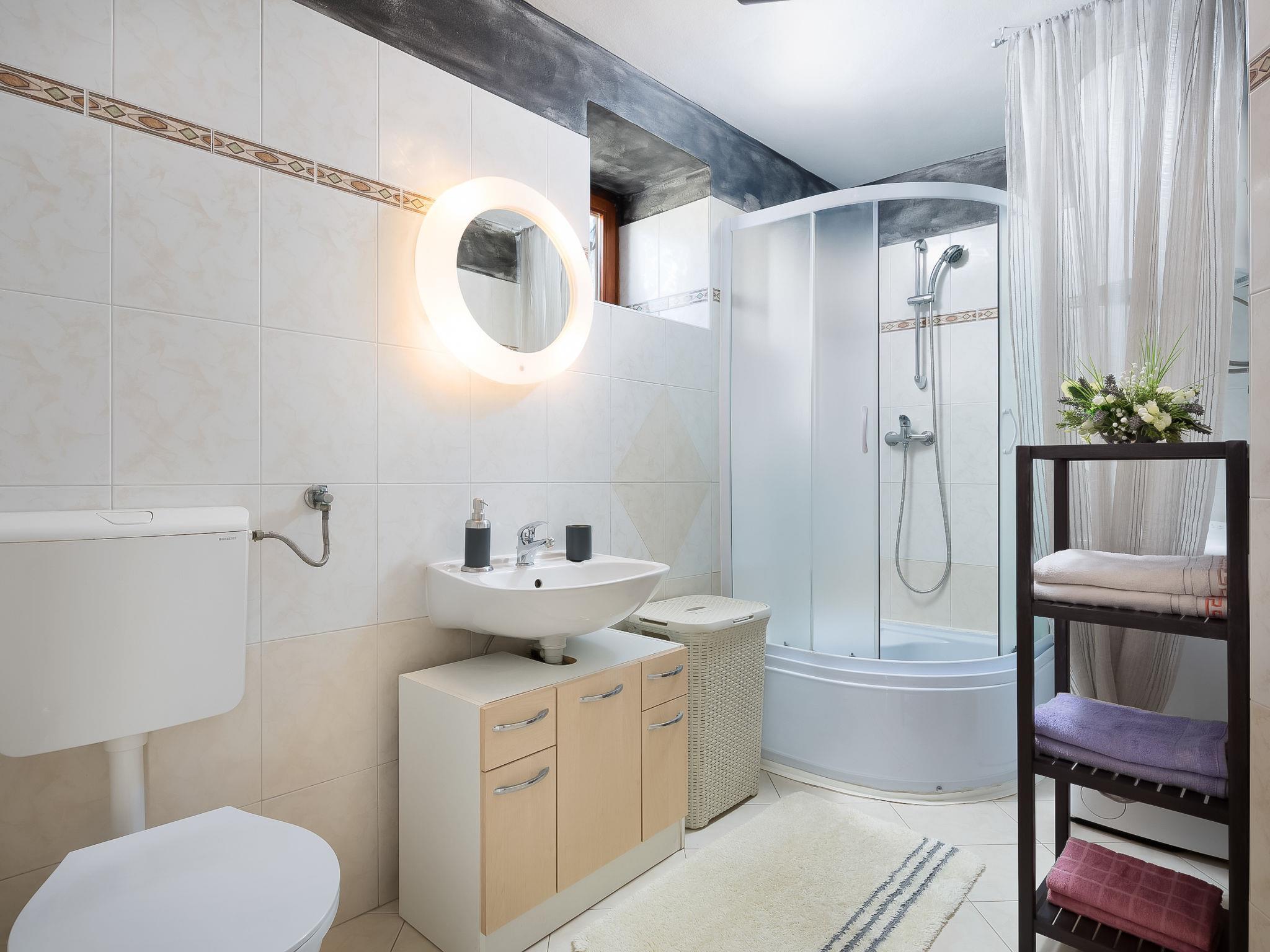 Doppelhaus "Villa Domenica", auf 2 Stockwerken, aus dem 18. Jahrhundert, renoviert. 1.1 km vom Zentrum von Trget, ausserhalb des Ortes, ruhige, sonnige, erhöhte Lage, 900 m vom Meer, 900 m vom Strand, in einer Sackgasse. Zur Alleinbenutzung: Grundstück 700 m2, Garten mit Pflanzen, Schwimmbad eckig (8 x 3 m, 140 cm tief, saisonale Verfügbarkeit: 11.Apr. - 24.Okt.) mit Innentreppe. Aussendusche, Terrasse (10 m2), Gartenmöbel, Grill, Kinderspielplatz (Schaukel). Im Hause: Internetzugang, Waschmaschine. Parkplatz (für 3 Autos) beim Haus auf dem Grundstück. Einkaufsgeschäft 1.1 km, Restaurant 600 m, Bushaltestelle 6.6 km, Kieselstrand 900 m. Verfügbar: Hundebox (im Preis inbegriffen).