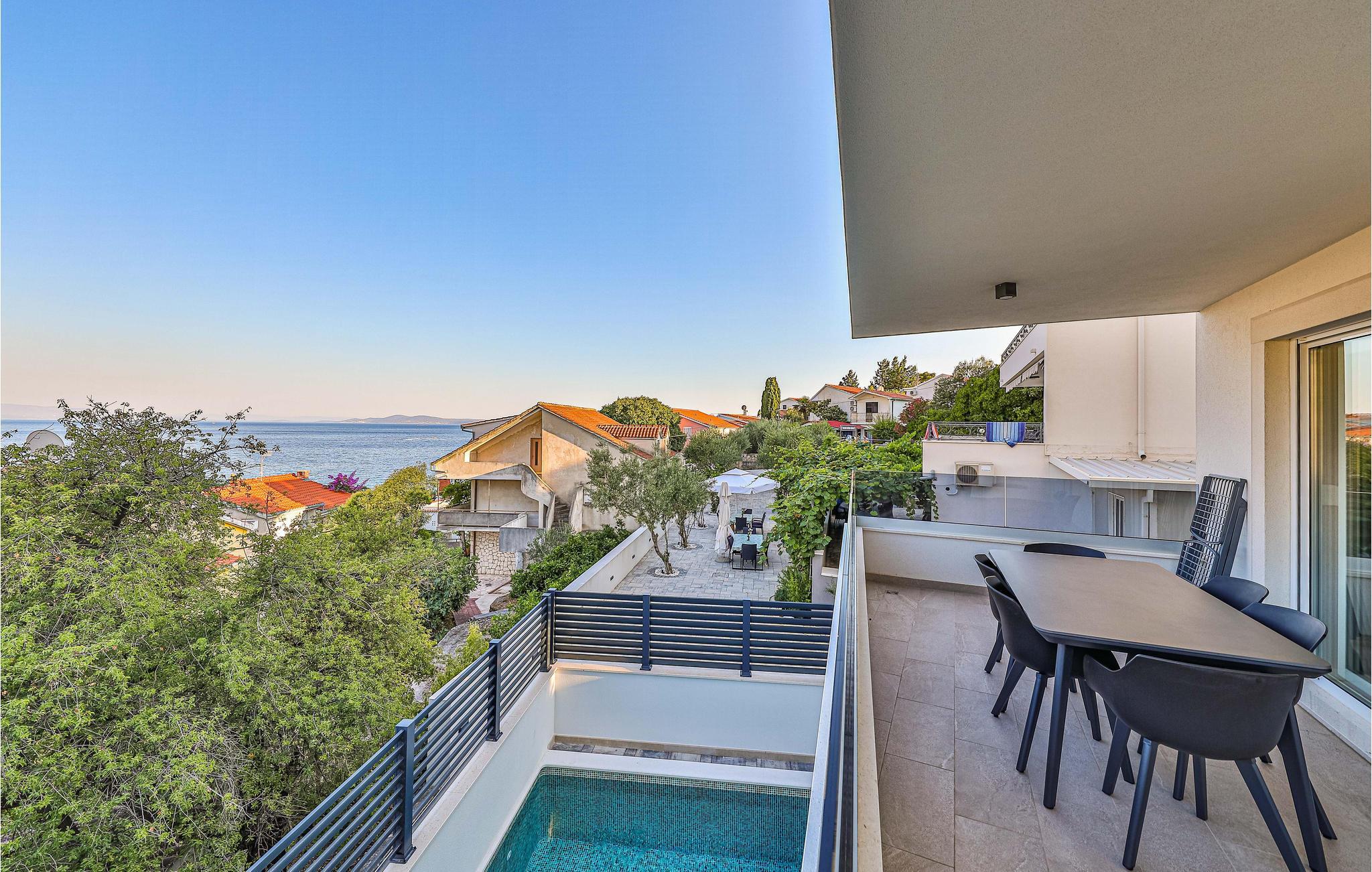 Genießen Sie einen herrlichen Blick auf das Meer in dieser komfortablen Ferienwohnung mit Poolzugang.
