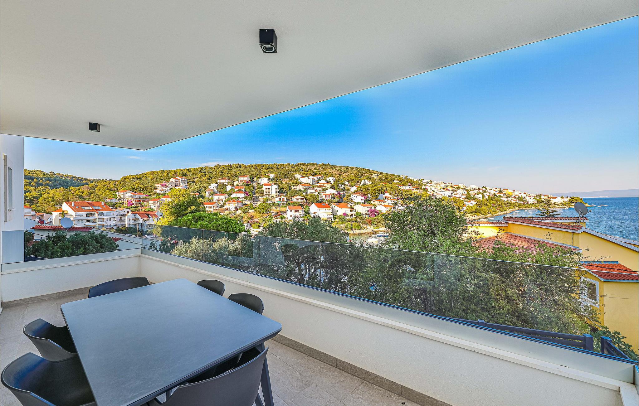 Die Wohnung empfängt Sie mit einem schönen Ambiente und einladender Wohlfühlatmosphäre. Genießen Sie schöne gemeinsame Stunden im modernen Wohnraum. Hier können Sie in der modernen Küche Ihre Lieblingsgerichte zubereiten und diese anschließend auf der geräumigen Terrasse mit herrlichem Panoramablick über das Meer und die Inseln genießen. Im Gemeinschaftsgarten des Hauses wartet ein schöner Swimmingpool auf Sie, wo Sie sich erfrischen und anschließend in der Sonne entspannen können.