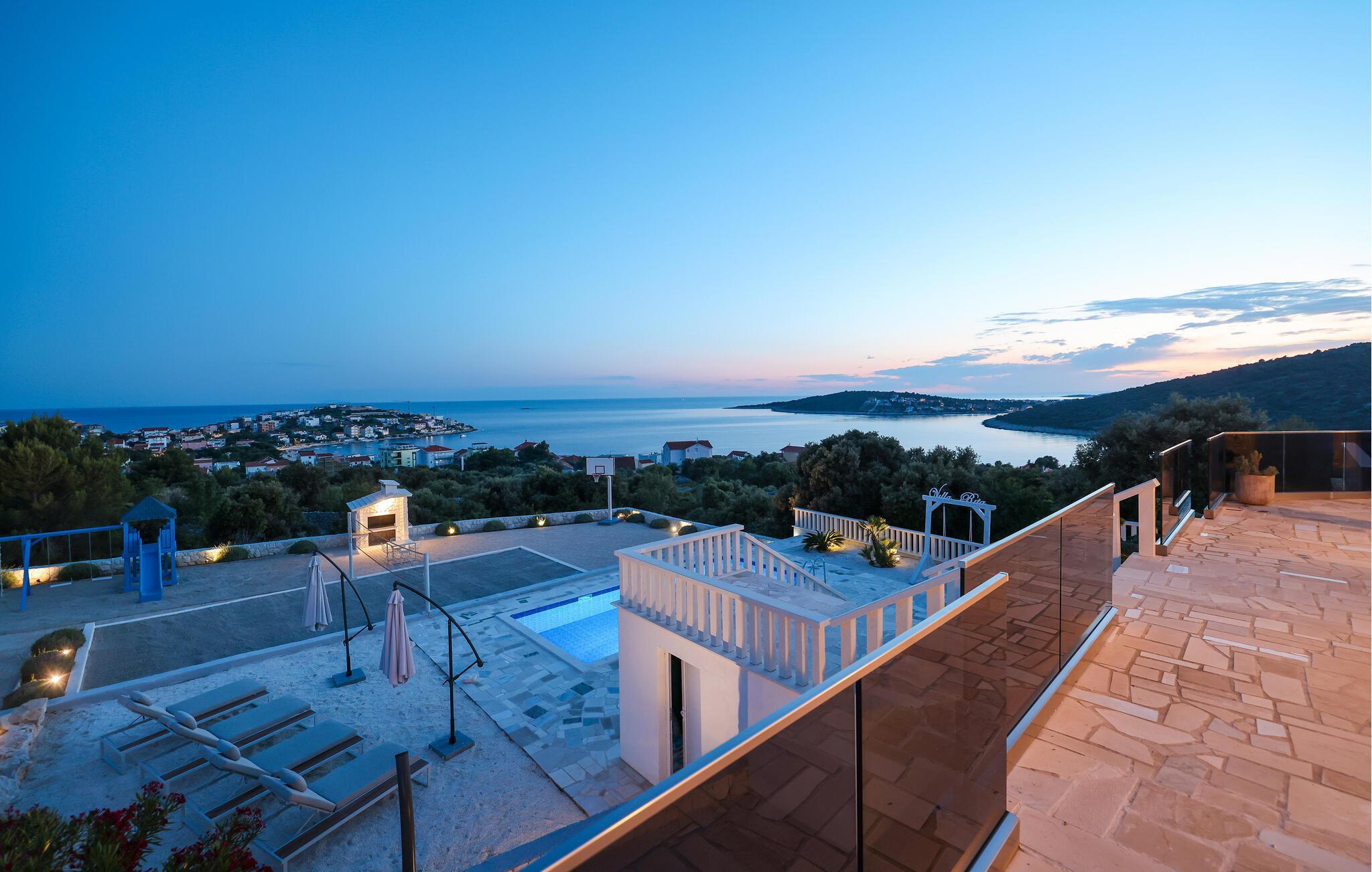Sie genießen eine luxuriöse Einrichtung mit modernen Möbeln und tollem Design, die ihresgleichen sucht. Das Haus steht in Alleinlage mit Panoramablick auf das Meer und ist bestens ausgestattet: Sie können einen großen Garten, einen Pool, Außenkamin, Terrasse mit Fitnessgeräten und Whirlpool sowie vieles mehr Ihr Eigen nennen. Auch ein Haustier ist erlaubt, sodass wirklich die ganze Familie kommen kann.