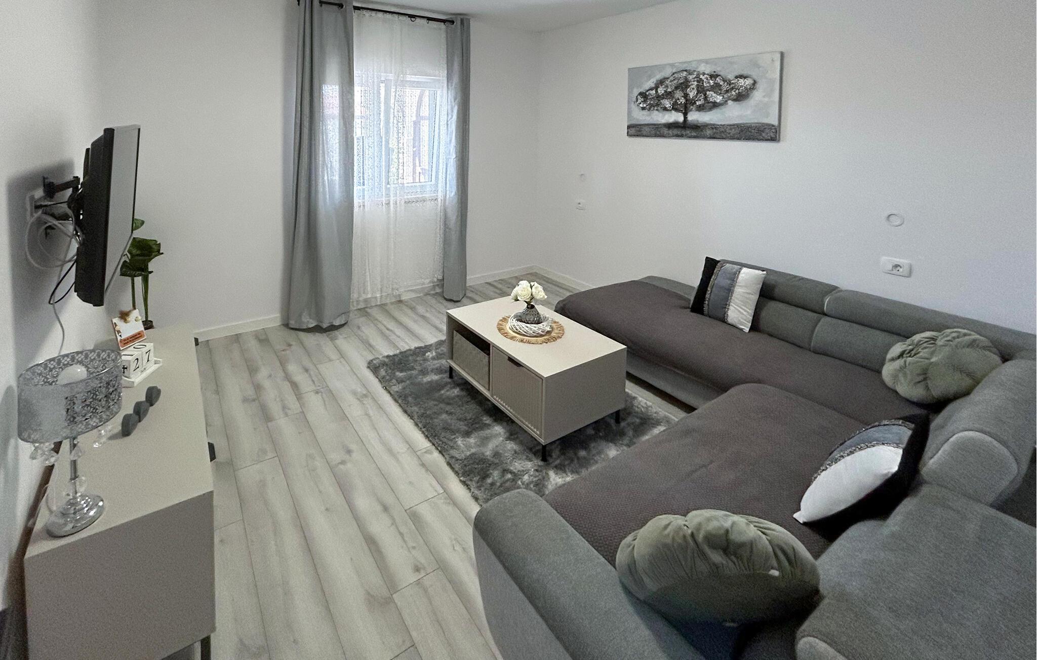 Diese in dezenten Farben eingerichtete Ferienwohnung bietet Ihnen den idealen Rahmen, um zur Ruhe zu kommen und den Alltag hinter sich zu lassen. Eine große Sofalandschaft lädt zum gemütlichen Kaffeetrinken bei entspannten Gesprächen ein. In der Küche können Sie sich leckere selbstzubereitete Mahlzeiten aus frischen Zutaten zaubern, bevor Sie gemeinsam essen und Pläne für den nächsten Tag schmieden.