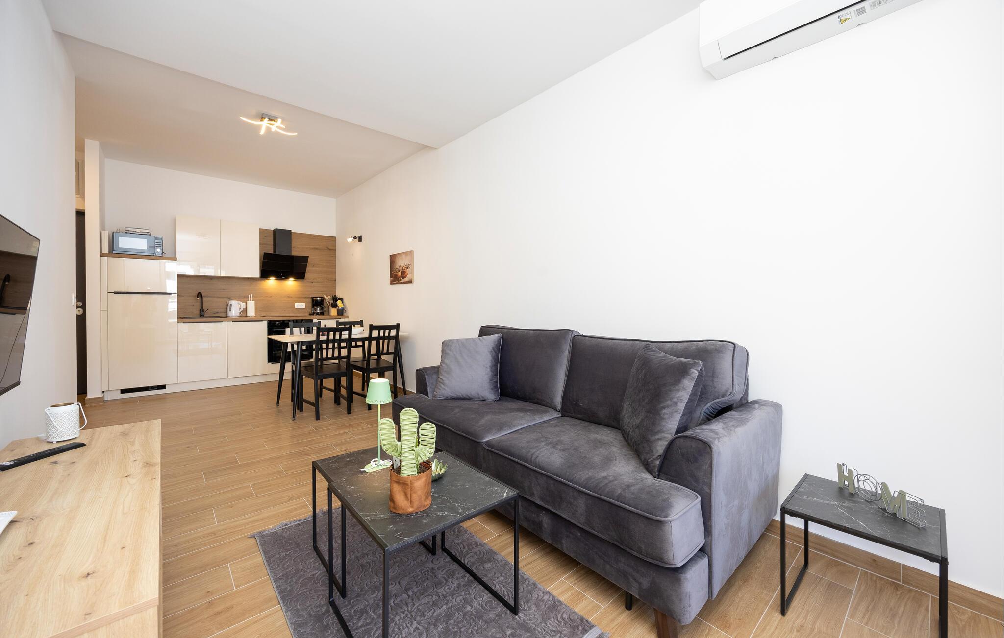Die praktische Unterkunft, gelegen in einem modernen Wohnblock, bietet Ihnen einen angenehmen Rückzugsort für entspannte Urlaubstage. Ein heller Wohnbereich mit warmer Holzoptik, gemütlichem Sofa und eine gut ausgestattete Küche schaffen die ideale Umgebung zum Abschalten. Es spielt keine Rolle, ob Sie lesen, Ihre Lieblingsserie schauen oder einfach das süße Nichtstun genießen – hier bestimmen Sie das Tempo Ihres Tages.