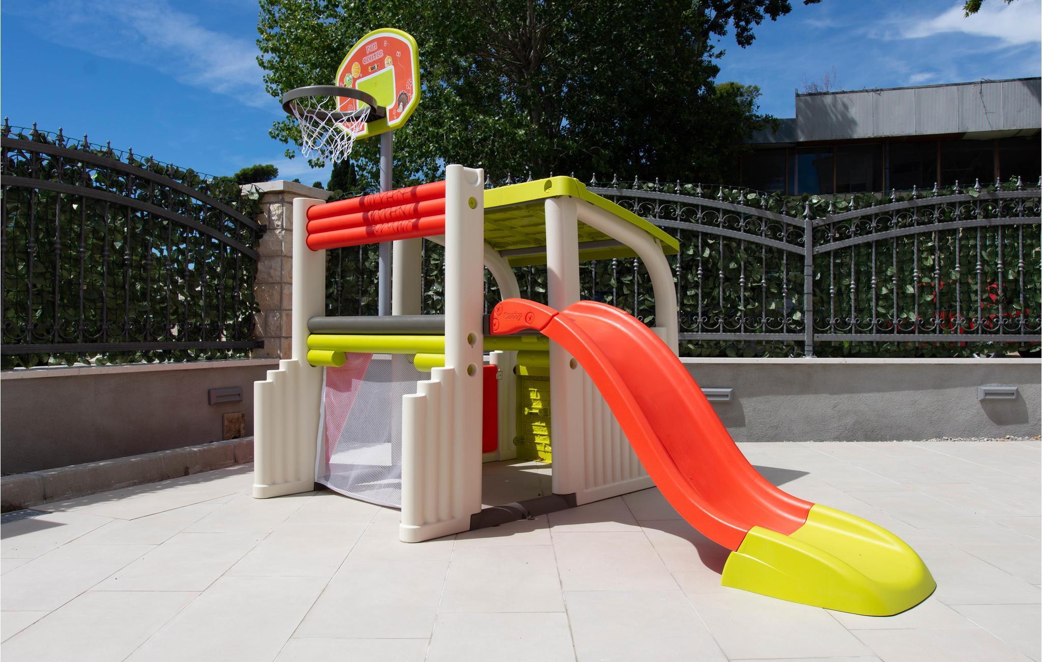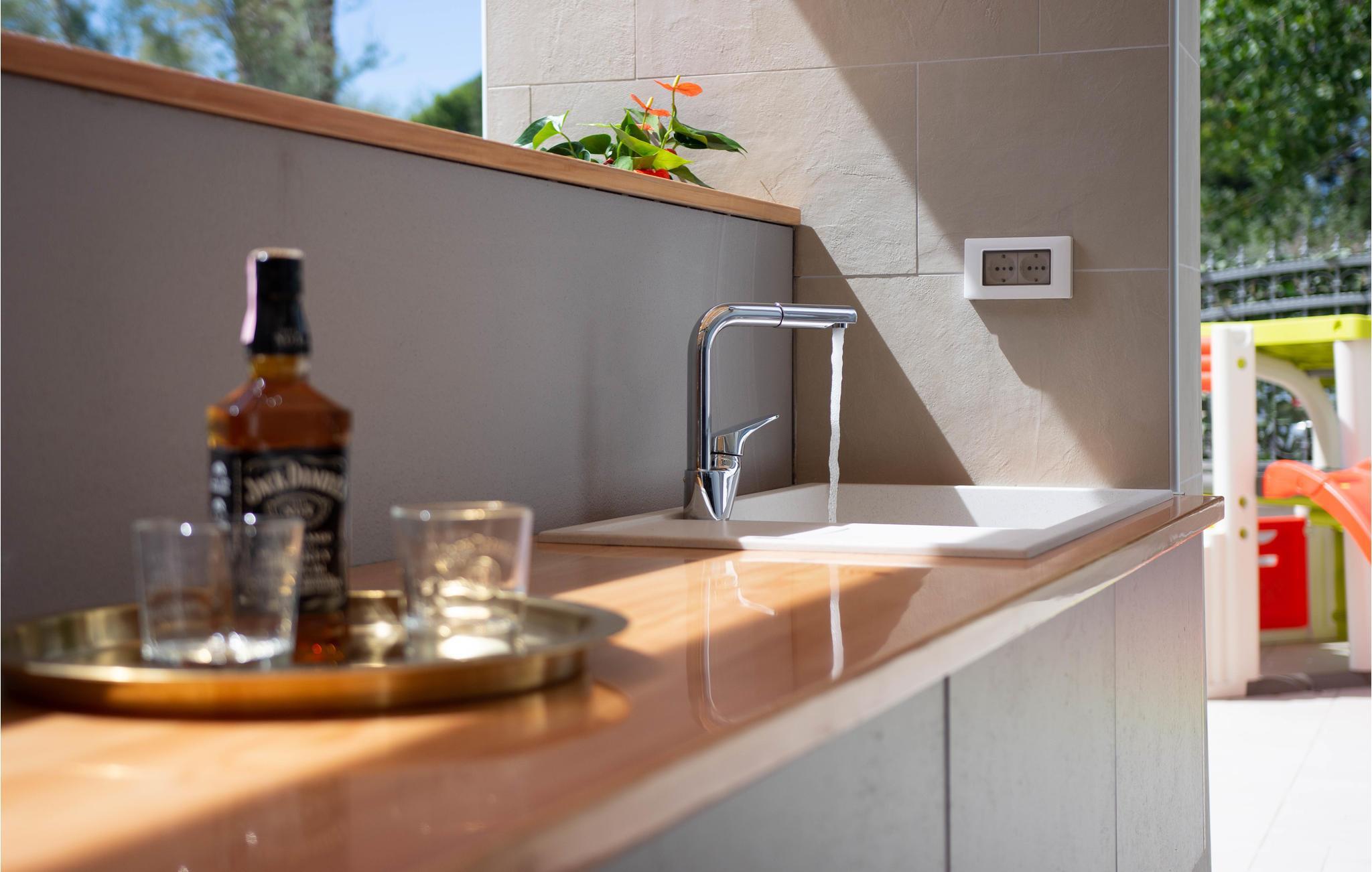 Diese schöne Terrasse, auf der Sie sicherlich die meiste Zeit verbringen werden, bietet Ihnen alles für einen qualitativ hochwertigen und komfortablen Urlaub. Sie ist mit hochwertigen Gartenmöbeln und Liegestühlen ausgestattet. Es gibt eine Bar im Freien und Spielmöglichkeiten für die Kleinsten, außerdem finden Sie im Garten auch eine Eiswanne.