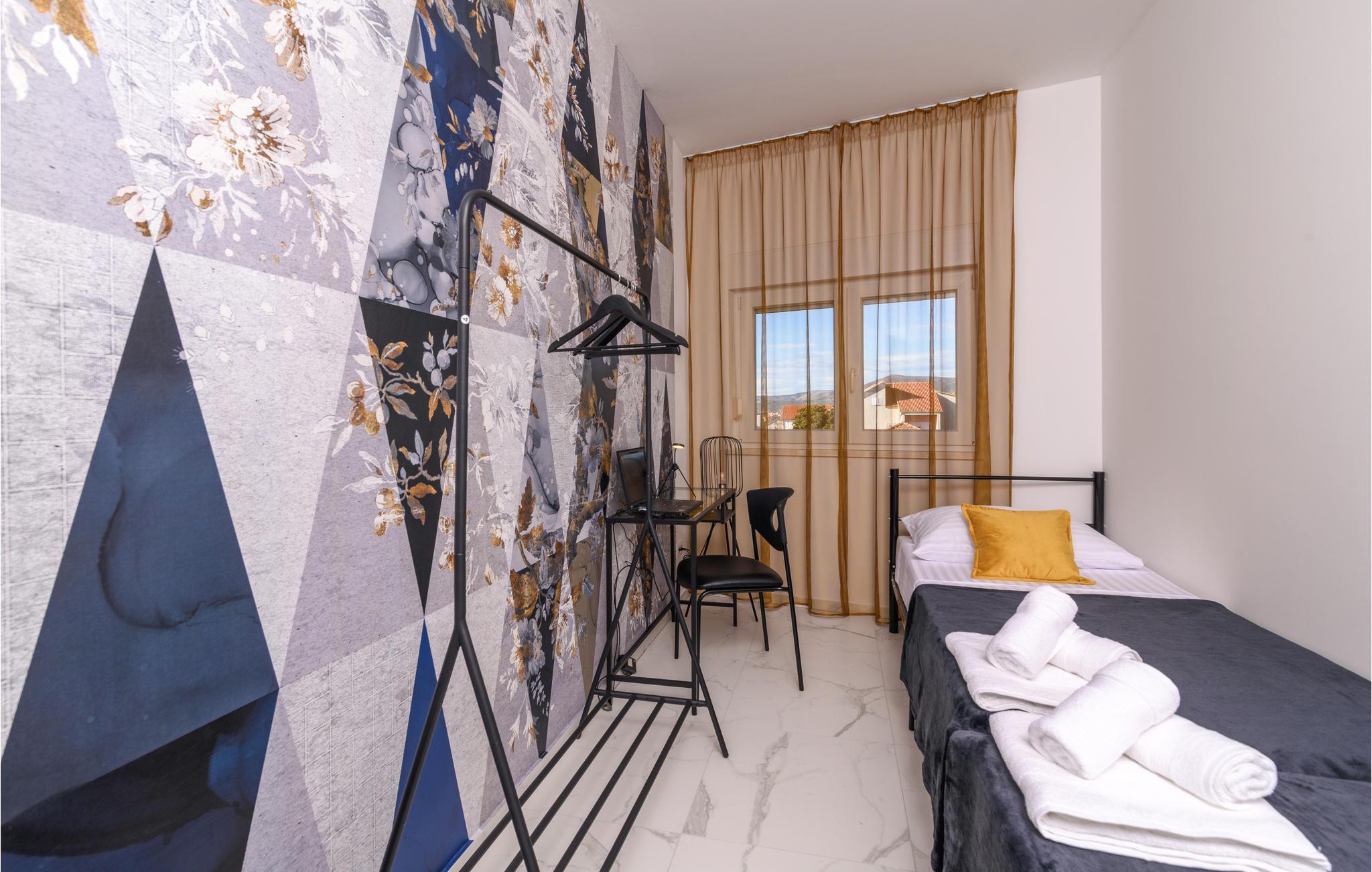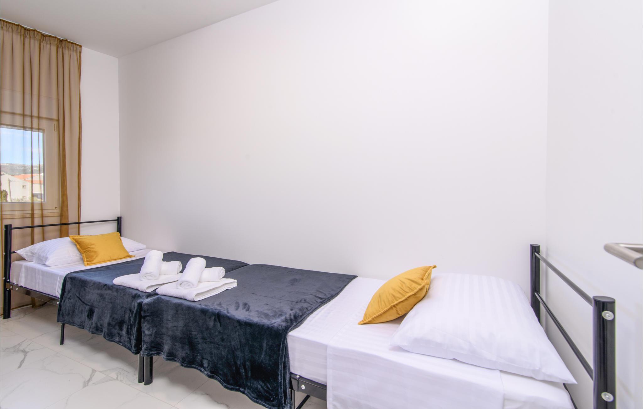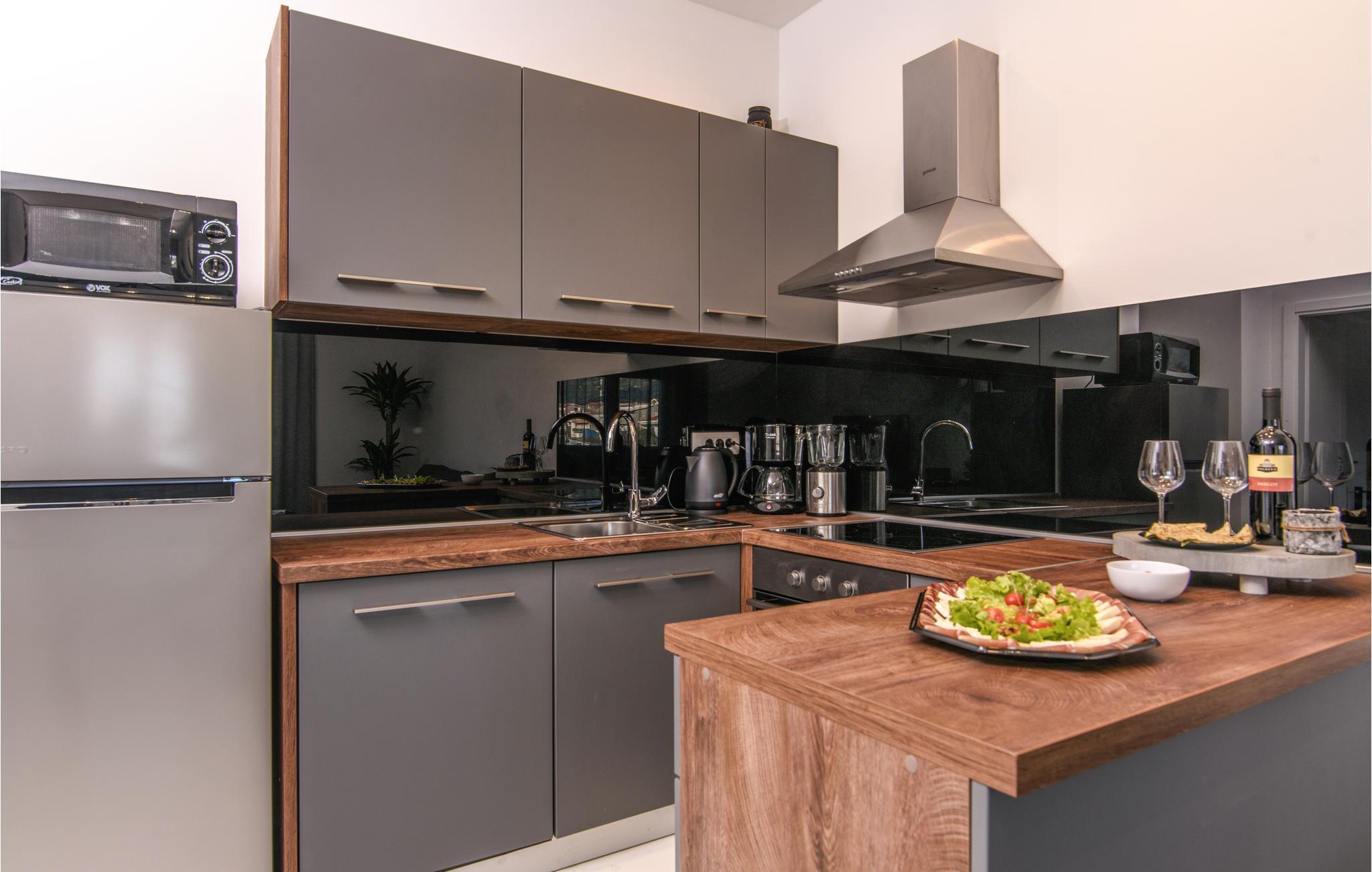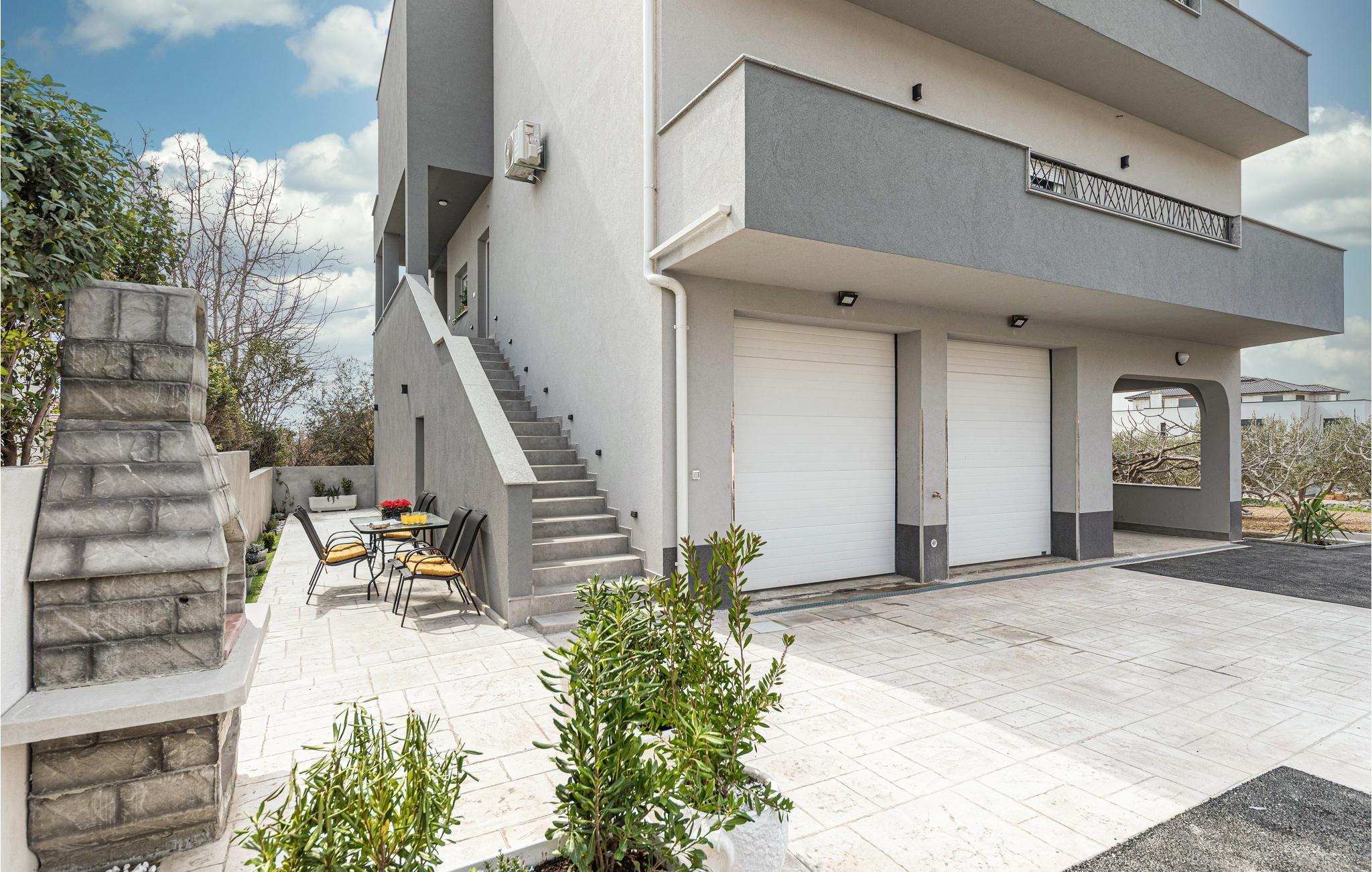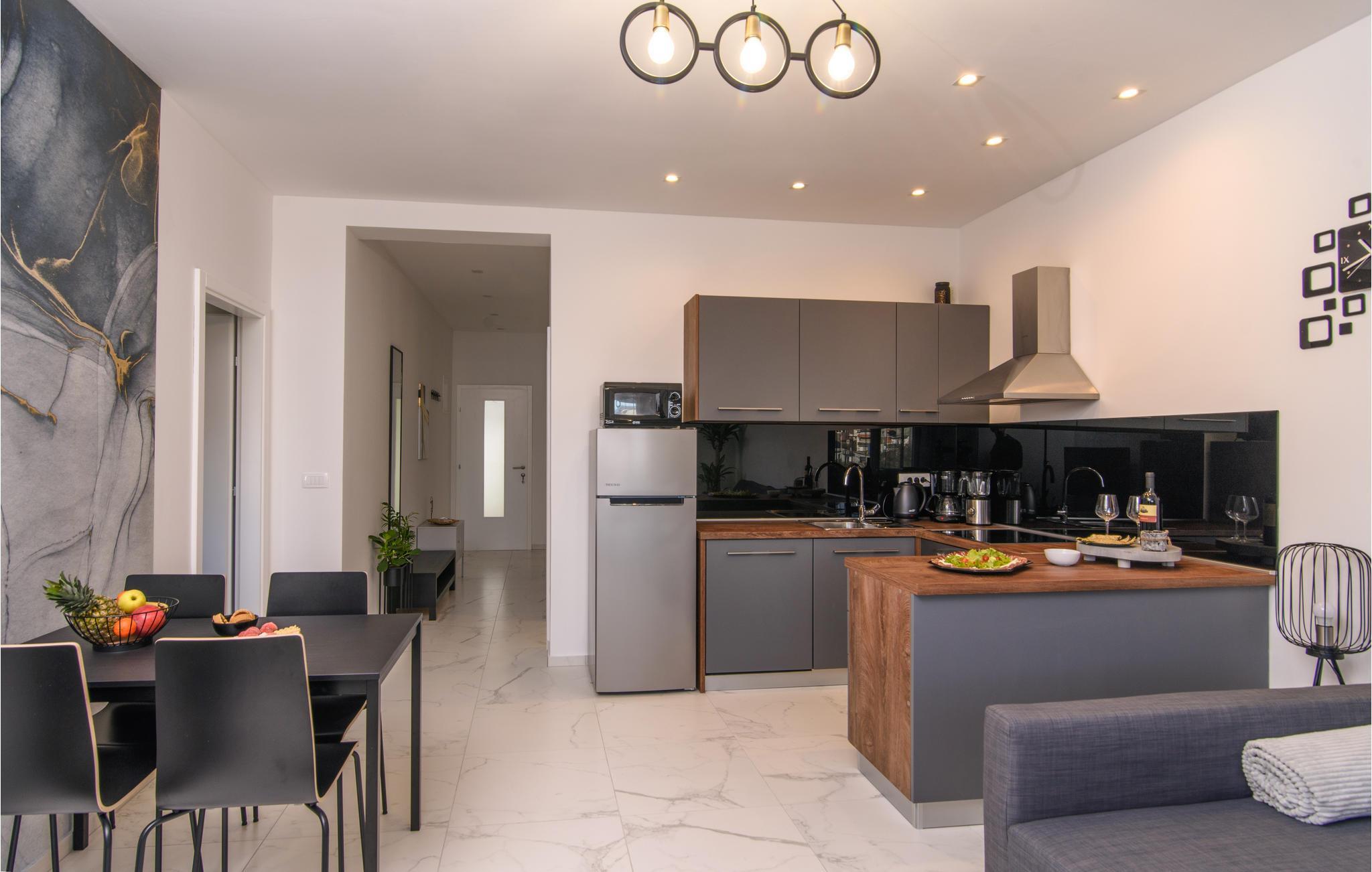 Eine höchst moderne und geräumige Ferienwohnung in dem Kaštel Gomilica, welche Ihnen ein offenes Wohnkonzept bietet, somit setzt sich der Wohnraum aus Kücheninsel und -ecke, Wohnzimmer und Esszimmer zusammen. Hier werden Sie sich auf die zwei vorhandenen Schlafzimmer aufteilen und sich ein Badezimmer teilen.