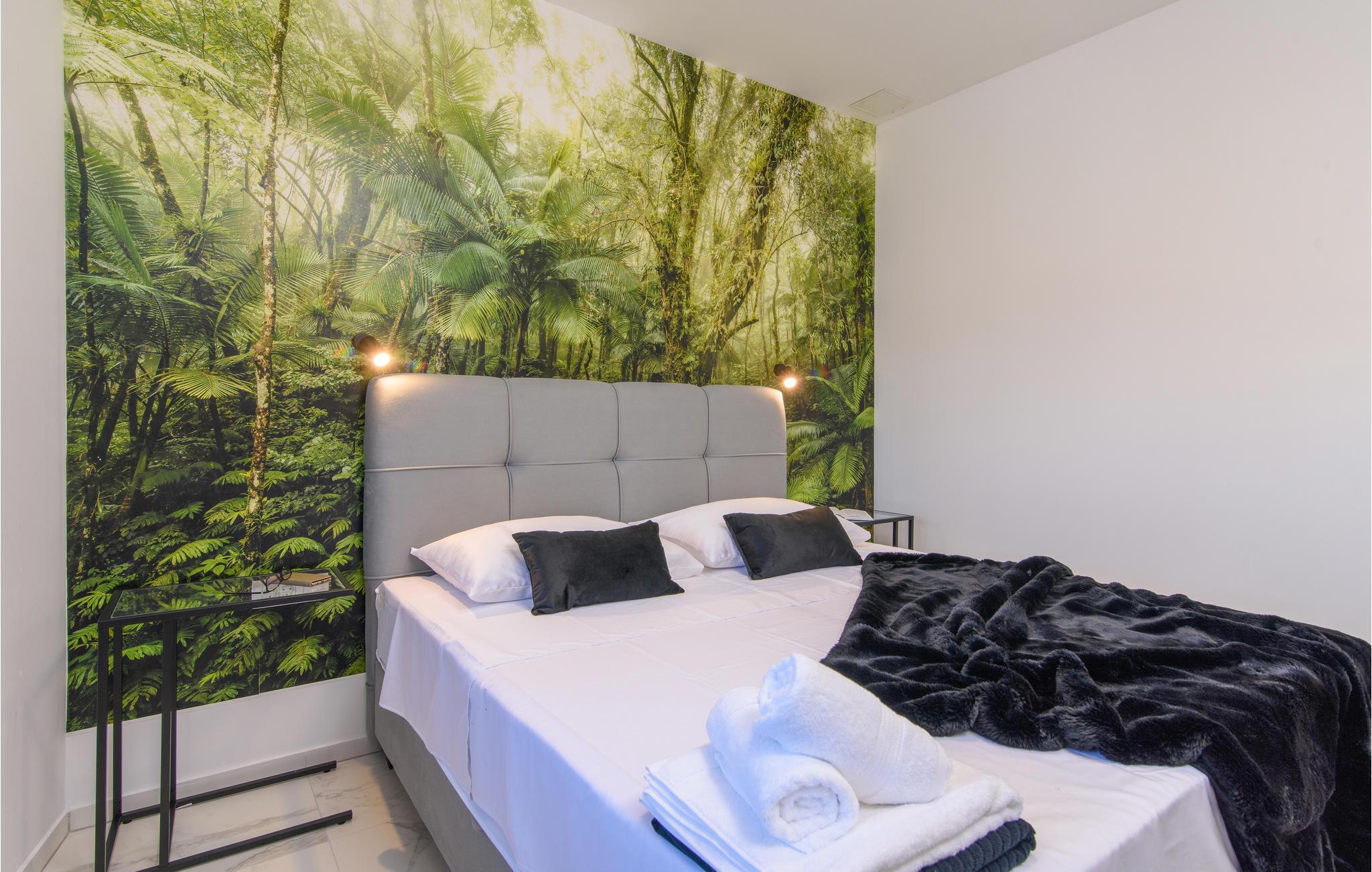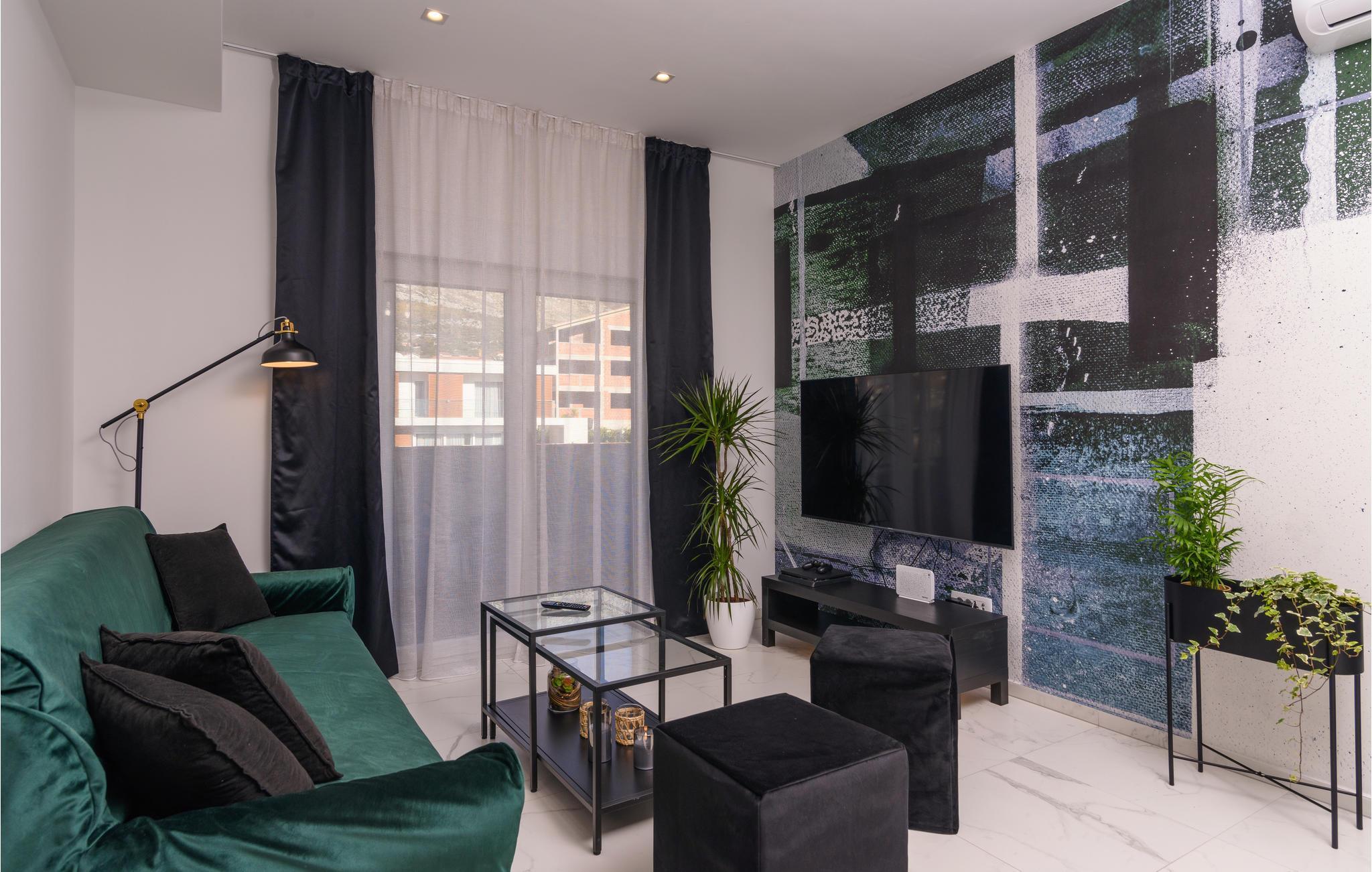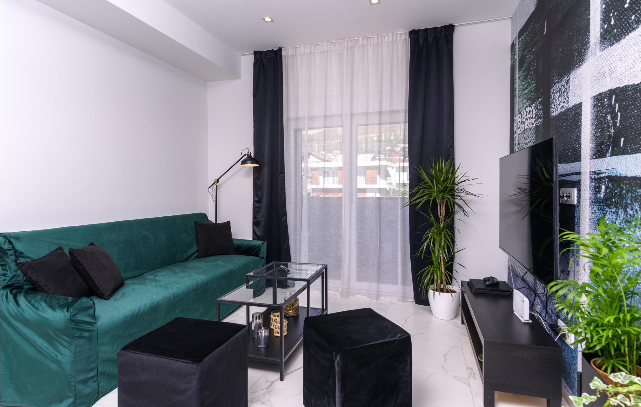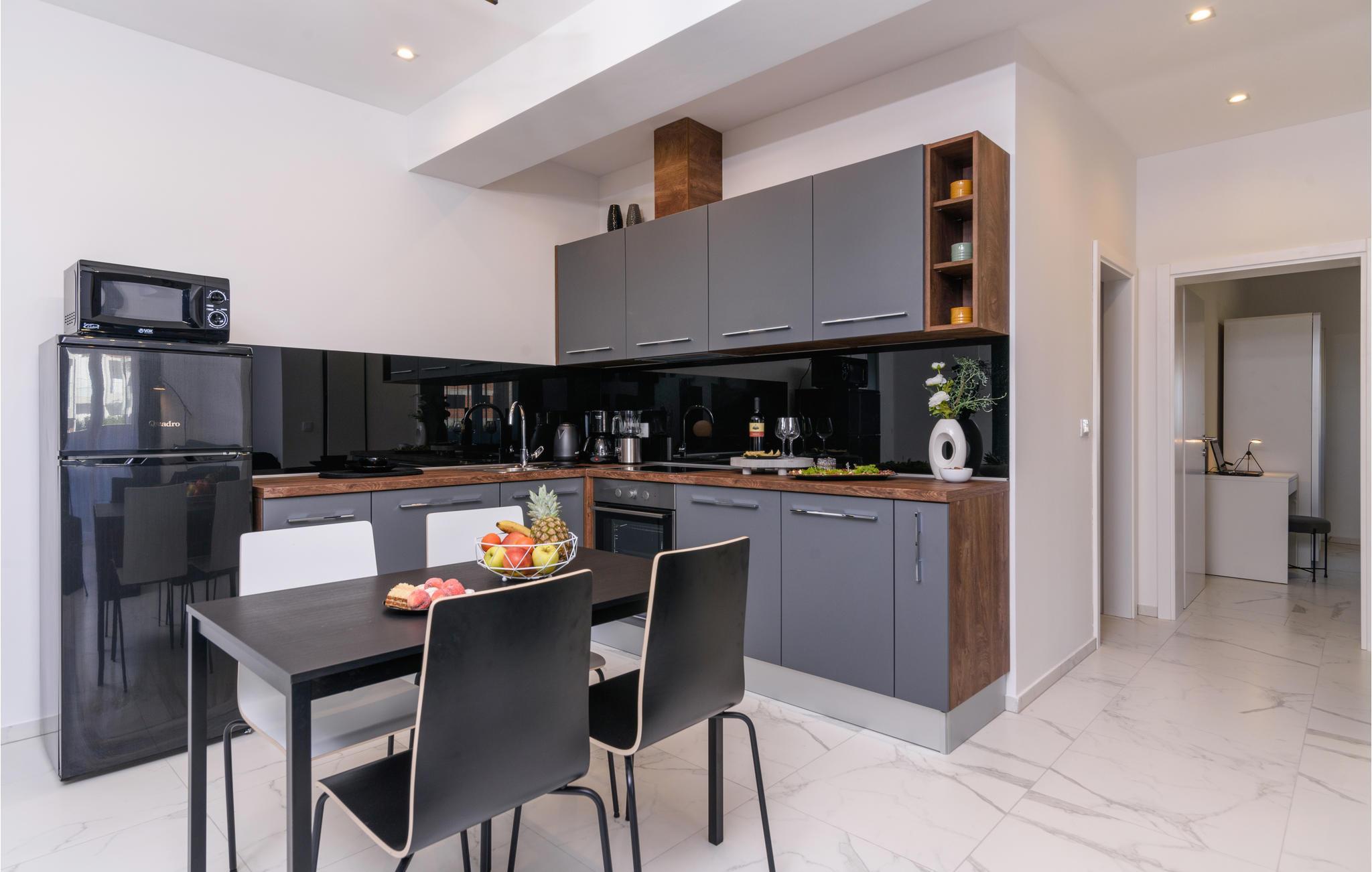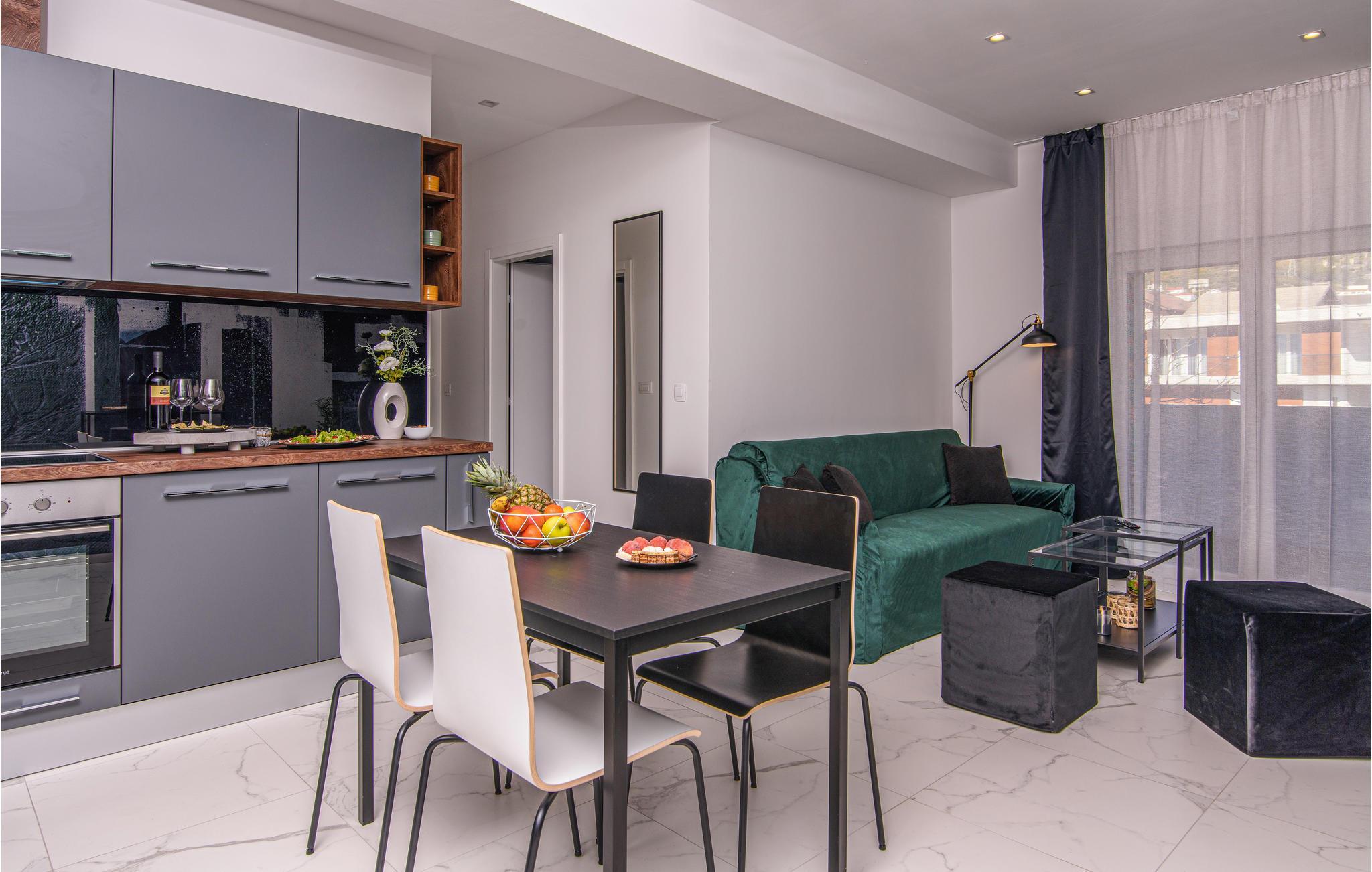 Eine höchst moderne und geräumige Ferienwohnung in dem Kaštel Gomilica, welche Ihnen ein offenes Wohnkonzept bietet, somit setzt sich der Wohnraum aus Kücheninsel und -ecke, Wohnzimmer und Esszimmer zusammen. Die spielerischen und auffalenden Tapeten, sowie die edlen schwarzen Möbel geben dieser Wohnung eine sehr ausdrucksstarke Atmosphäre.