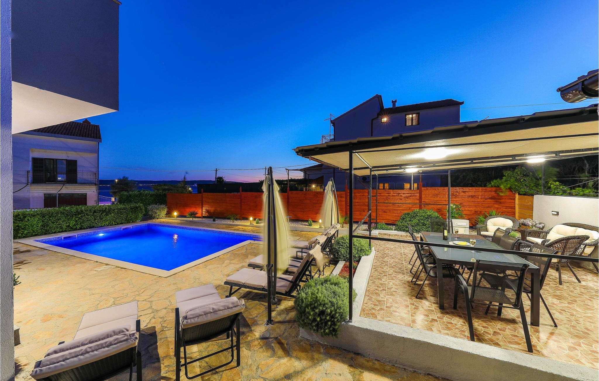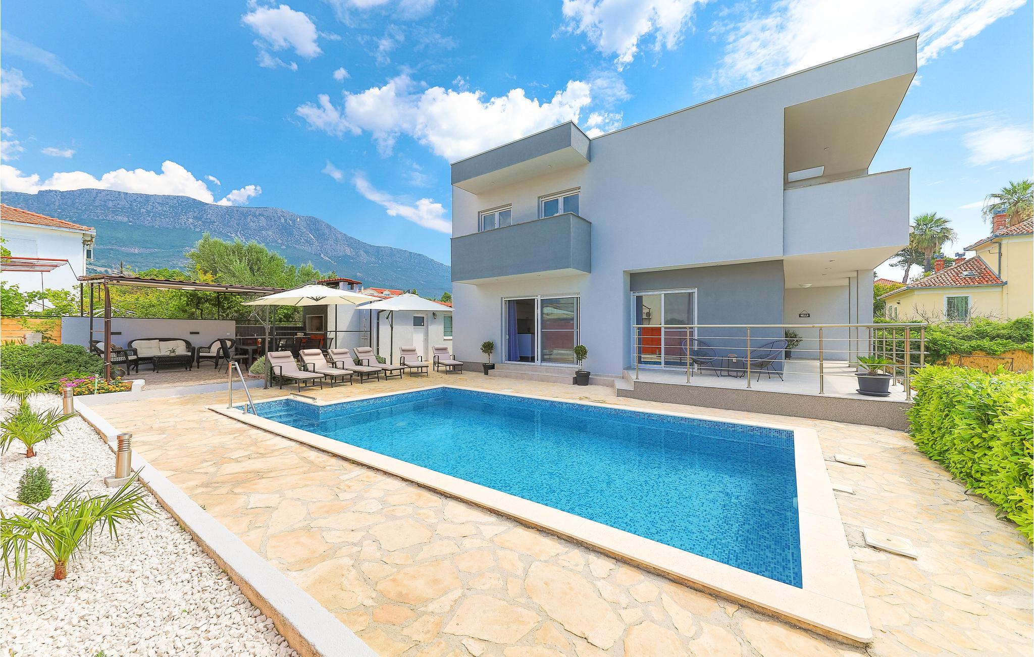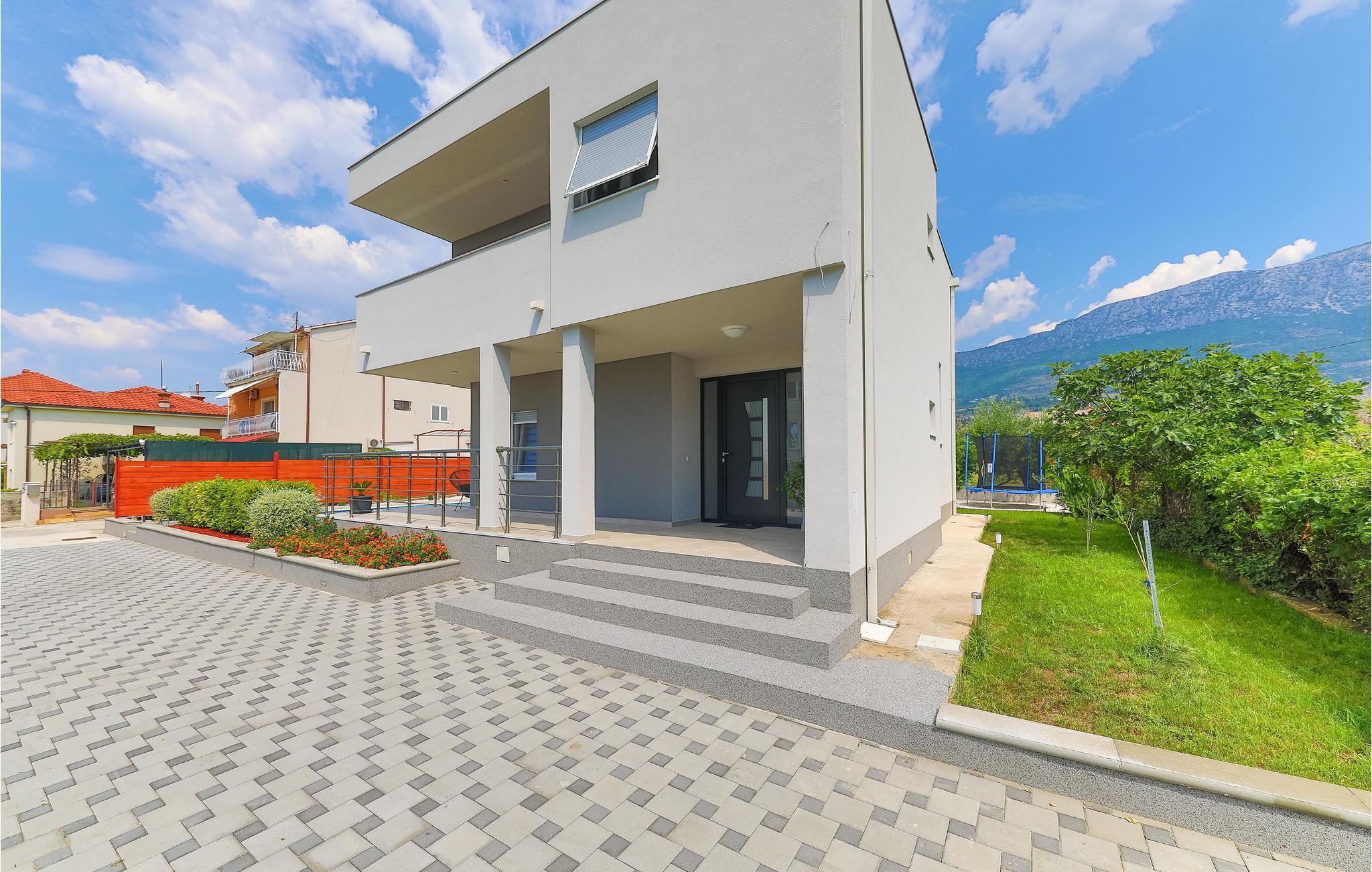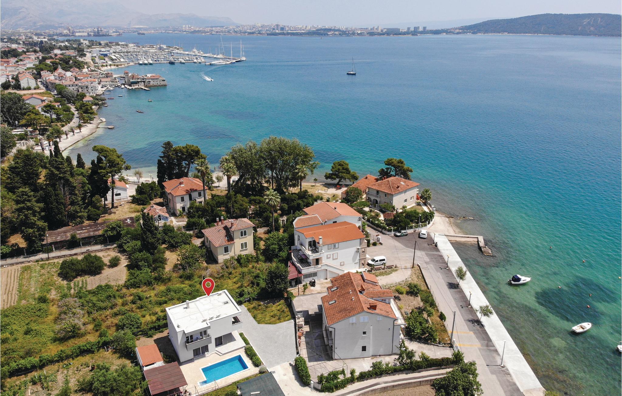 Dieses großartige Ferienhaus mit Pool liegt nur 3 Gehminuten vom wunderschönen klaren Meer der Bucht von Kaštelanski entfernt, in Kaštel Kambelovac nahe der Stadt Trogir. Voll ausgestattet für einen komfortablen Familienurlaub mit Freunden verfügt das Ferienhaus unter anderem über vier Schlafzimmer und eine große Terrasse in der Nähe des Pools. Genießen Sie hier viele Sommerveranstaltungen und Restaurants, die täglich frische mediterrane Köstlichkeiten und Premium-Wein anbieten, wo Sie sich mit der regionalen Küche vertraut machen können, und schöne lange Abendspaziergänge entlang der Küste. Der Mond und die Sterne sind selten heller und perfekt für angenehmes Nachtschwimmen.