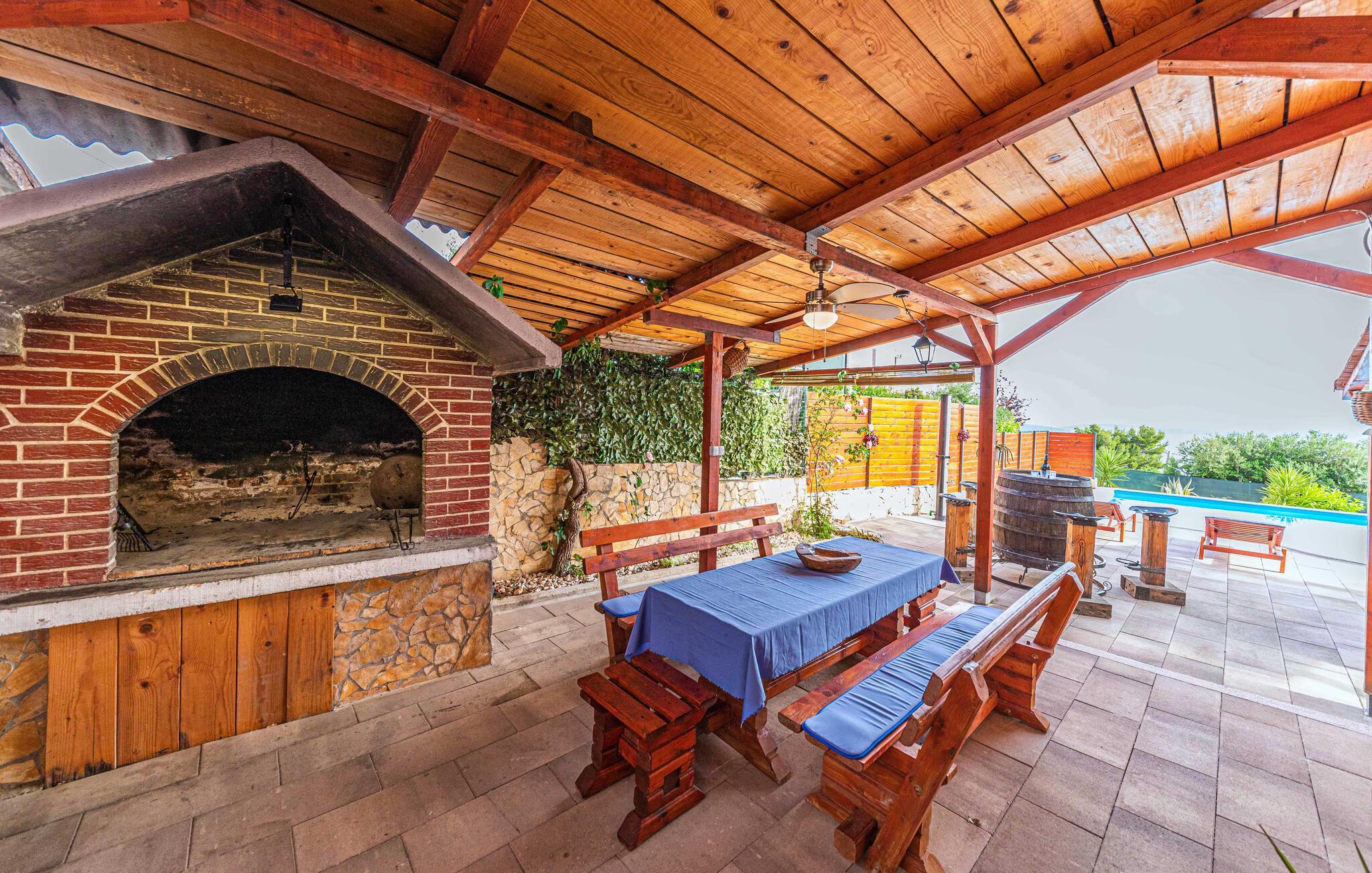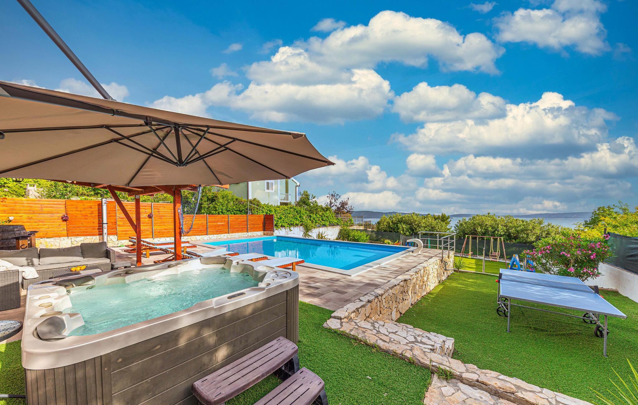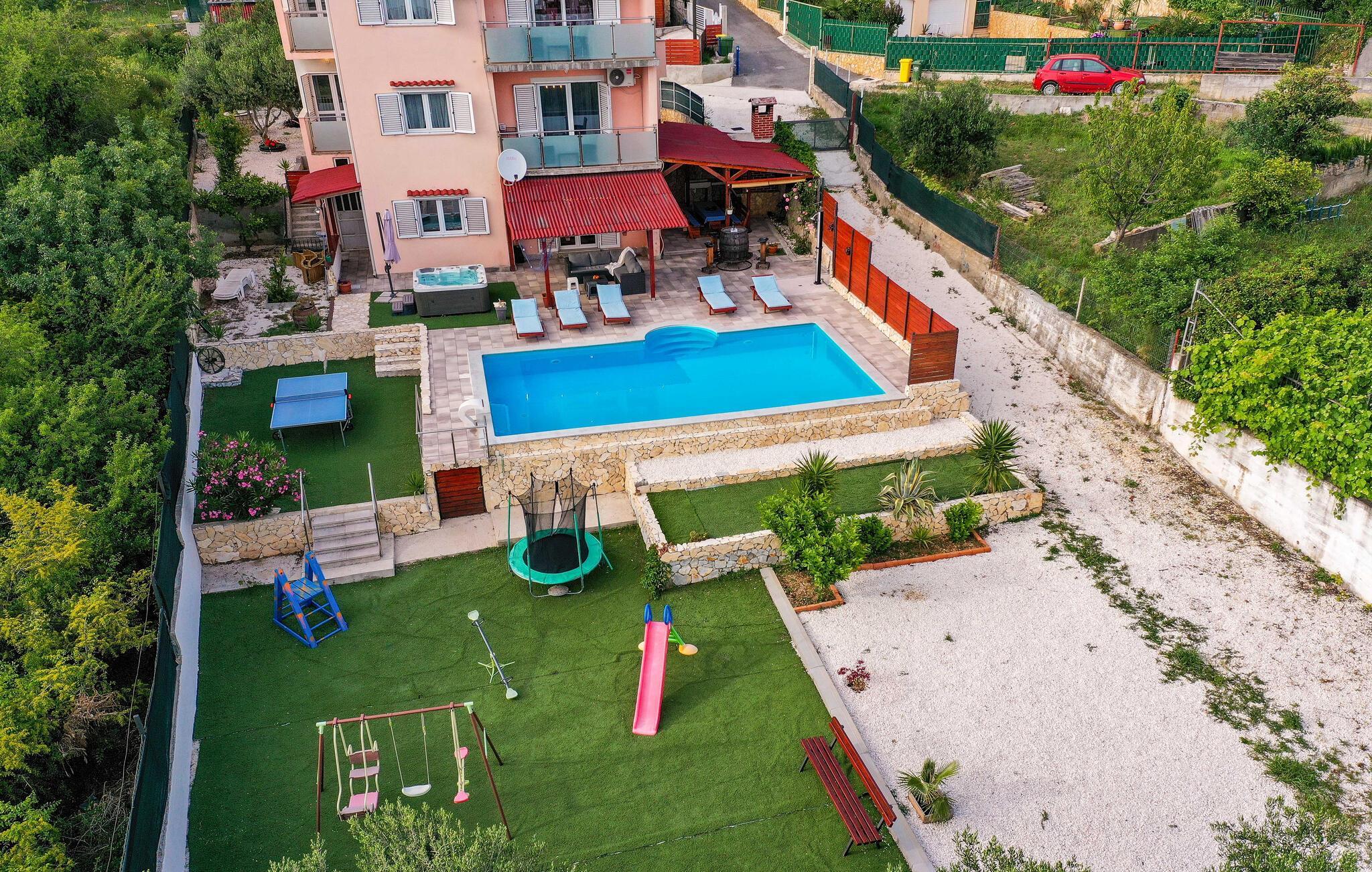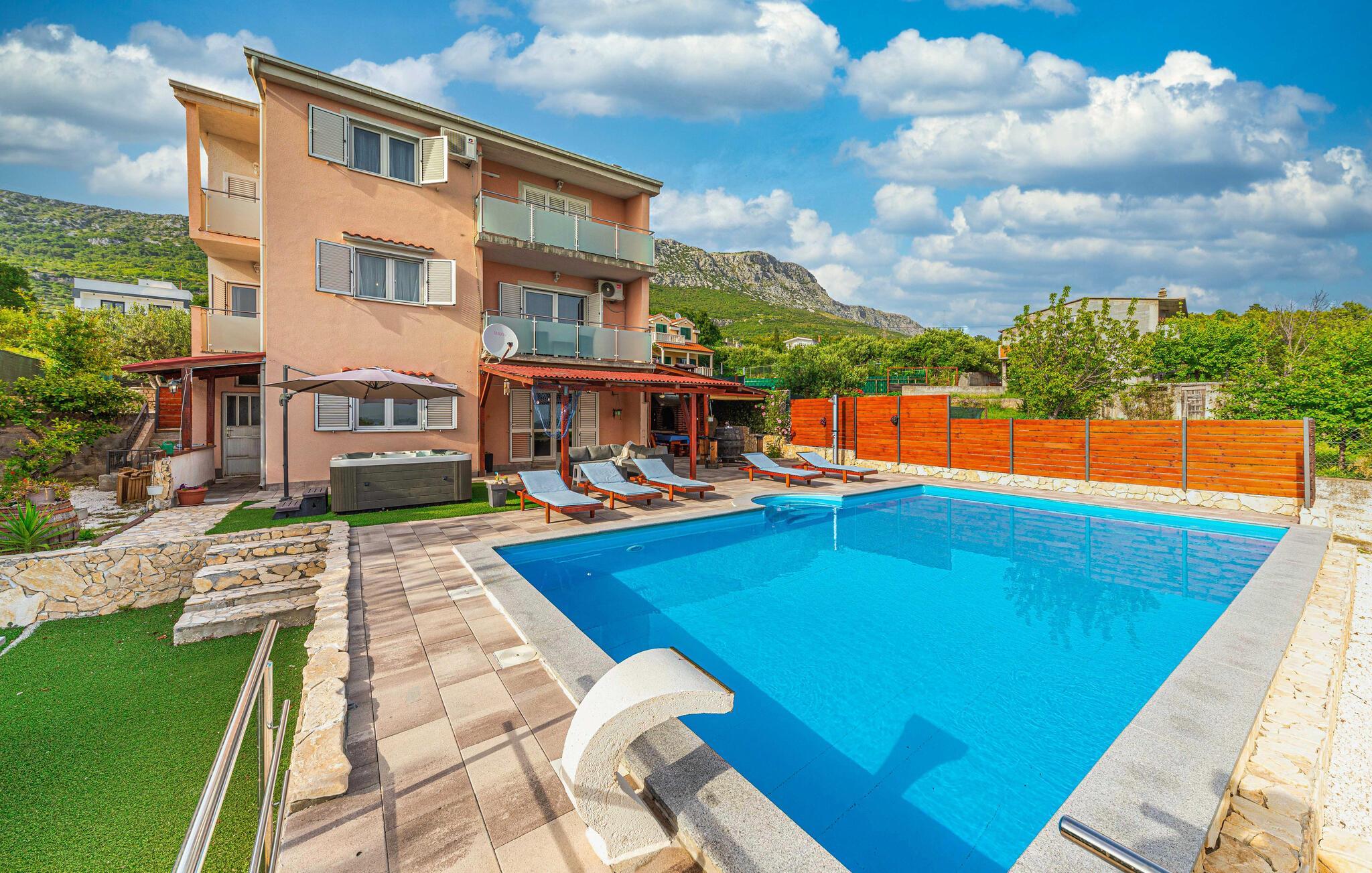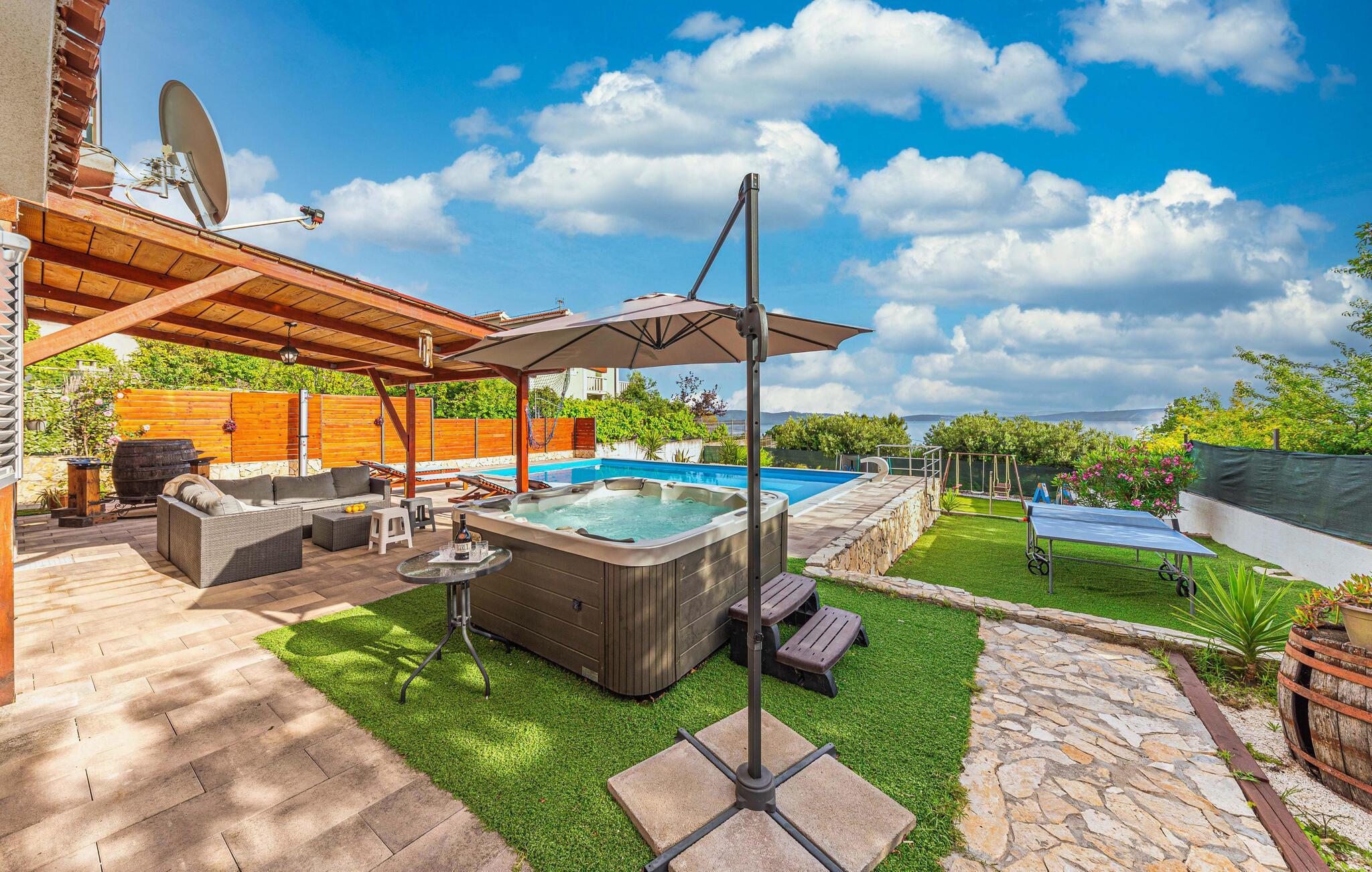 In einem ruhigen Ortsteil von Kastel Kambelovac liegt dieses Ferienhaus mit Panoramablick auf das Meer und die Bucht von Kastela. Hier können Sie Ihren Urlaub in vollen Zügen genießen. Die Etagen sind durch Innentreppen miteinander verbunden. Vor dem Haus befindet sich der erfrischende Pool, wo es an Badespaß nicht fehlen wird. Prickelndes Sprudeln bietet der Whirlpool für 6 Personen und auf dem Sonnendeck können Sie entspannen. Das ganze Angebot rundet die Sauna ab, wo Sie Körper und Seele mit Energie tanken werden. Besuchen Sie die schönen Städte Trogir und Split und ihre auf der UNESCO-Welterbeliste eingetragenen Sehenswürdigkeiten. In den märchenhaften Altstadtkernen, die einen mediterranen Charme ausstrahlen, gibt es schöne Restaurants und tolle Einkaufsmöglichkeiten sowie ein buntes Nachtleben. Spazieren Sie entlang der Riviera von Kastela und lassen Sie sich vom mediterranen Ambiente verzaubern.