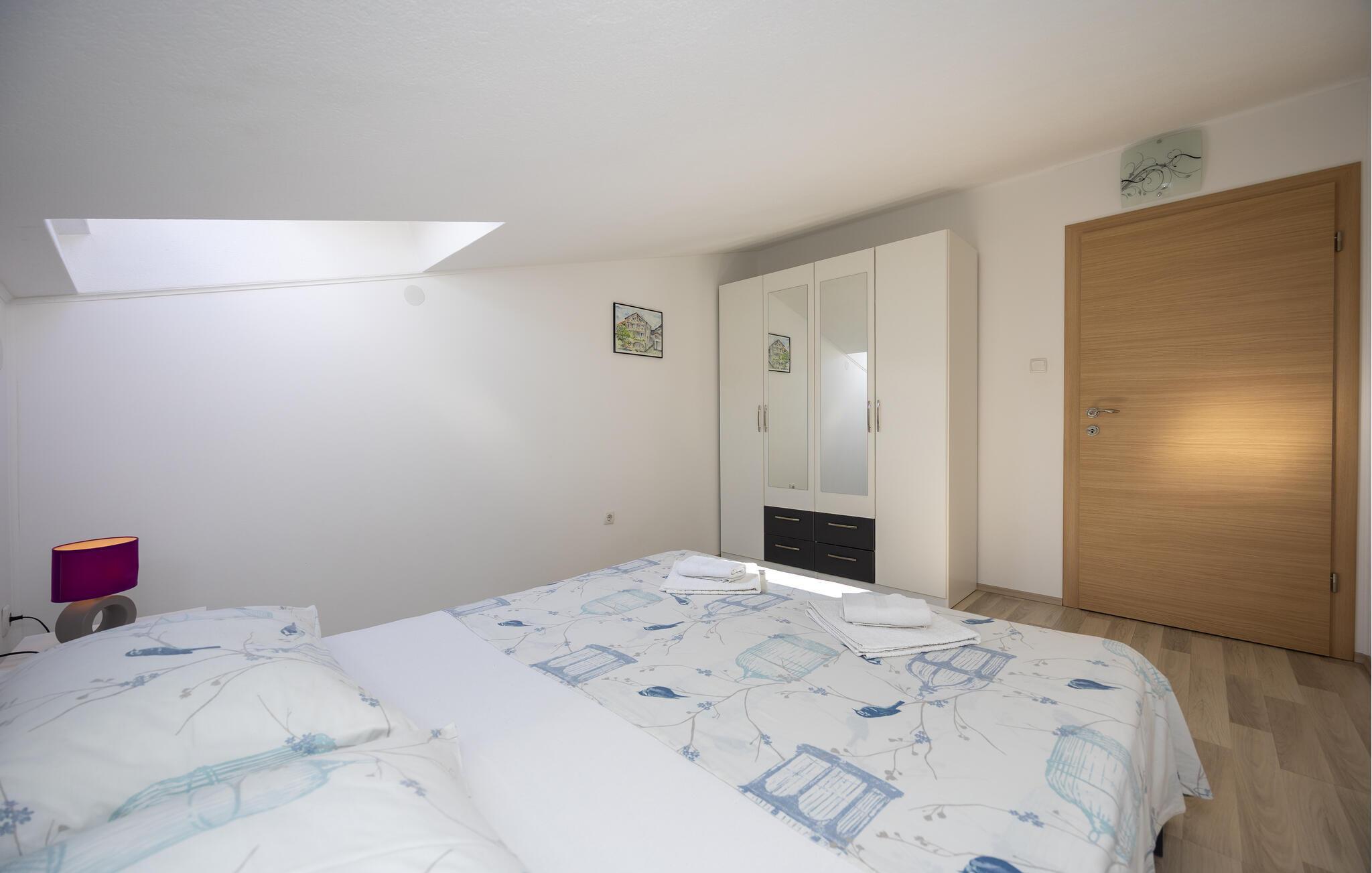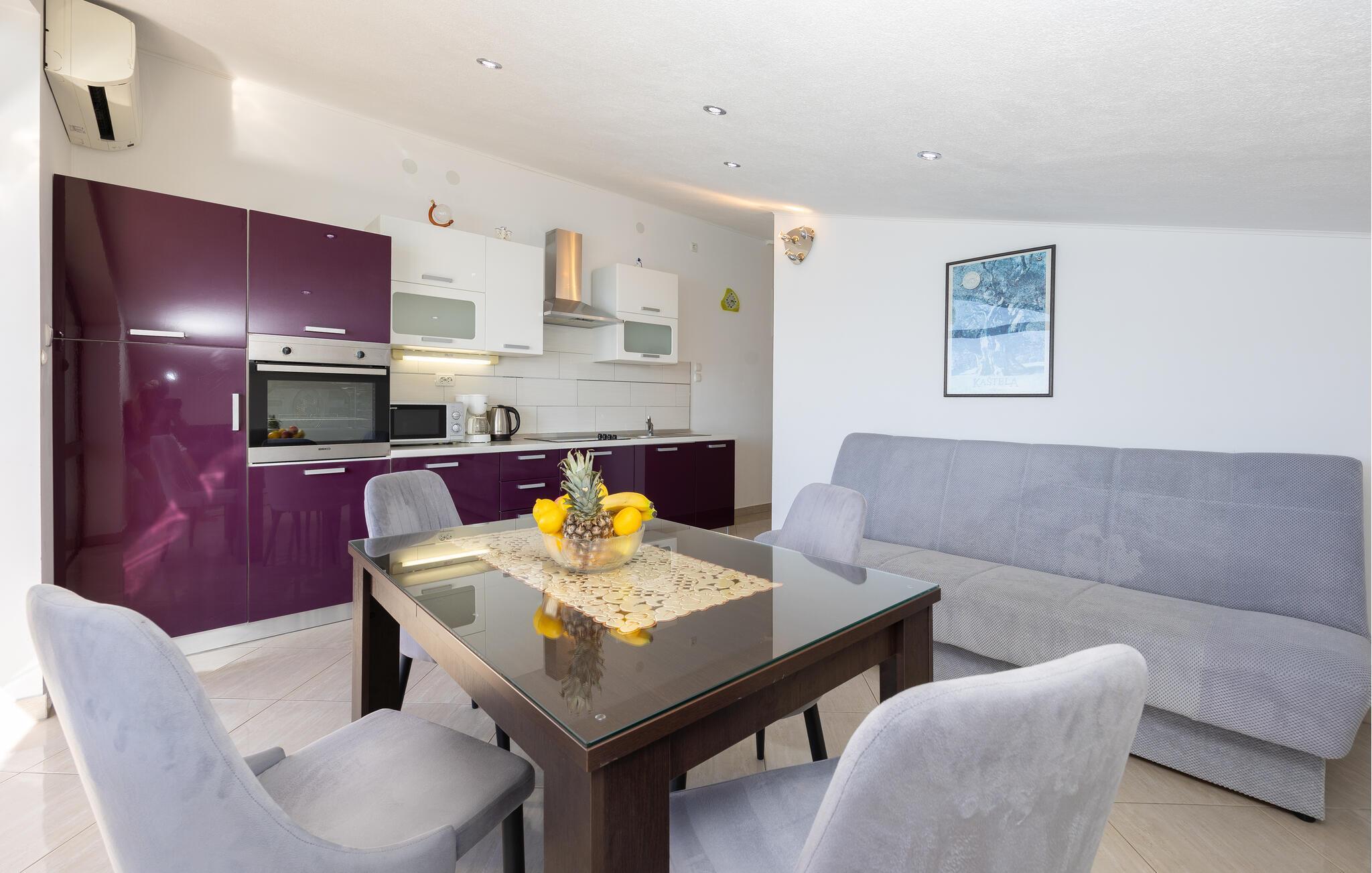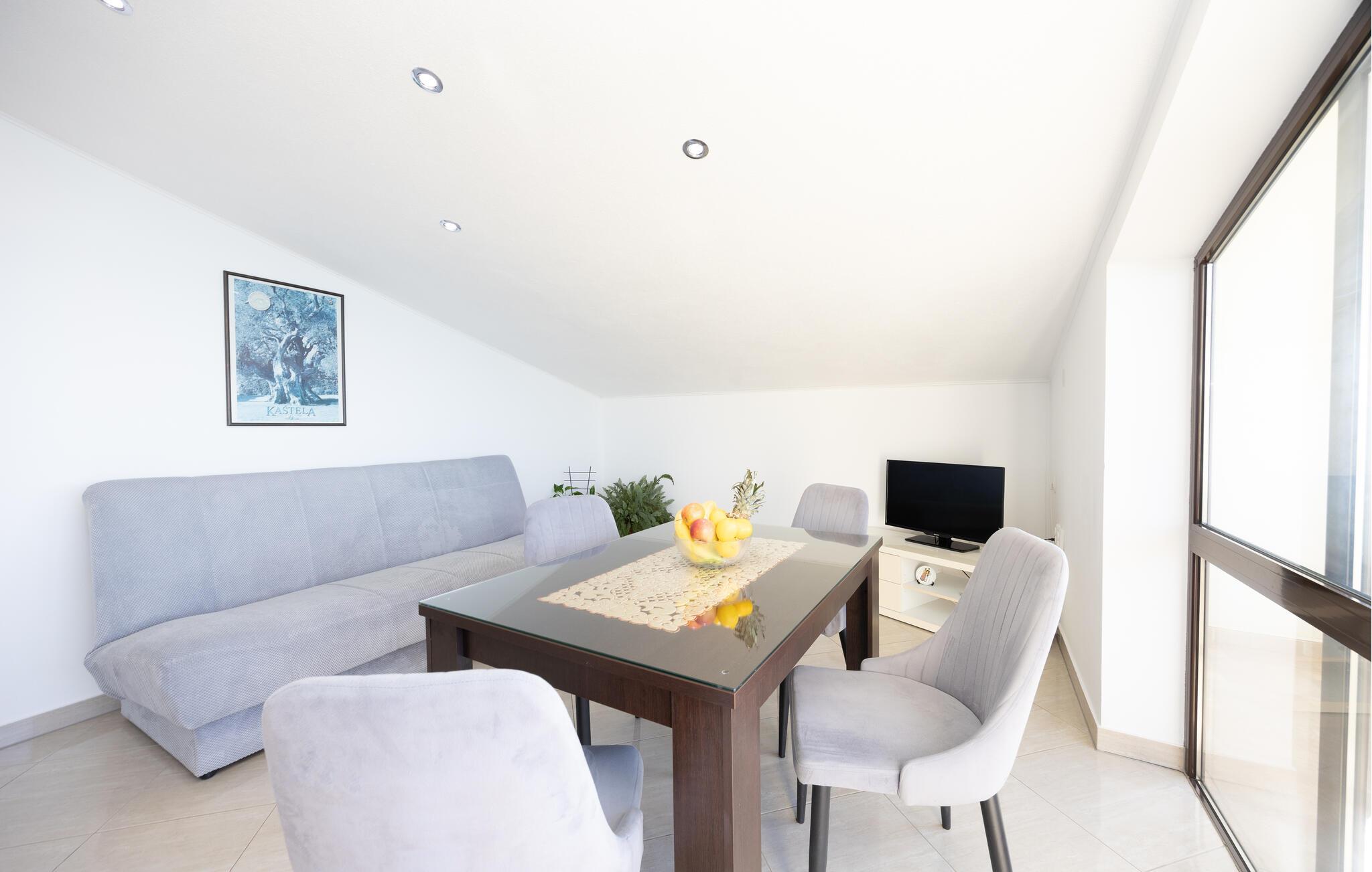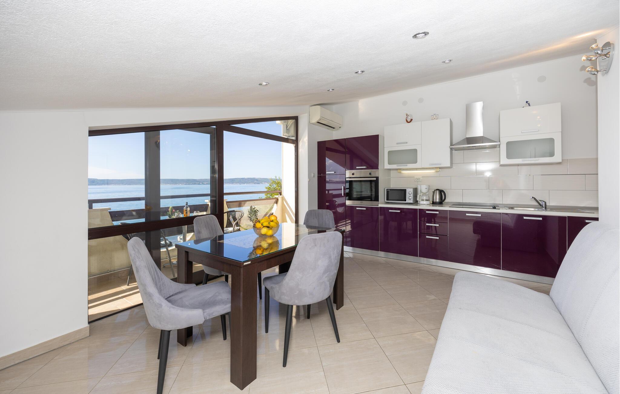 Unmittelbar an einem schönen Kiesstrand gelegen befinden sich diese Ferienwohnungen. CDE497 befindet sich auf der 3. Etage mit der mind. Deckenhöhe von 140 cm. Sie ist komfortabel und geschmackvoll eingerichtet mit einem tollen Panoramablick von der Terrasse. Die einfach eingerichtete Ferienwohnung CDE498 besteht aus zwei Wohneinheiten mit gemeinsamer Terrasse. CDF616 im Erdgeschoss besitzt Terrasse und Aussicht aufs Meer. Eine Wohneinheit ist zweistöckig und mit Innentreppen verbunden. Über Außentreppen erreichen Sie die zweite Wohneinheit auf der zweiten Etage. Gleich neben dem Haus verläuft die schöne Promenade, an der Sie abends gemütlich am Meer entlang spazieren können. Besuchen Sie die historischen Städte Trogir und Split.