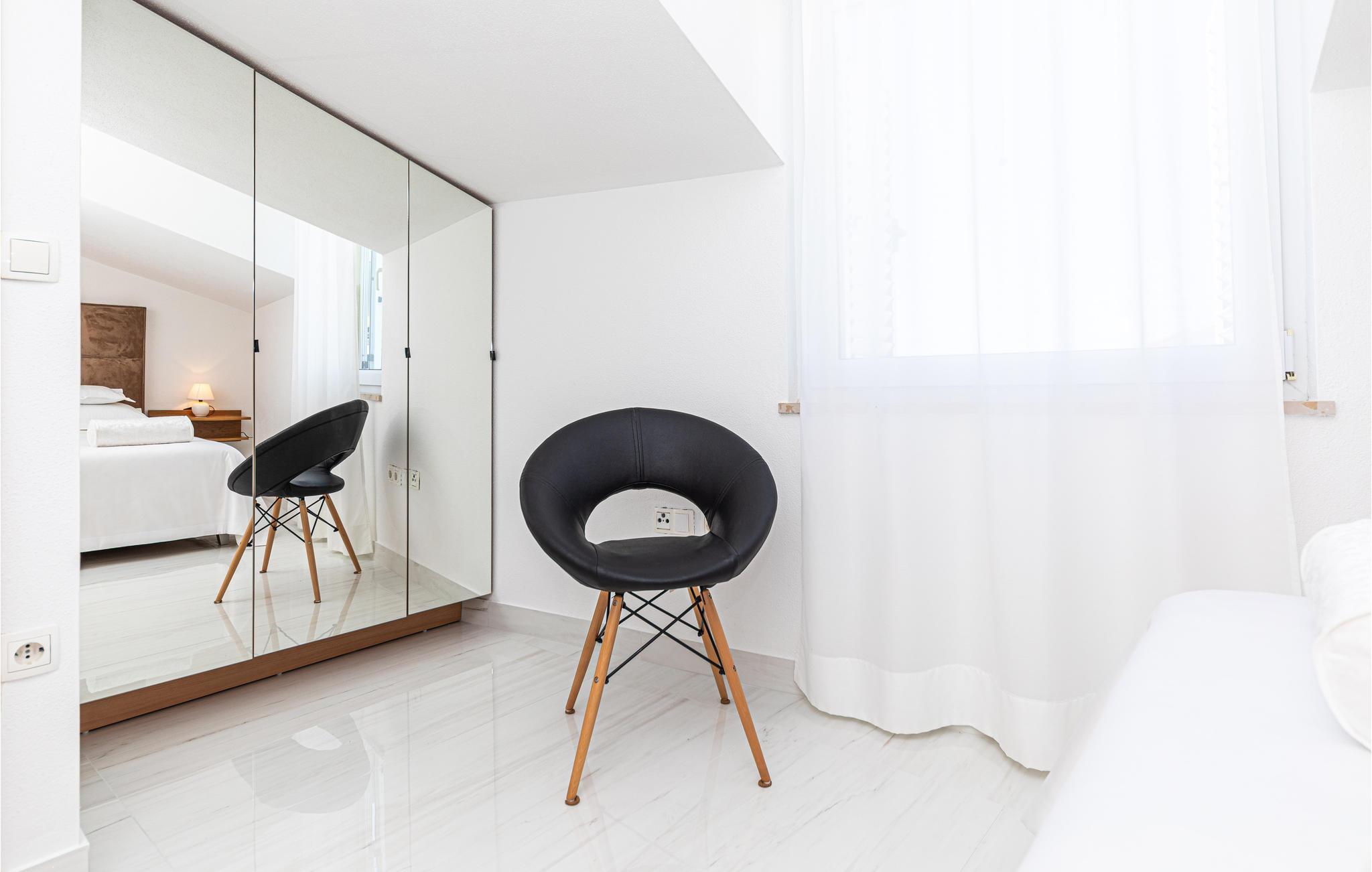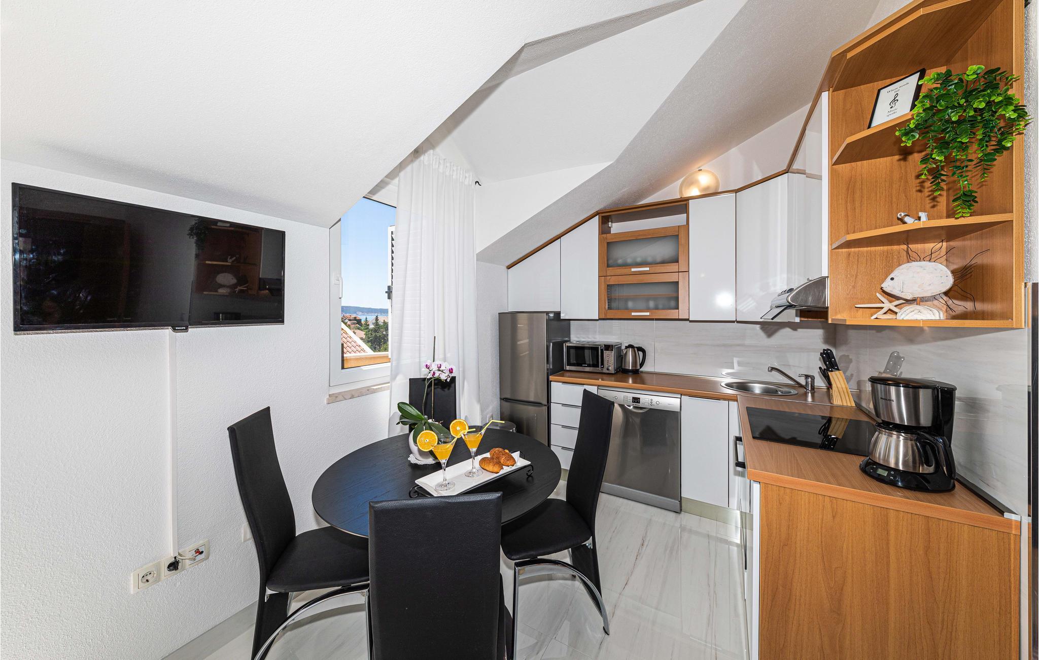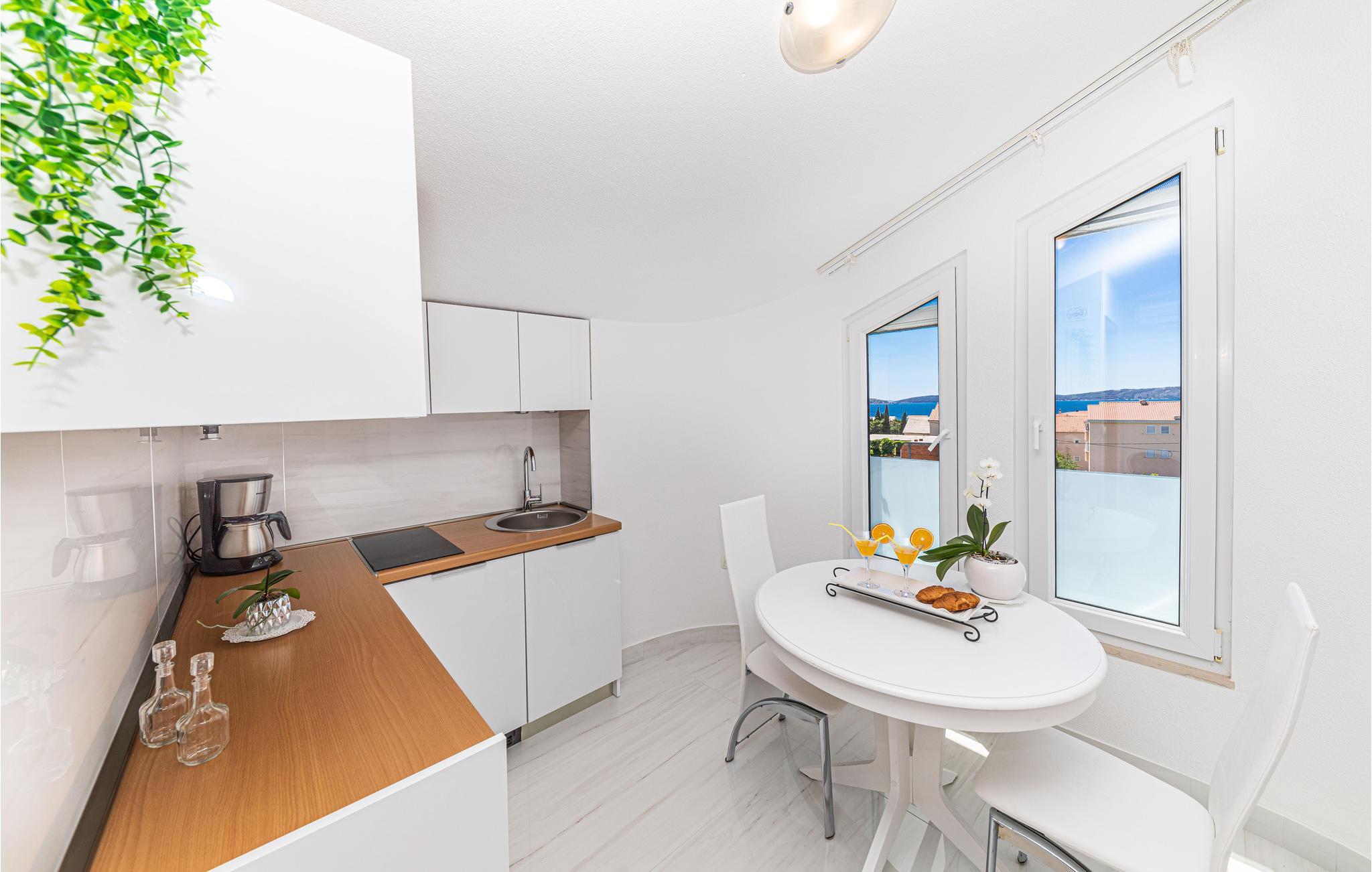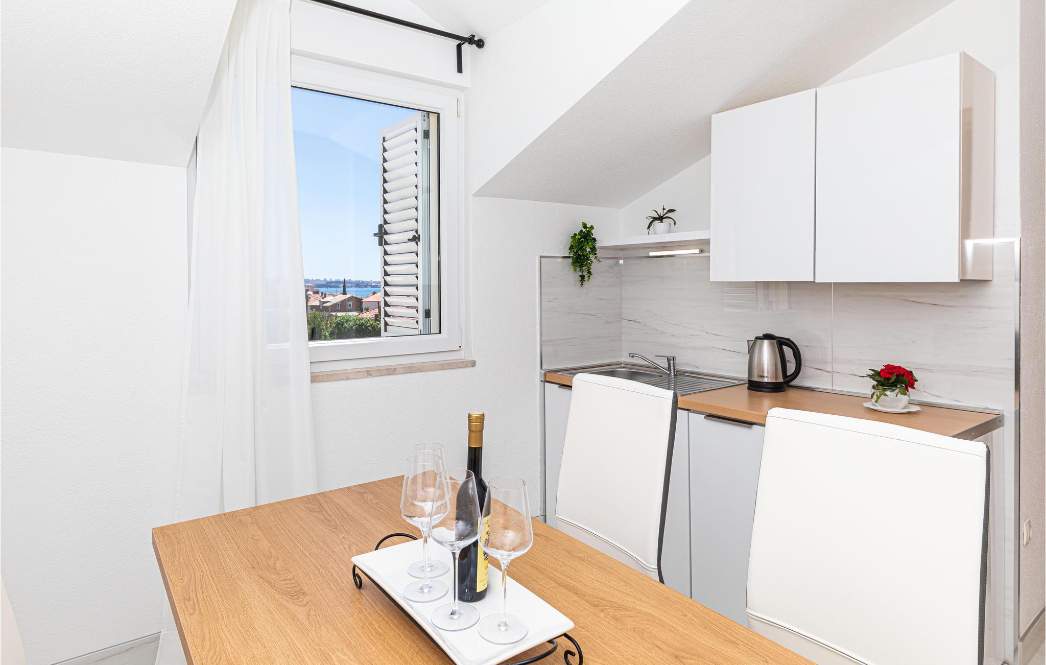 Diese schön eingerichtete Ferienwohnung liegt auf der zweiten Etage eines Privathauses und ist das einzige Objekt im Haus, das für Touristenzwecke vermietet wird. Sie besteht aus zwei Wohneinheiten, die durch einen Flur verbunden sind. Eine davon ist das Schlafzimmer 3, welches ein Studioapartment mit kleiner Küche und eigenem Bad ist. Die Mindestdeckenhöhe beträgt 170 cm. Im Erdgeschoß steht Ihnen die Terrasse mit Grill zur Verfügung. Genießen Sie die Sonne und das Meer am nahegelegenen Strand, den Sie in wenigen Gehminuten erreichen. Besuchen Sie die kulturreichen Städte Trogir und Split.