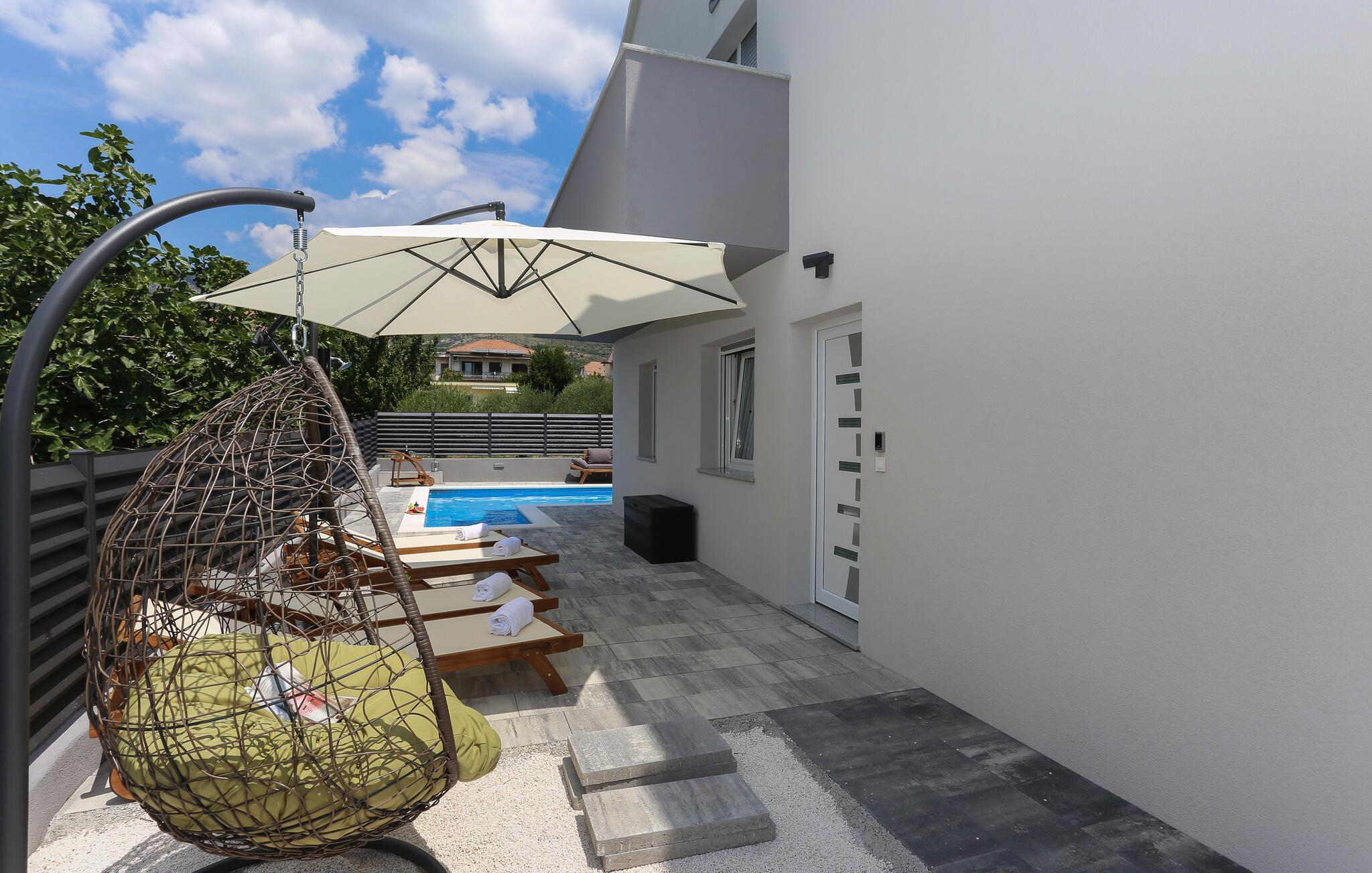 Erholen Sie sich in dieser stilvollen Ferienwohnung mit Pool und Meerblick.