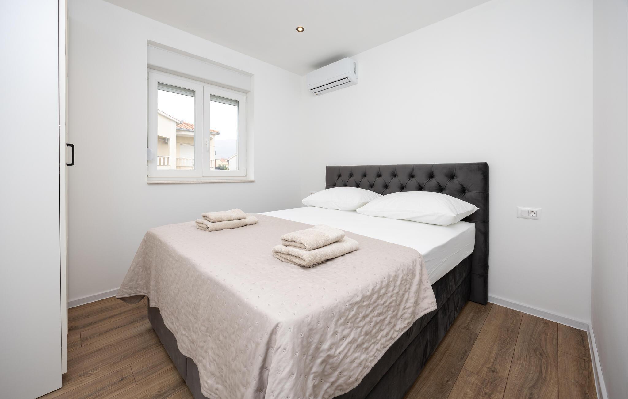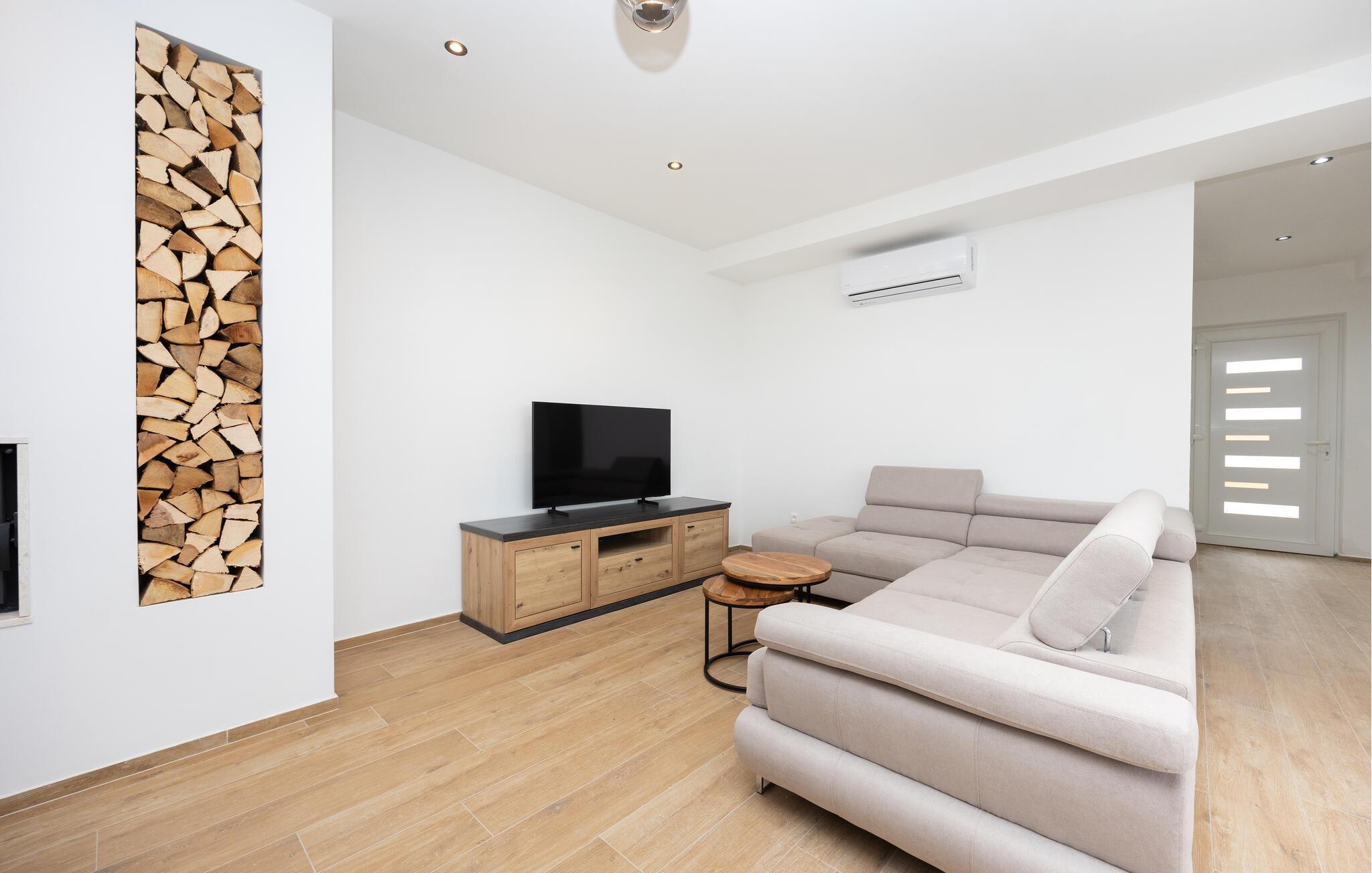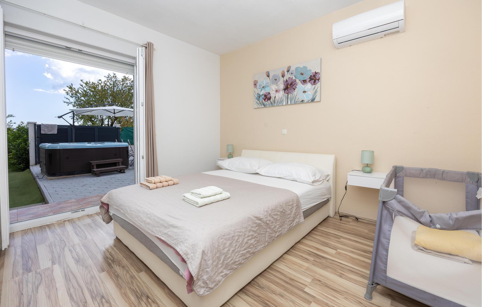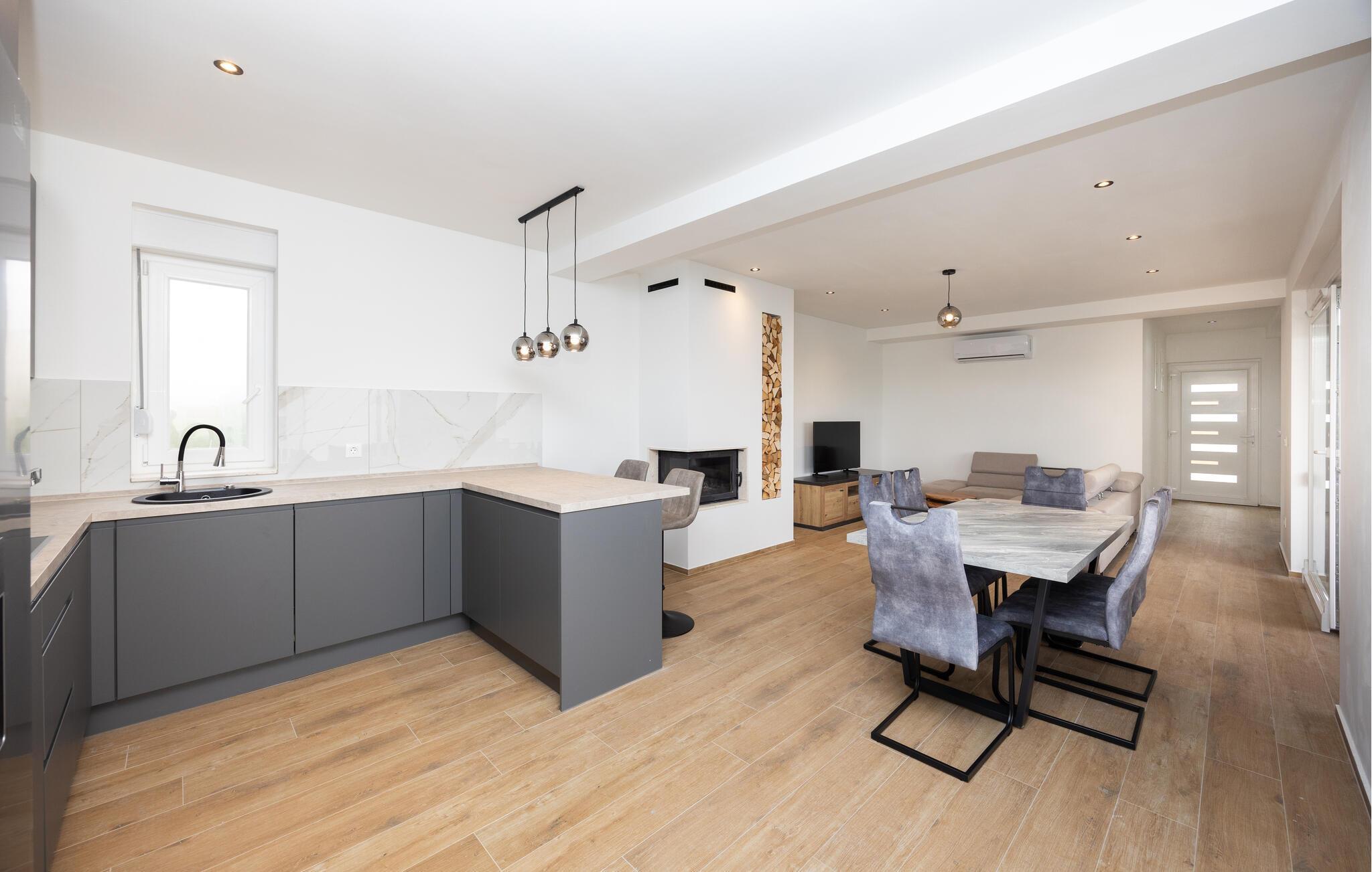 Das Ferienhaus mit Pool und geschmackvollem Interieur, sowie einem geräumigen Exterieur von 1200 m² liegt in einer idyllischen Umgebung, nicht weit von Trogir (6 km) und Split (18 km). Besuchen Sie in der Nähe die Krka Wasserfälle, den Wallfahrtsort Medugorje, den Blaue See und die Ruinenstadt Salona. Der Bungalow besteht aus einer Wohnküche, drei Schlafzimmern, drei Bädern und zusätzlichem WC. Entspannen Sie auf den Terrassen und nutzen Sie den Grillbereich, der im Sommer unabkömmlich ist. Erfrischen können Sie sich im Pool vor dem Haus oder im Meer, etwa 400 m entfernt. Das umzäunte Grundstück ermöglicht den Kindern ein unbeschwertes Spielen.