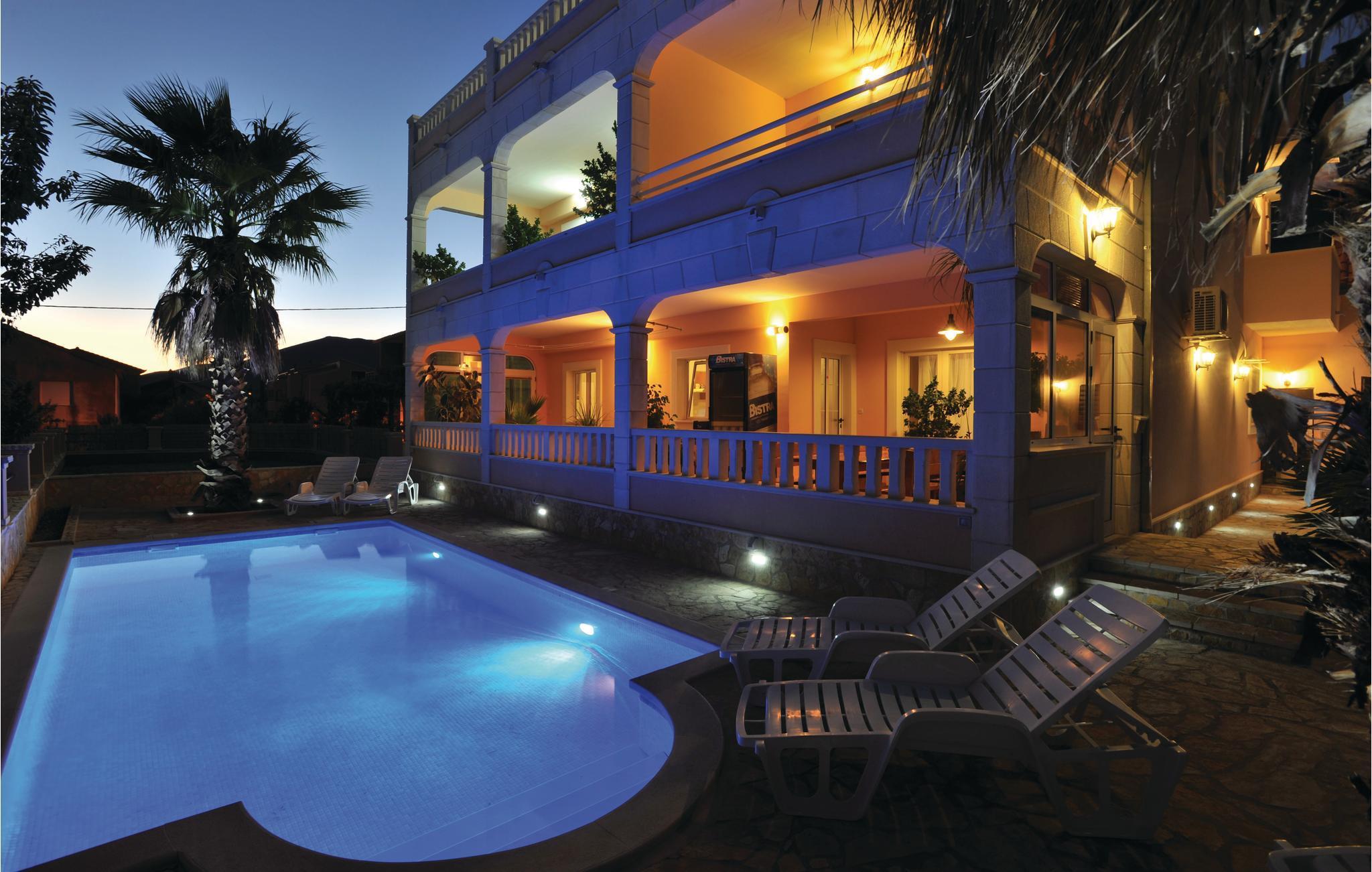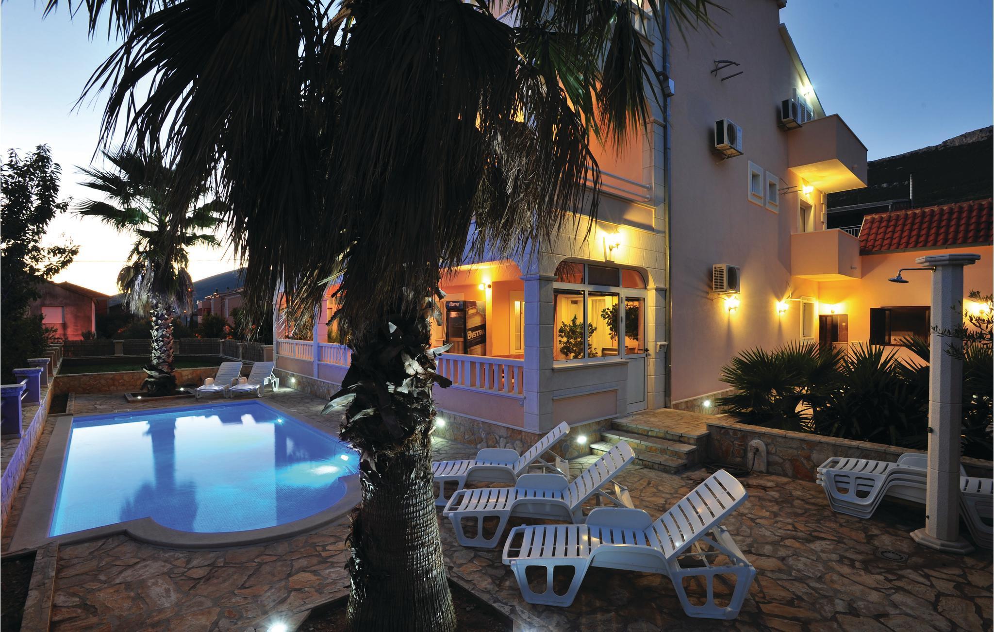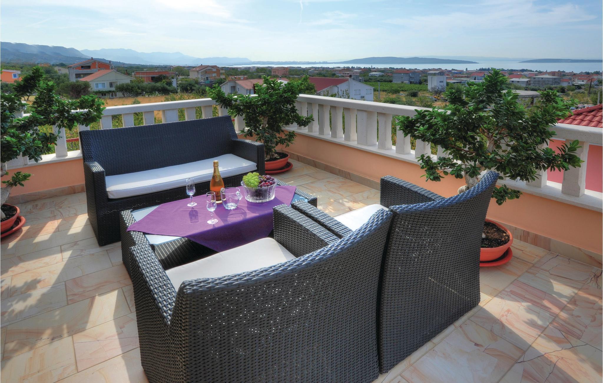 Verbringen Sie Ihren Urlaub in diesem geräumigen Ferienhaus, welches sich in bewohnter, aber ruhiger Lage befindet. Das Ferienhaus mit Pool eignet sich für einen Urlaub mit Freunden oder einer Großfamilie. Es besteht aus drei voneinander getrennten Wohneinheiten, die sich über drei Etagen erstrecken und durch Innentreppen miteinander verbunden sind. Von den Balkons der oberen Stockwerke bietet sich Ihnen ein schöner Blick auf die Küste von Split bis Trogir. Erfrischung können Sie sich während der heißen Sommertage am Swimmingpool holen. Das Ferienhaus ist einfach und funktionell eingerichtet. Im Dachgeschoss beträgt die niedrigste Deckenhöhe 220 cm. Genießen Sie die Abende beim Grillen auf der überdachten Terrasse hinter dem Haus. Nutzen Sie die Möglichkeit und besichtigen Sie die bekannten Städte Split und Trogir, die zahlreiche Sehenswürdigkeiten und vielseitige Unterhaltungsmöglichkeiten bieten.
