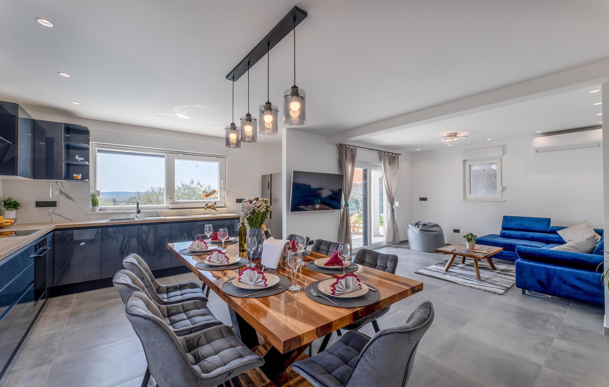 Packen Sie die Koffer und freuen Sie sich auf eine unvergessliche Auszeit in diesem komfortablen Ferienhaus nahe der sonnenverwöhnten Adriaküste. Im Inneren erwartet Sie ein helles und großzügiges Ambiente und eine offene Küche, in der Sie gemeinsam kulinarische Highlights zaubern können. Machen Sie es sich nach stilvollen Mahlzeiten auf dem bequemen Sofa gemütlich und streamen Sie Ihre Lieblingsserie.