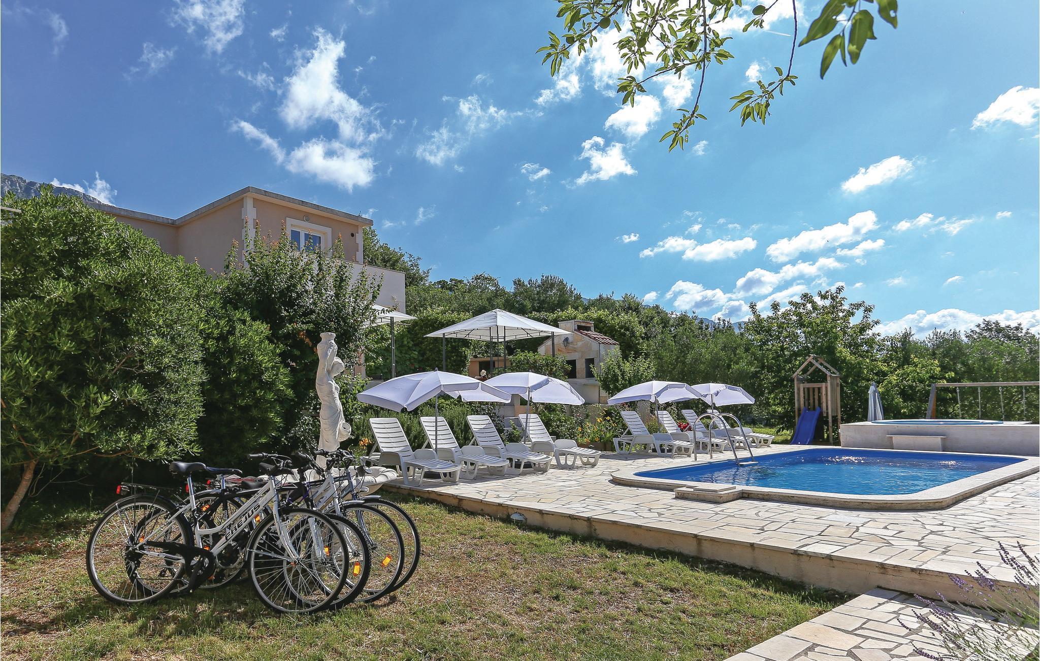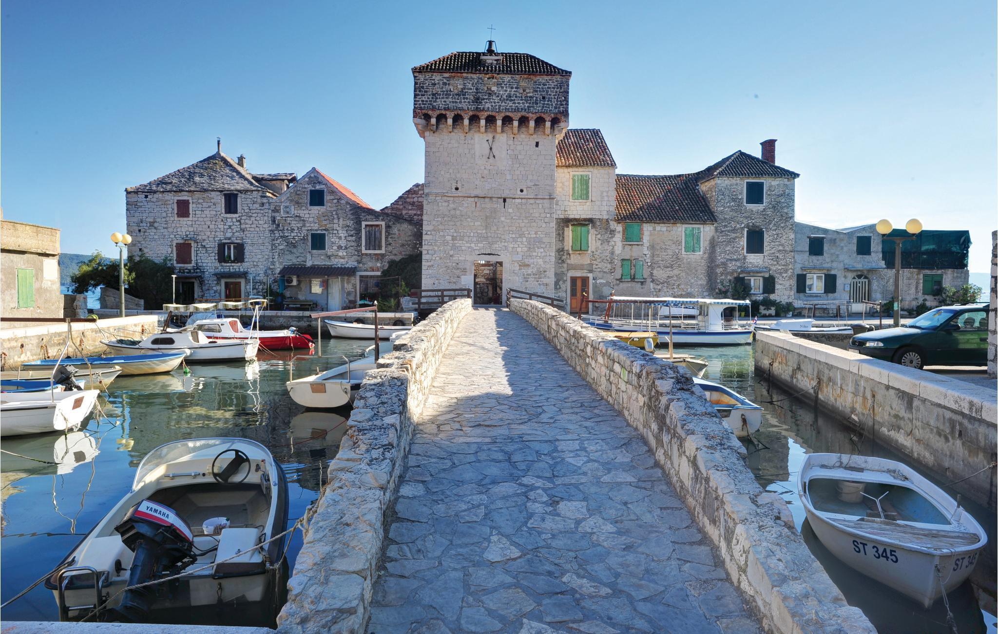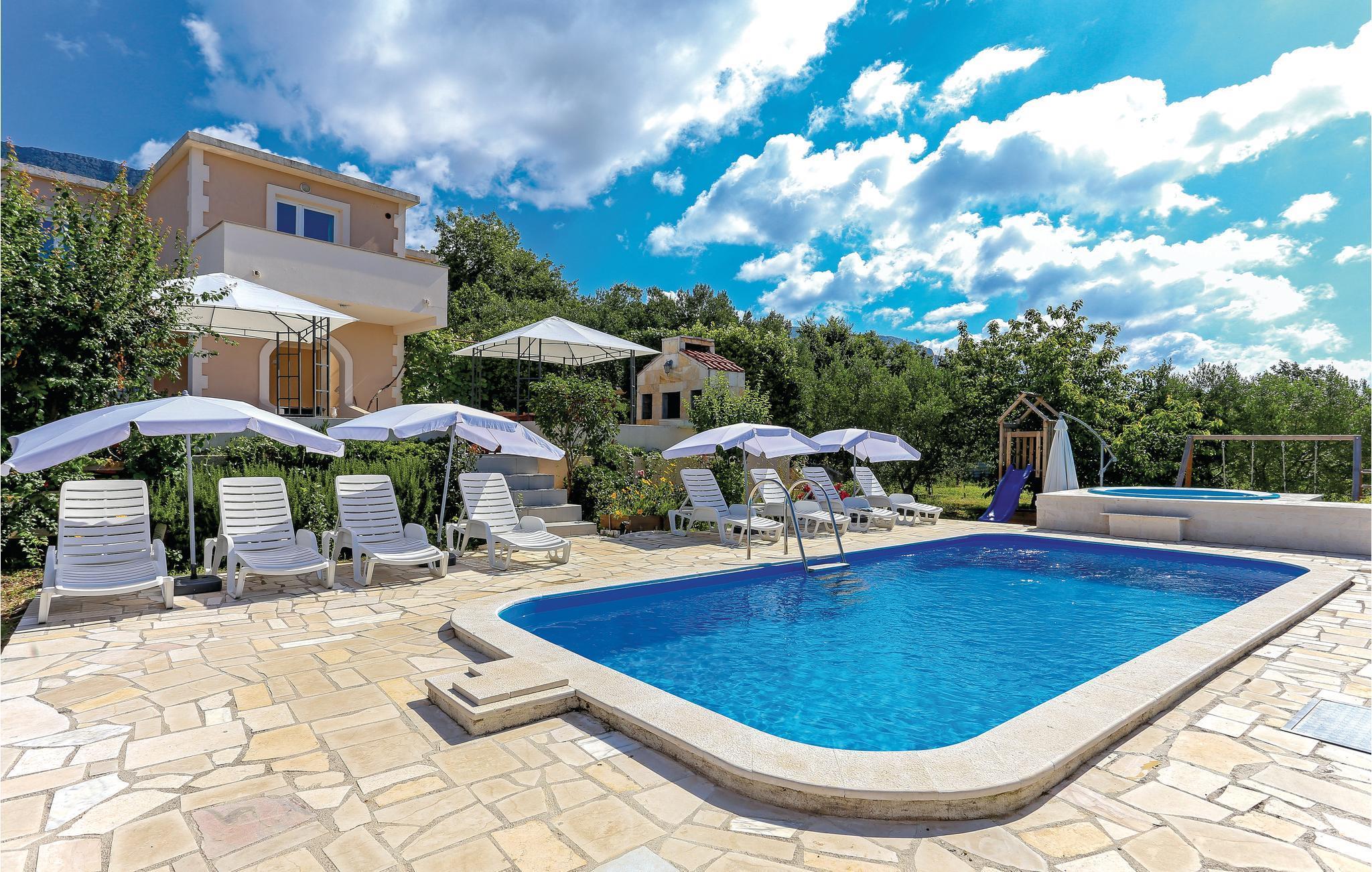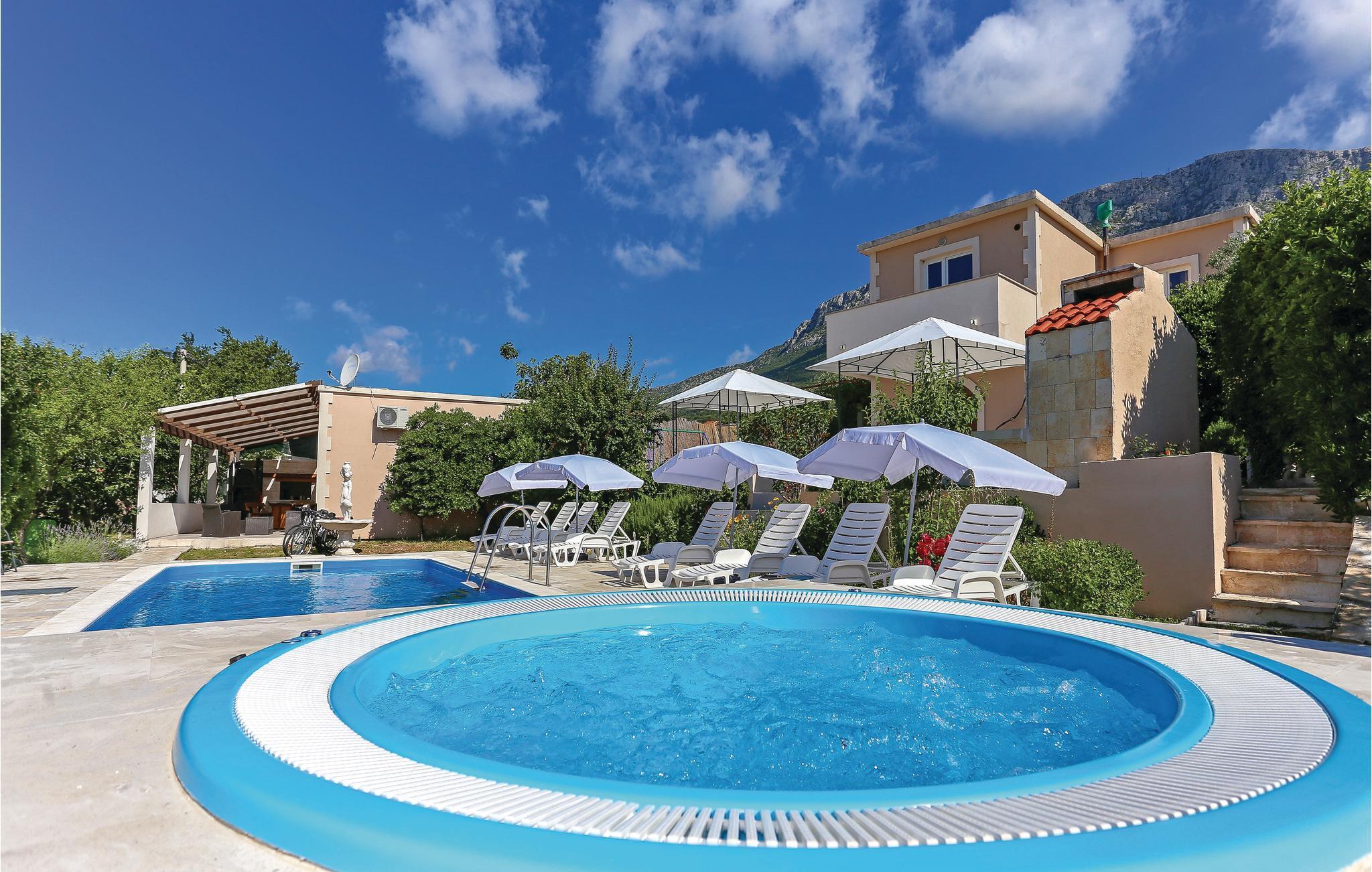 Unterkunft an 5000 m² Grundstück, einst eine römische Villa, mit Pool und Whirlpool von Obstbäumen eingerahmt. Hier werden Sie entspannen und Ihre Privatsphäre haben. Es besteht aus zwei Einheiten die durch eine Außentreppe miteinander verbunden sind. In beiden Einheiten liegen je zwei Schlafzimmer, Wohnzimmer, Küche und Badezimmer. Fernab vom Stadtgetümmel werden Sie den herrlichen Ausblick auf die Bucht von Kastel sicherlich genießen. Für aktive Urlauber stehen ein Minifußballfeld, Badminton, Billard sowie für Kinder Rutsche und Schaukel zur Verfügung. Auf der großen Poolterrasse mit Whirlpool werden Sie sich herrlich erfrischen und daneben am Grill leckere Gerichte zubereiten. Auf dem Grundstück befindet sich eine Taverne mit Kamin, in der Sie verschiedene Gerichte zubereiten können.
