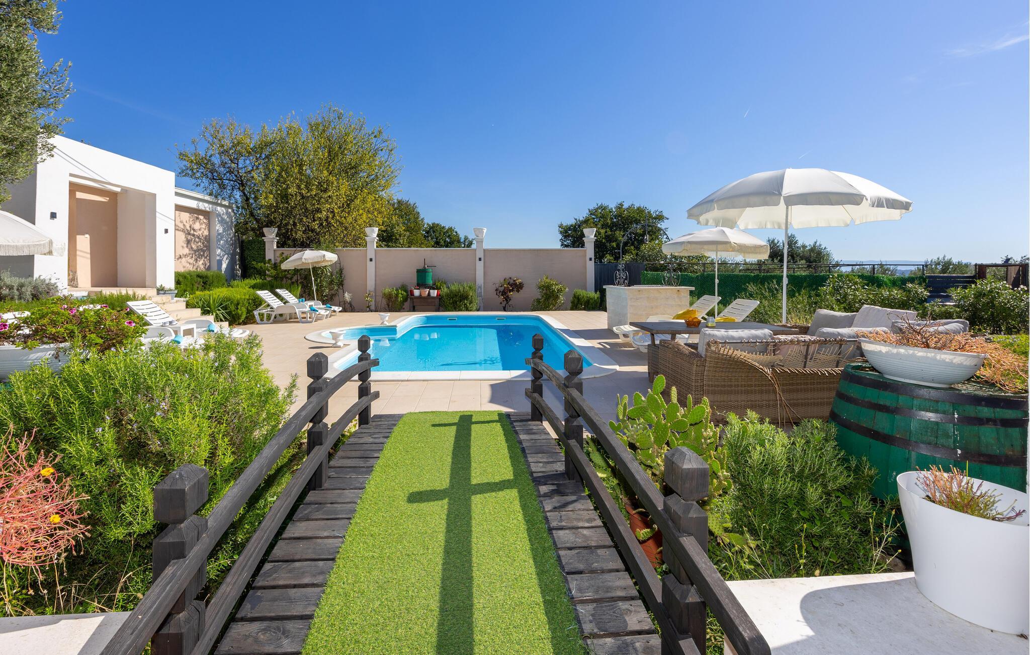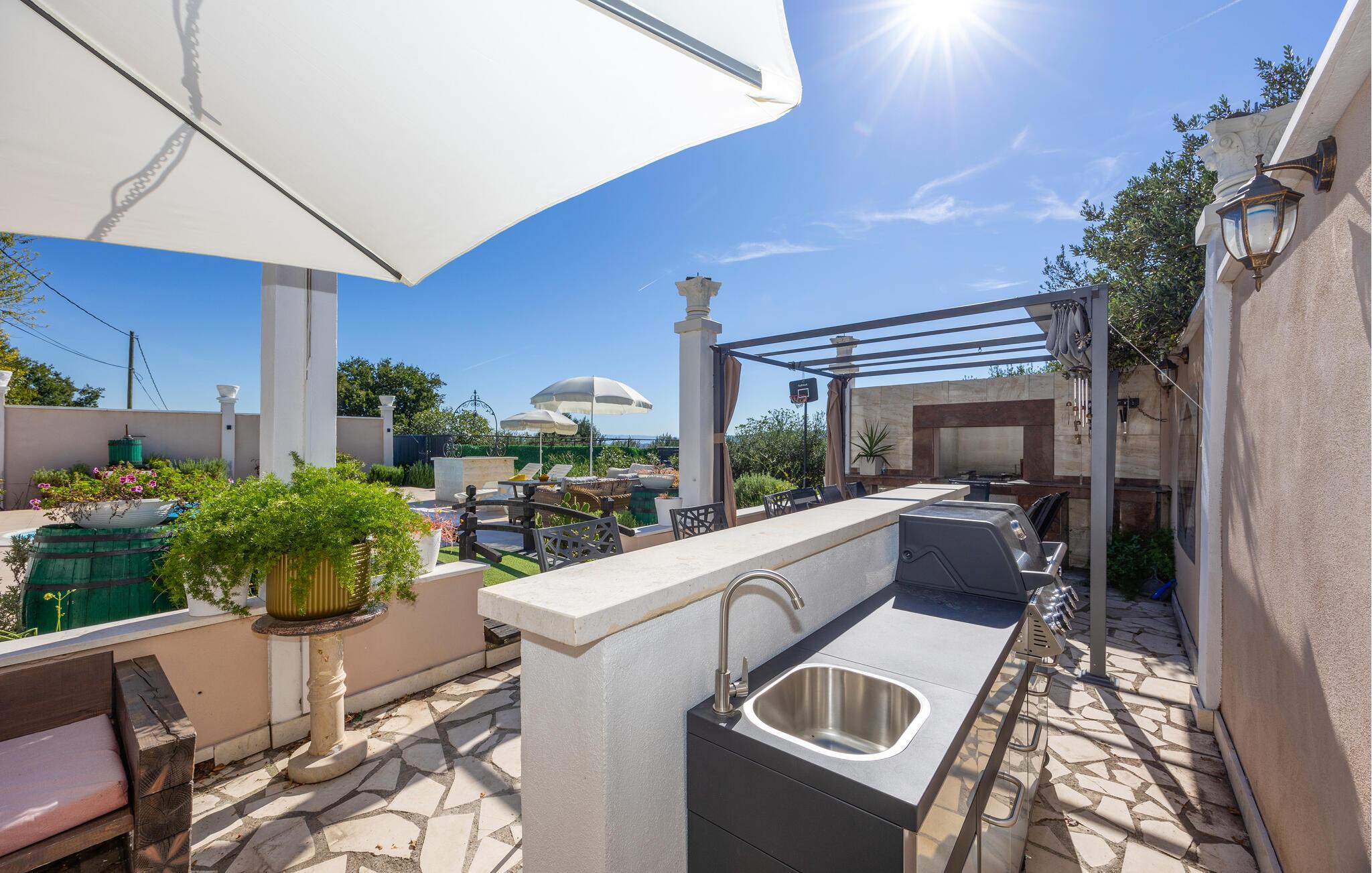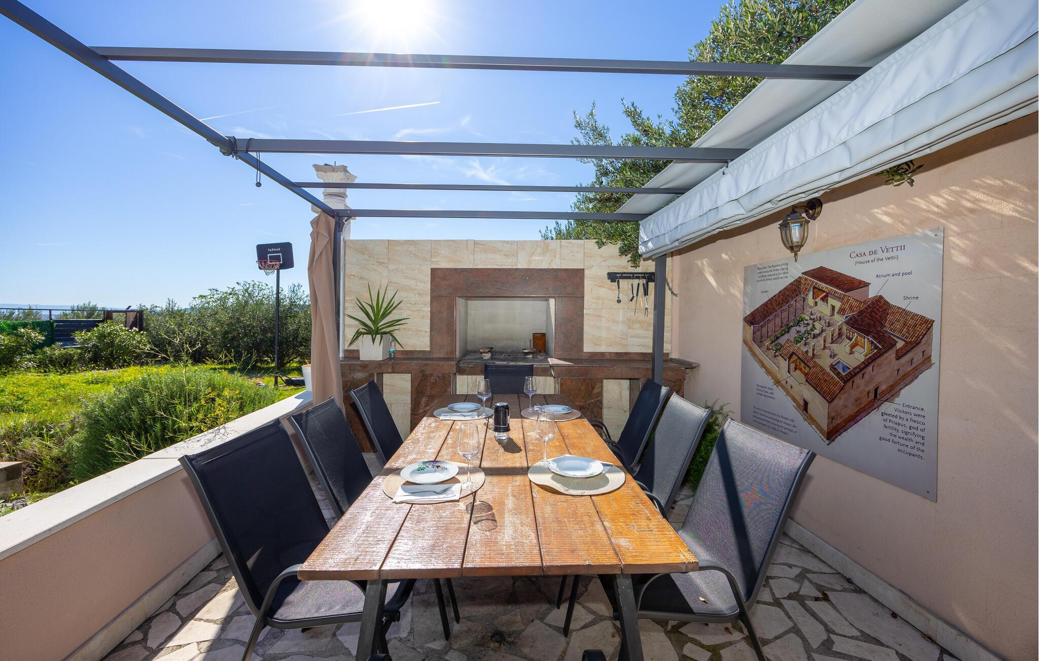 Dieses schöne Haus liegt in einer ruhigen Wohngegend und eignet sich für alle diejenigen, die einen ruhigen Urlaub in natürlicher Umgebung genießen möchten. Das Haus besteht aus einer Küche mit Esszimmer, vier Schlafzimmern, drei Badezimmern und einer zusätzlichen Toilette. Es ist sehr modern und komfortabel eingerichtet. Das Haus liegt in einer ruhigen Gegend und bietet einen schönen Blick auf die Bucht von Kaštela. Besuchen Sie die nahe gelegenen Städte Trogir und Split, die Sie mit einem reichen gastronomischen Angebot, vielen kulturellen und historischen Sehenswürdigkeiten und zahlreichen Veranstaltungen in den Sommermonaten begeistern werden. Dieses Haus wurde im Stil der römischen "Villa Rustica" erbaut, da es im archäologischen Gebiet der ehemaligen römischen Villa liegt.