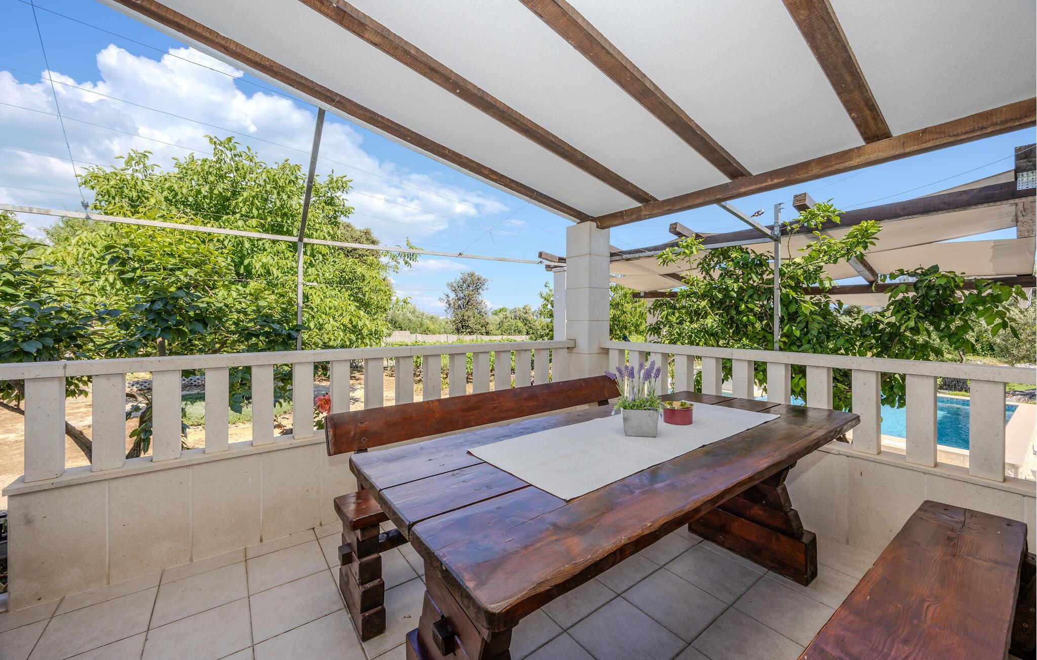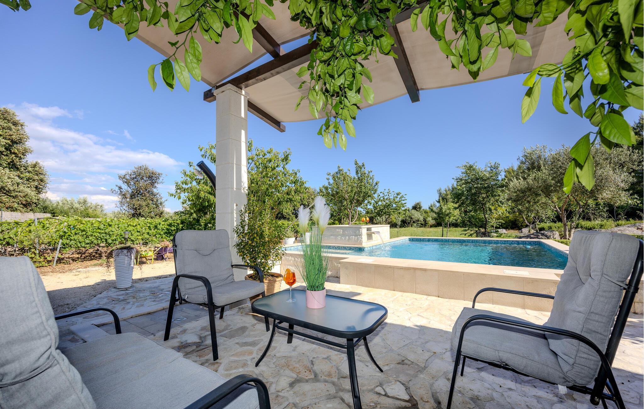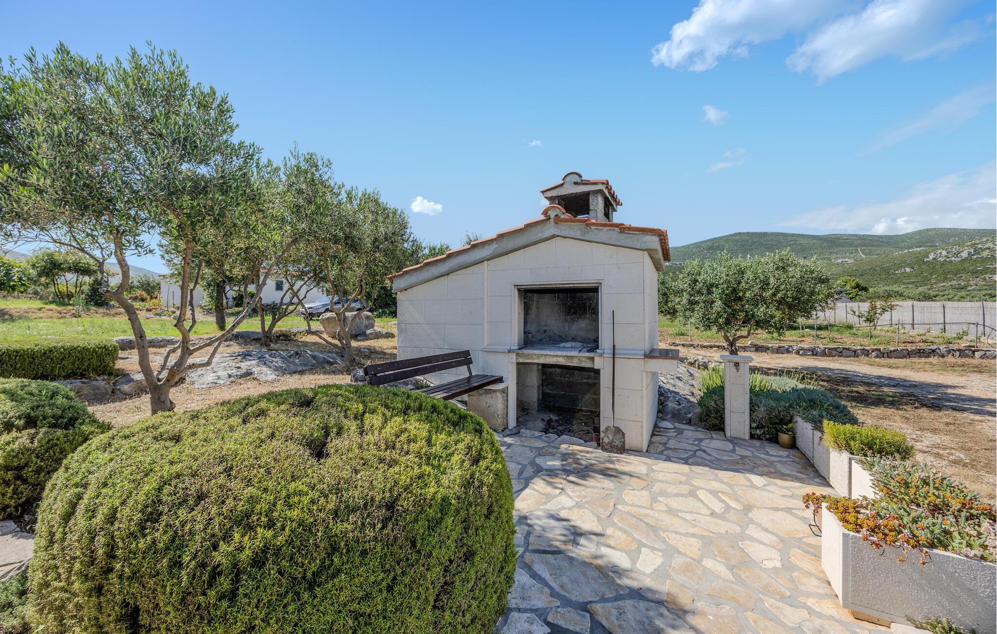 Dieses sympathische Ferienhaus mit Pool befindet sich in der unberührten Natur und weit weg von der Hektik des Alltags und dem Lärm der Stadt. Es befindet sich auf einem 7.800 m2 Grundstück, wo es einen Obstgarten gibt, dessen Früchte Ihnen zur Verfügung stehen. Erfrischen Sie sich im Pool vor dem Haus oder entspannen Sie sich beim Grillen und Zusammensitzen auf der schönen überdachten Terrasse. Die letzten 200 m zum Haus ist eine Schotterstraße. Die historische Stadt Trogir bietet eine Vielzahl von Sehenswürdigkeiten und Unterhaltungangeboten für Jung und Alt. Einen schönen Kiesstrand finden Sie 2,1 km vom Ferienhaus entfernt.