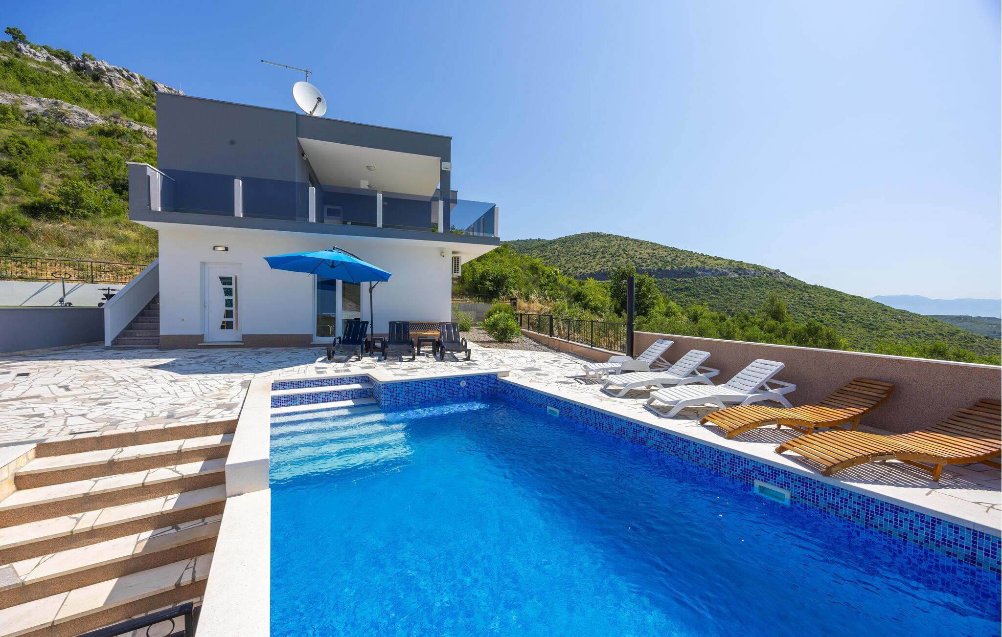 Die Terrasse des Ferienhauses bietet einen schönen Panoramablick auf das Meer. Vor dem Haus befindet sich auch ein Pool, der an heißen Tagen Erfrischung bietet. Der Garten ist eingezäunt, so dass Sie hier absolute Privatsphäre genießen.