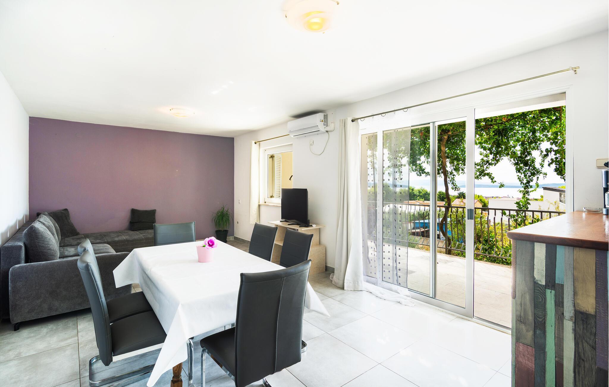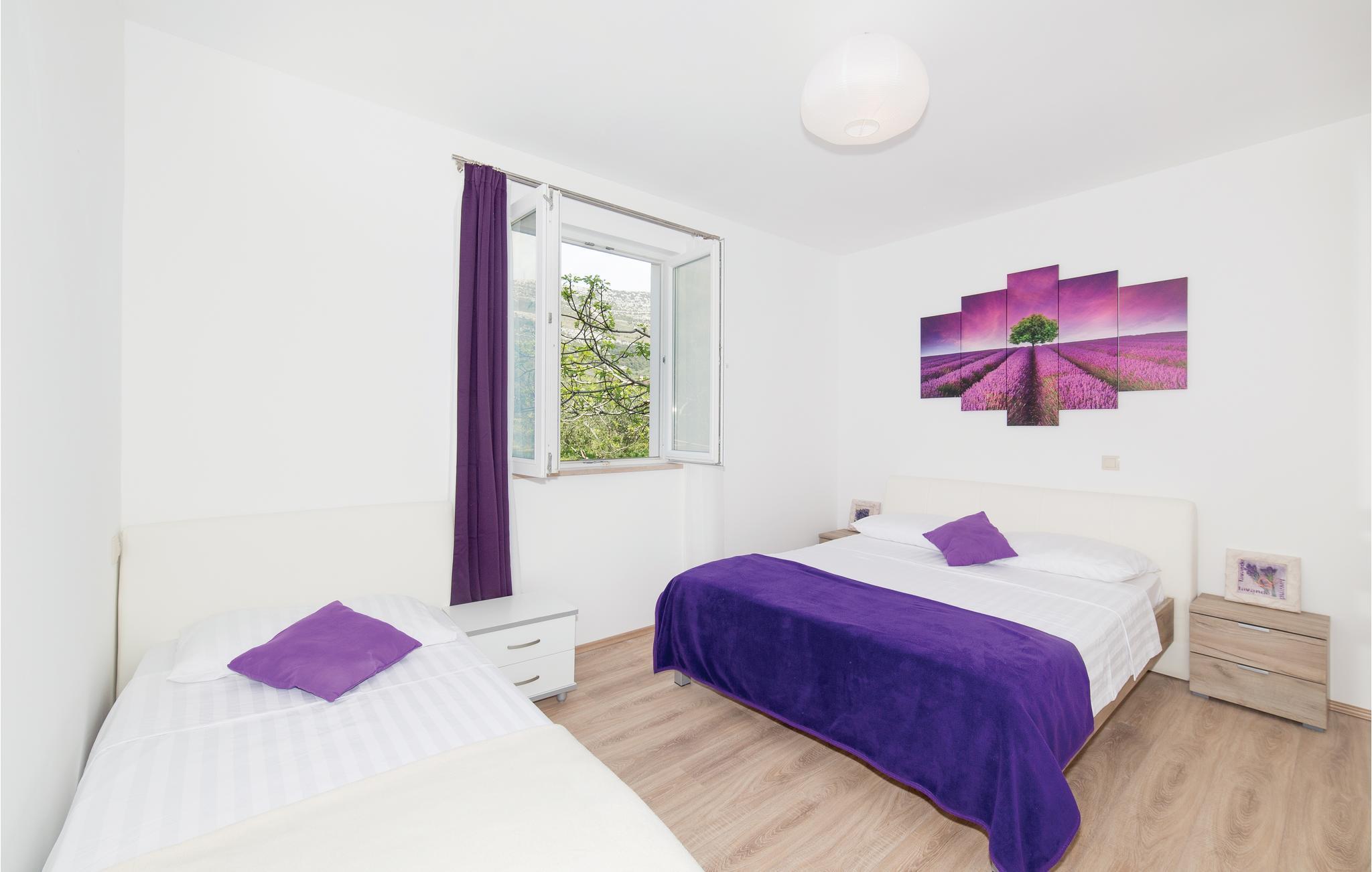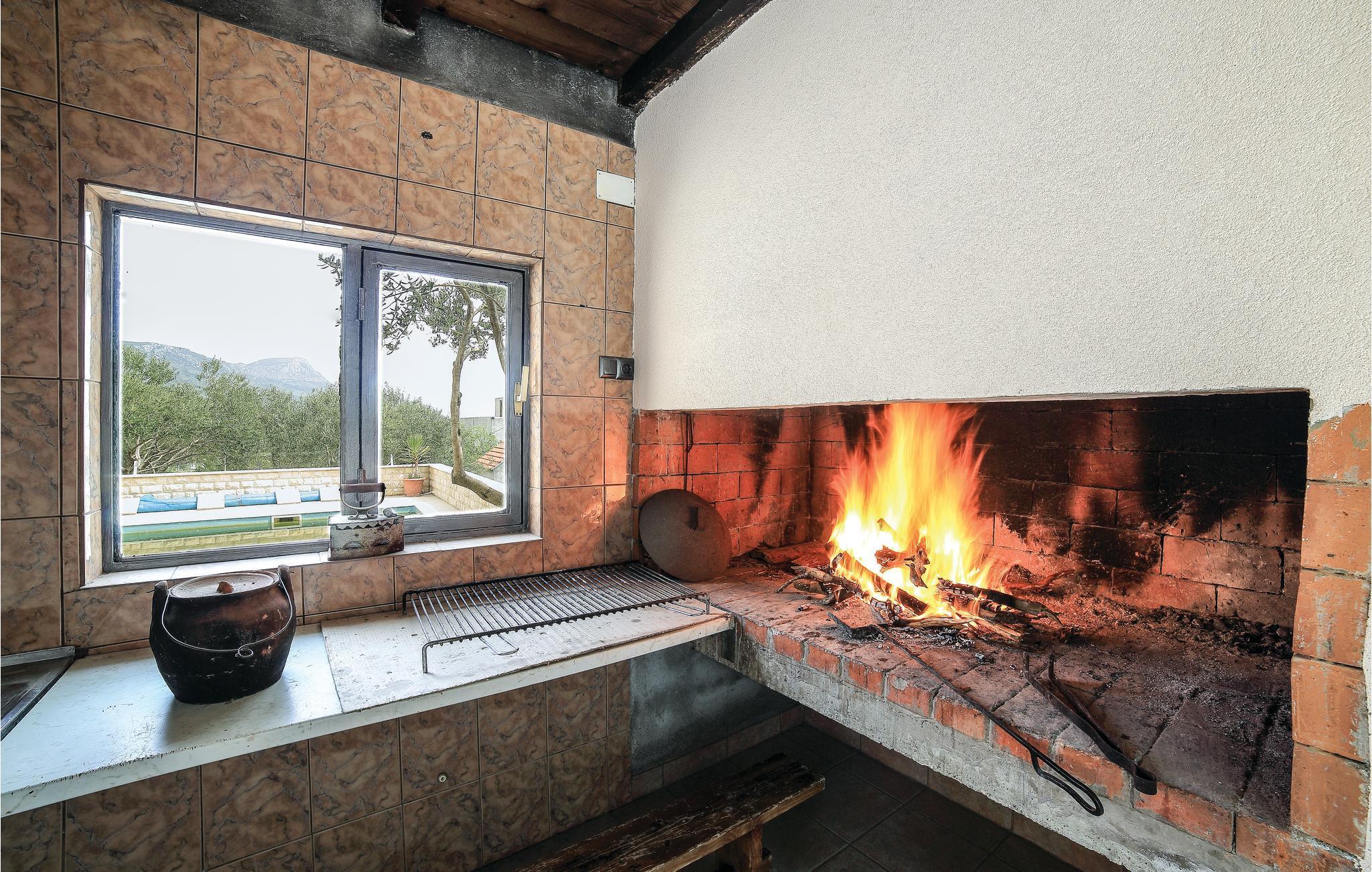 Dieses Ferienhaus mit einem, bis in den Oktober hinein, verfügbaren Außenpool befindet sich in ruhigerer Gegend und ist vom Grün der Natur umgeben. Es besteht aus zwei Etagen. Im Erdgeschoß liegen Schlafzimmer, zwei Bäder (eines nur Zugang von außen) und ein Freizeitraum. Eine Außentreppe führt Sie in den ersten Stock, mit drei Schlafzimmern, WC und Badezimmer, sowie Wohnzimmer mit Küche und Ausgang auf den Balkon. Im Hof finden Sie den beheizten Pool, Platz zum Sonnen, auch Grill und Spielgeräte für Kinder. Besuchen Sie alle sieben Kastelle: Sucurac, Kastel Gomilica, Kambelovac, Luksic, Stari, Kastel Novi und Stafilic. Diese Festungen wurden vor rund 500 Jahren zum Schutz vor Osmanen und Seeräubern gebaut und um jede hat sich ein kleiner Ort gebildet.