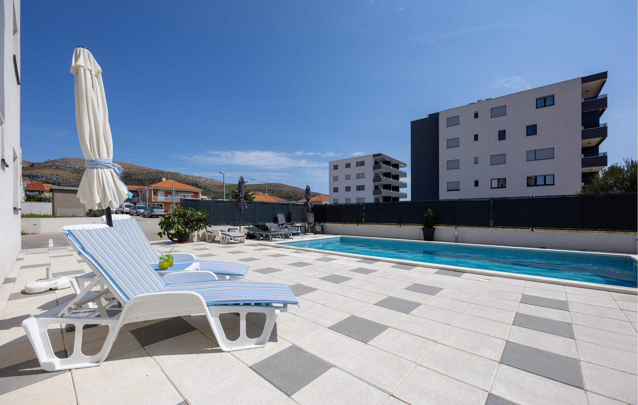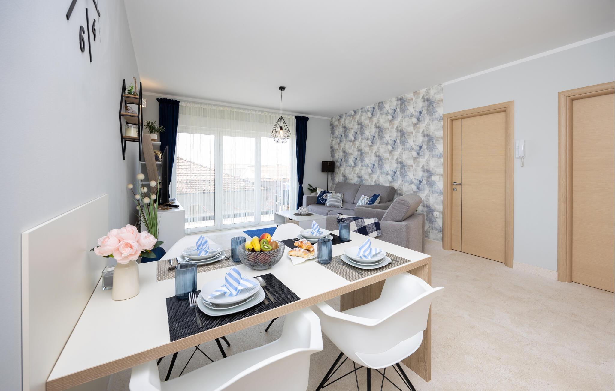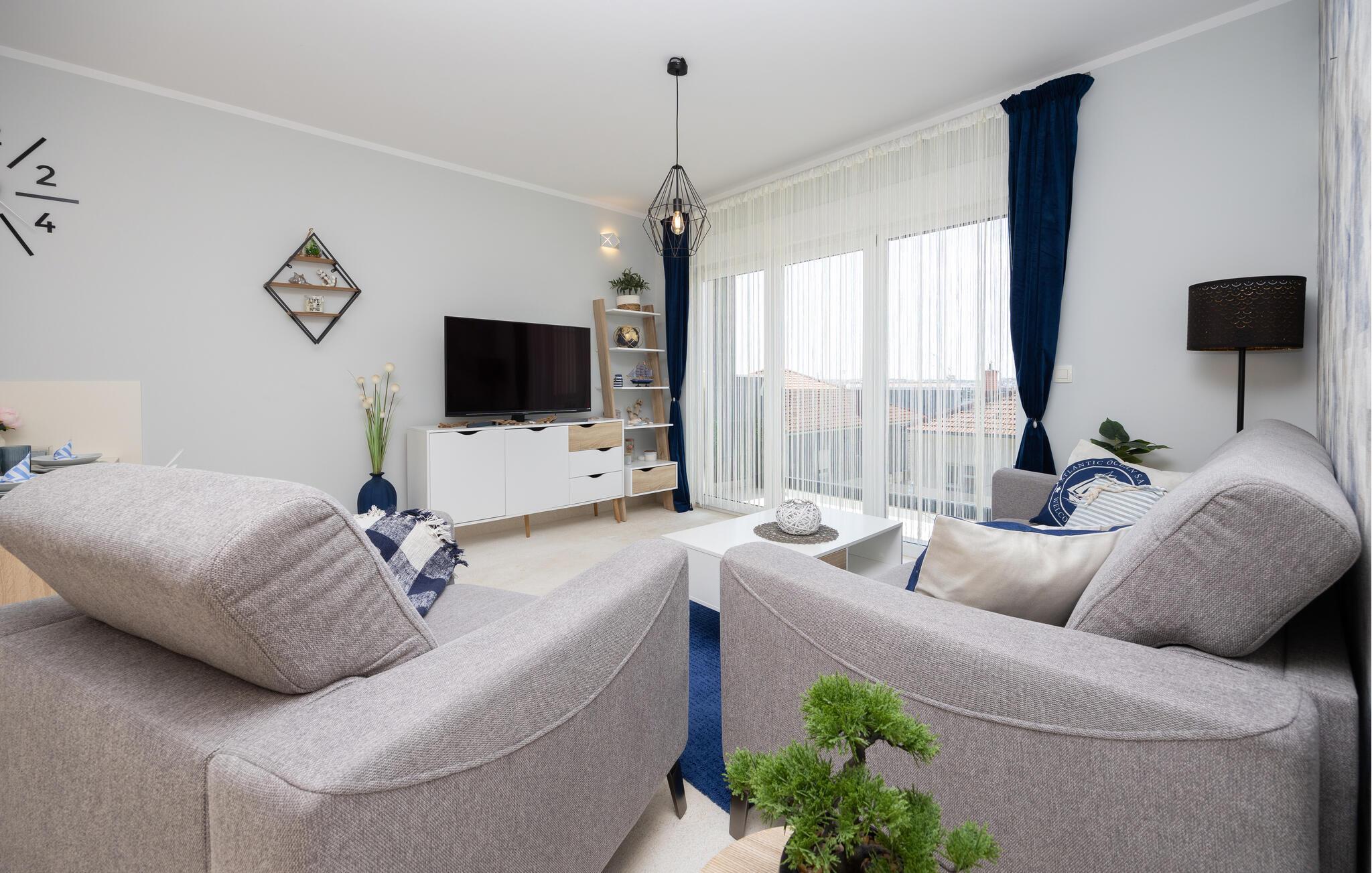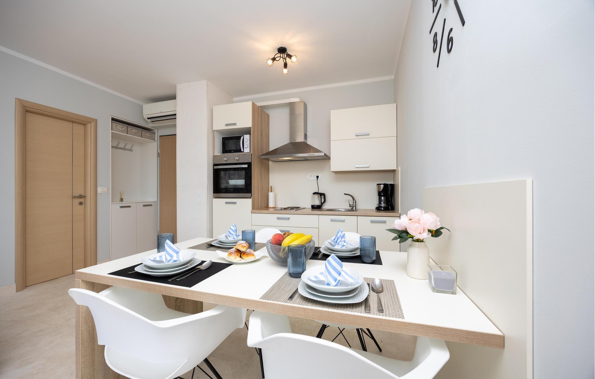 Reisen Sie mit Vorfreude nach Trogir, denn in dieser modernen Ferienwohnung erwartet Sie eine stilvolle Auszeit. Die geschmackvolle Einrichtung mit Liebe zum Detail sorgt für eine harmonische Atmosphäre, in der Sie sich sofort zuhause fühlen. Die klaren Linien und das durchdachte Design verleihen den Innenräumen eine besondere Eleganz. Gemeinsames Kochen in der gut ausgestatteten Küche oder Relaxen auf dem Sofa runden Ihre Urlaubstage ab.