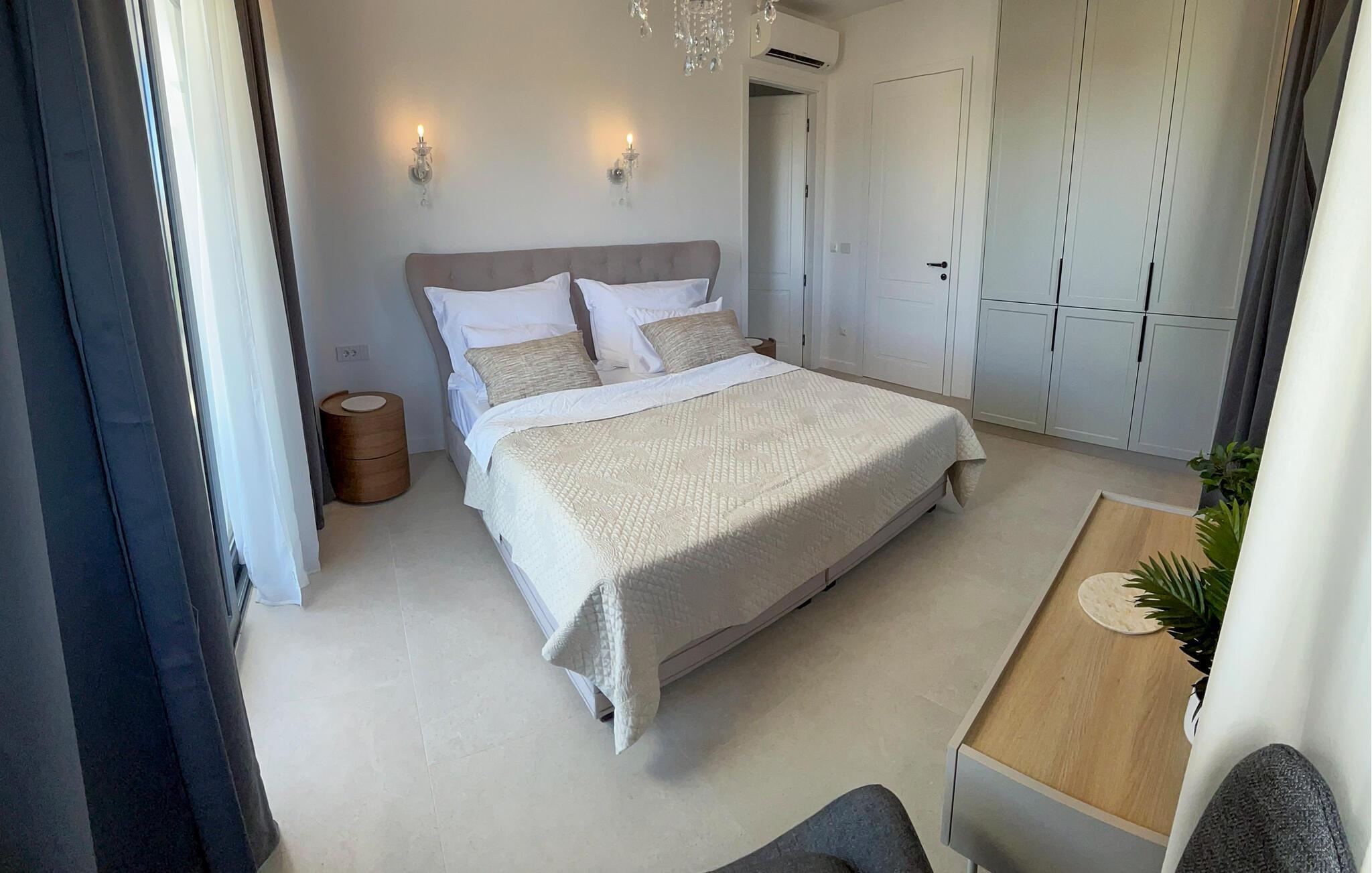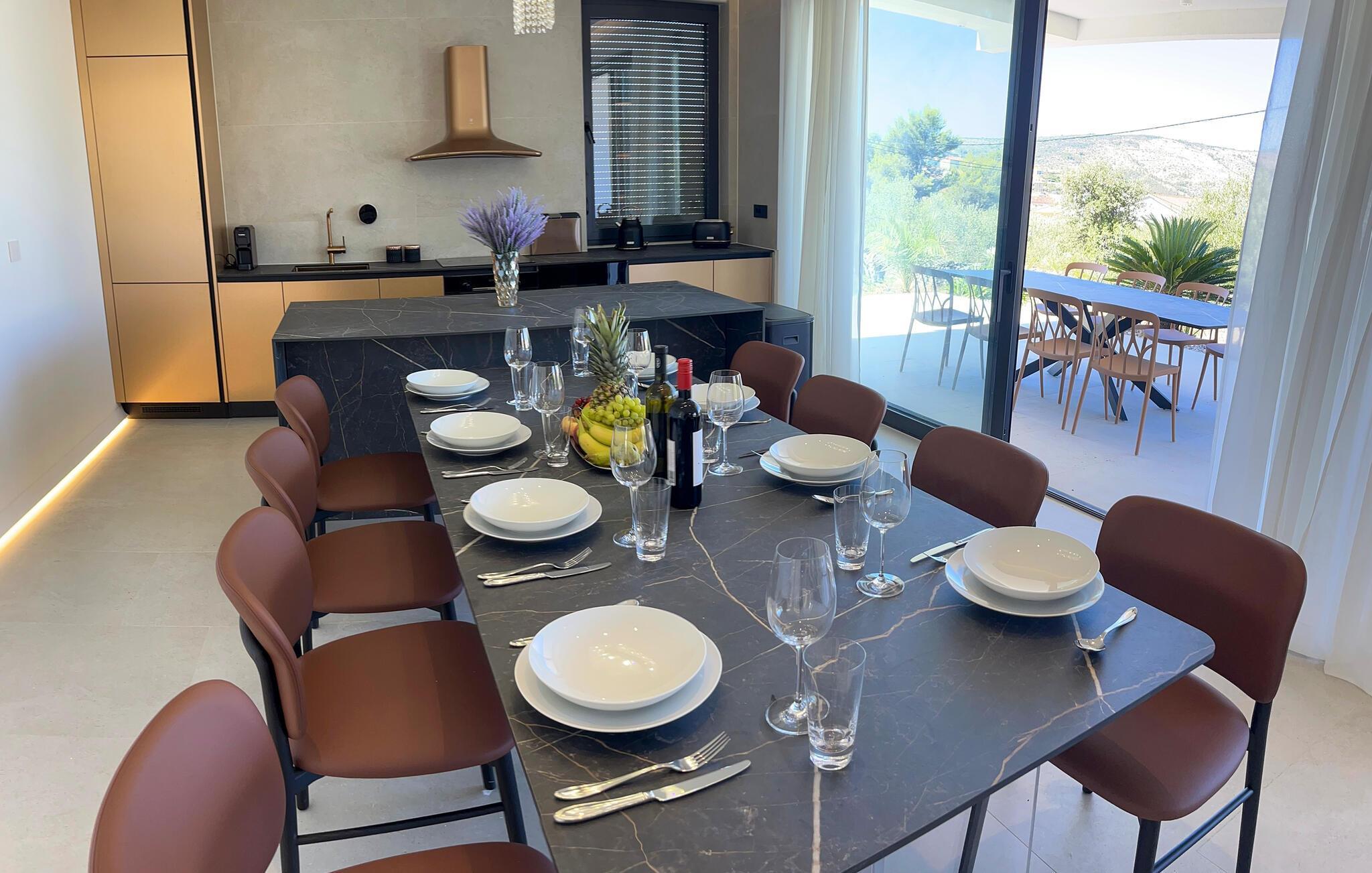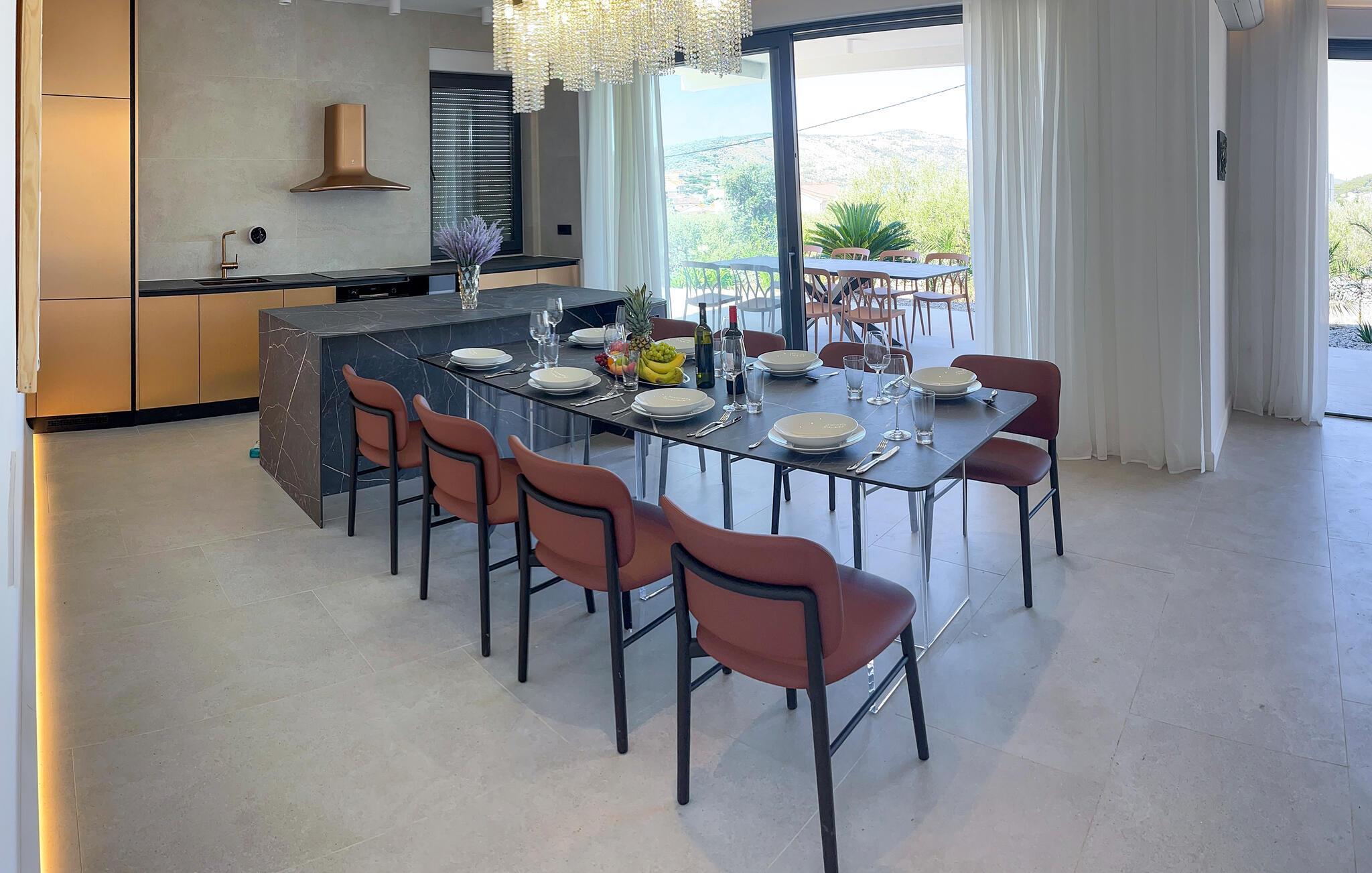 Dieses hochwertig ausgestattete Ferienhaus verwöhnt Sie mit einem geräumigen Interieur, das mit stilvollen Designermöbeln eingerichtet ist, und einem bezaubernden Blick auf die türkisfarbene Bucht. Lassen Sie sich zu kulinarischen Highlights verführen und genießen Sie harmonische Mahlzeiten am einladenden Esstisch. Plaudern Sie abends im gemütlichen Wohnzimmer oder entspannen Sie bei einem guten Film.